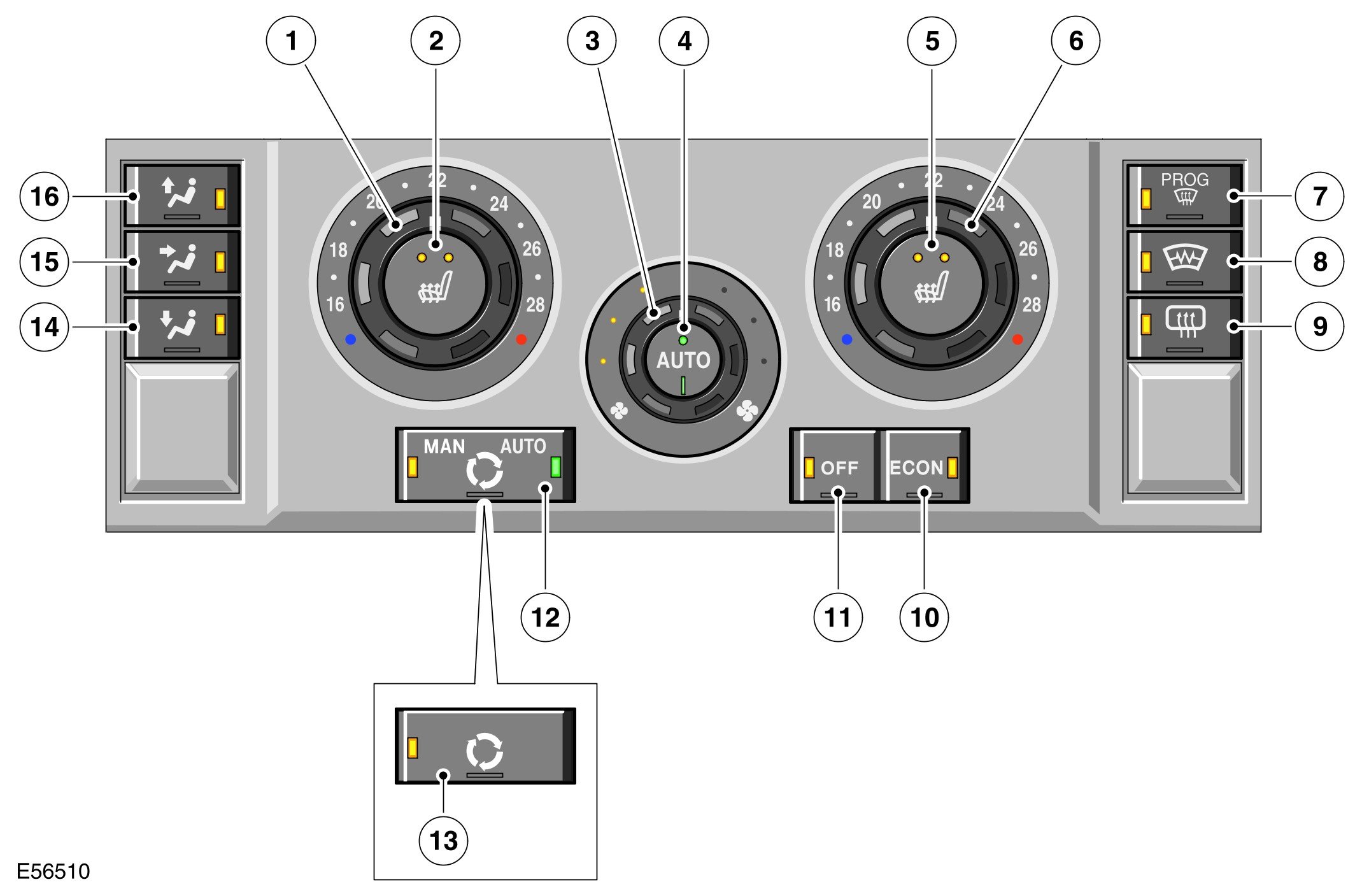 - Programmed Defrost Switch: Activates a program that automatically selects: inlet air to fresh air; distribution to screen only; blower to speed 5; rear screen heater on; windshield heater on (where fitted), A/C (air conditioning) system to automatic mode. An amber LED (light emitting diode) in the switch is illuminated while the defrost program is active.