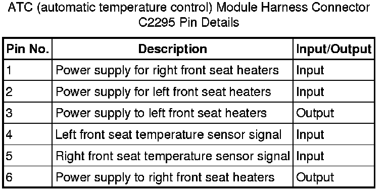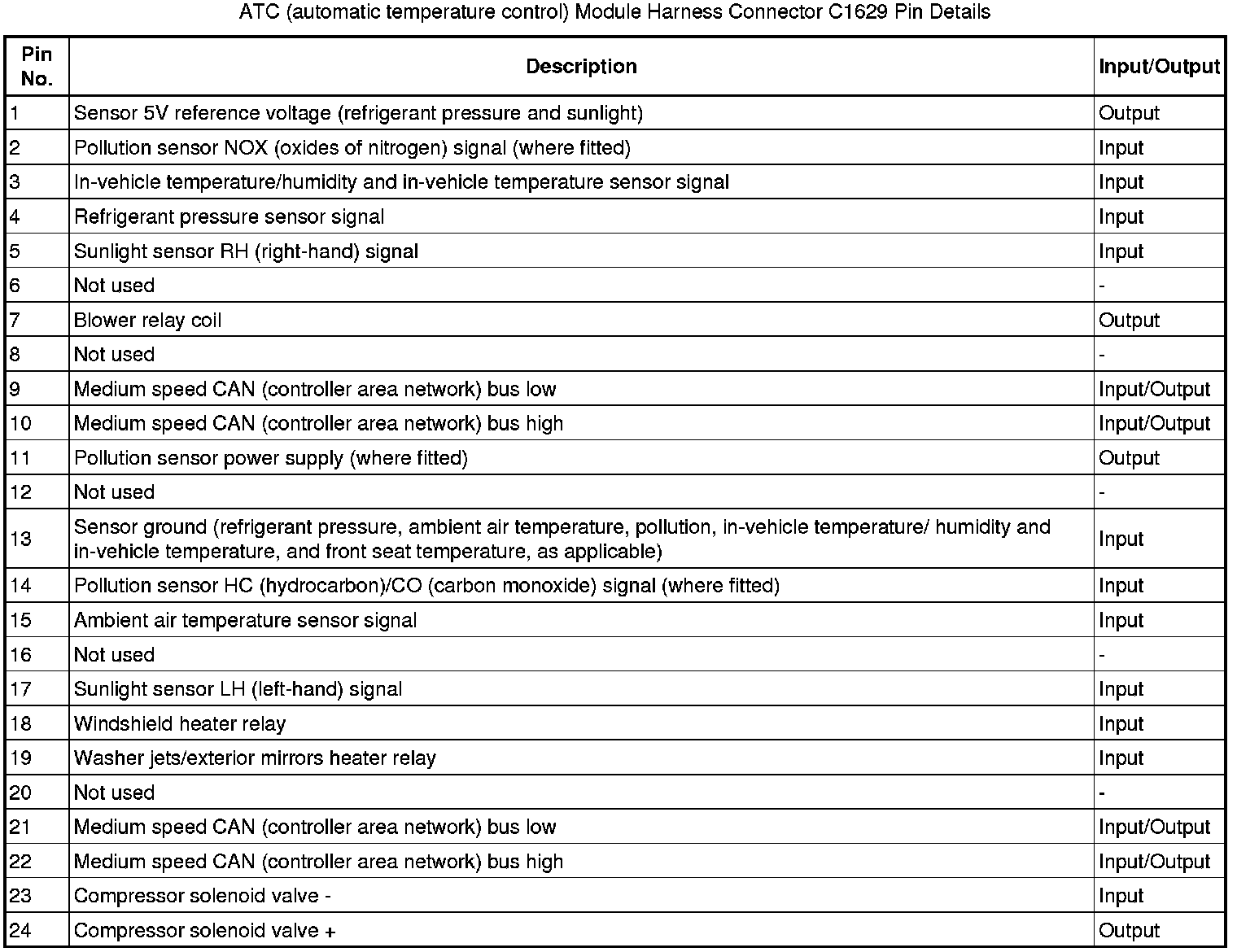 The ATC (automatic temperature control) module processes inputs from the control panel switches, system sensors and the medium speed CAN (controller area network) bus, then outputs the appropriate control signals to the A/C (air conditioning) system and the heating and ventilation system. In addition to controlling the A/C (air conditioning) system and the heating and ventilation system, the ATC (automatic temperature control) module also controls the following: