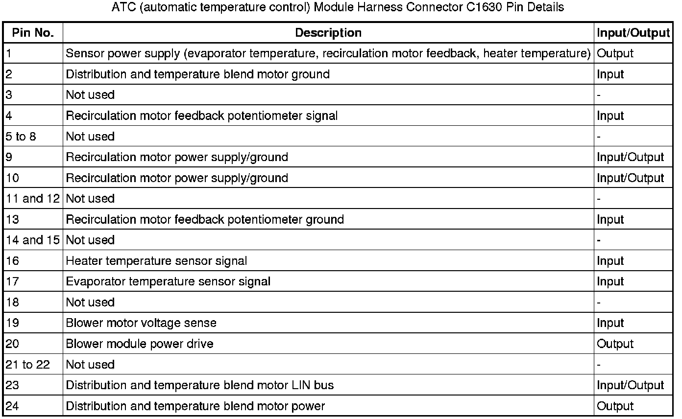 The control system sensors provide hardwired inputs to the ATC (automatic temperature control) module. The ATC (automatic temperature control) module also uses the LIN (local interconnect network) bus to communicate with the door motors in the heater assembly, and the medium speed CAN (controller area network) bus to communicate with other control modules on the vehicle. For additional information, refer to Communications Network