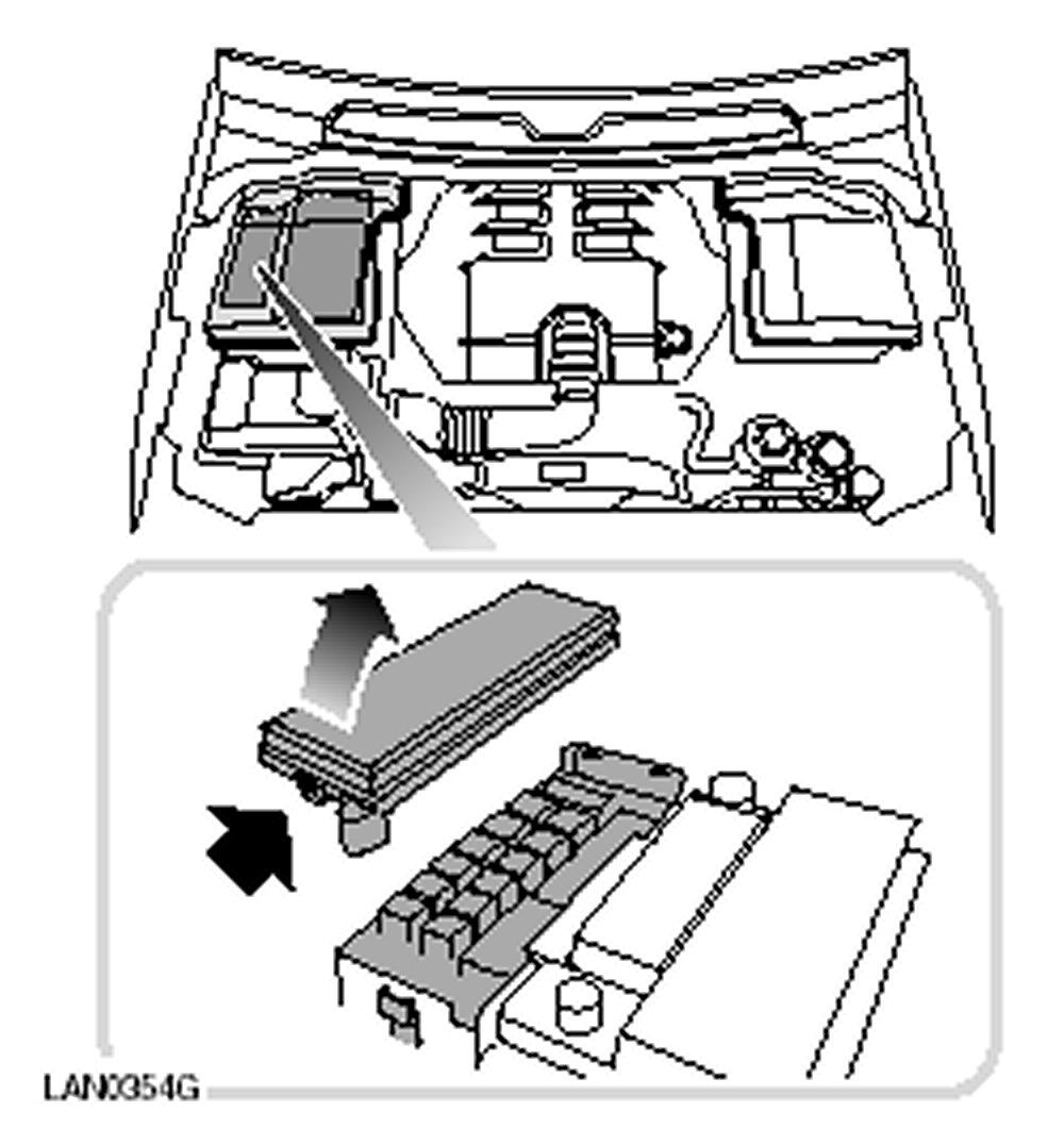 The engine compartment fuse box is located at the rear of the engine bay.