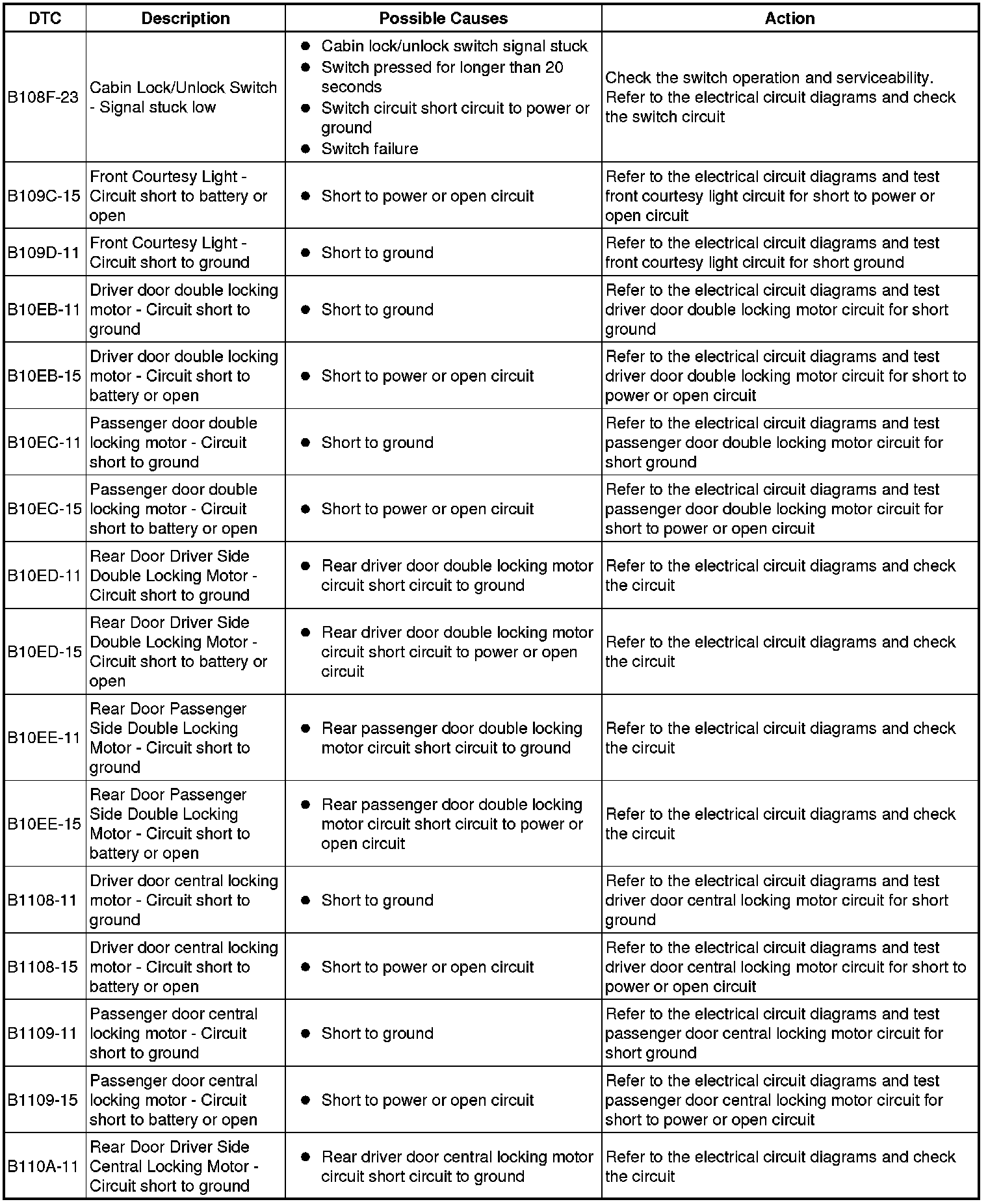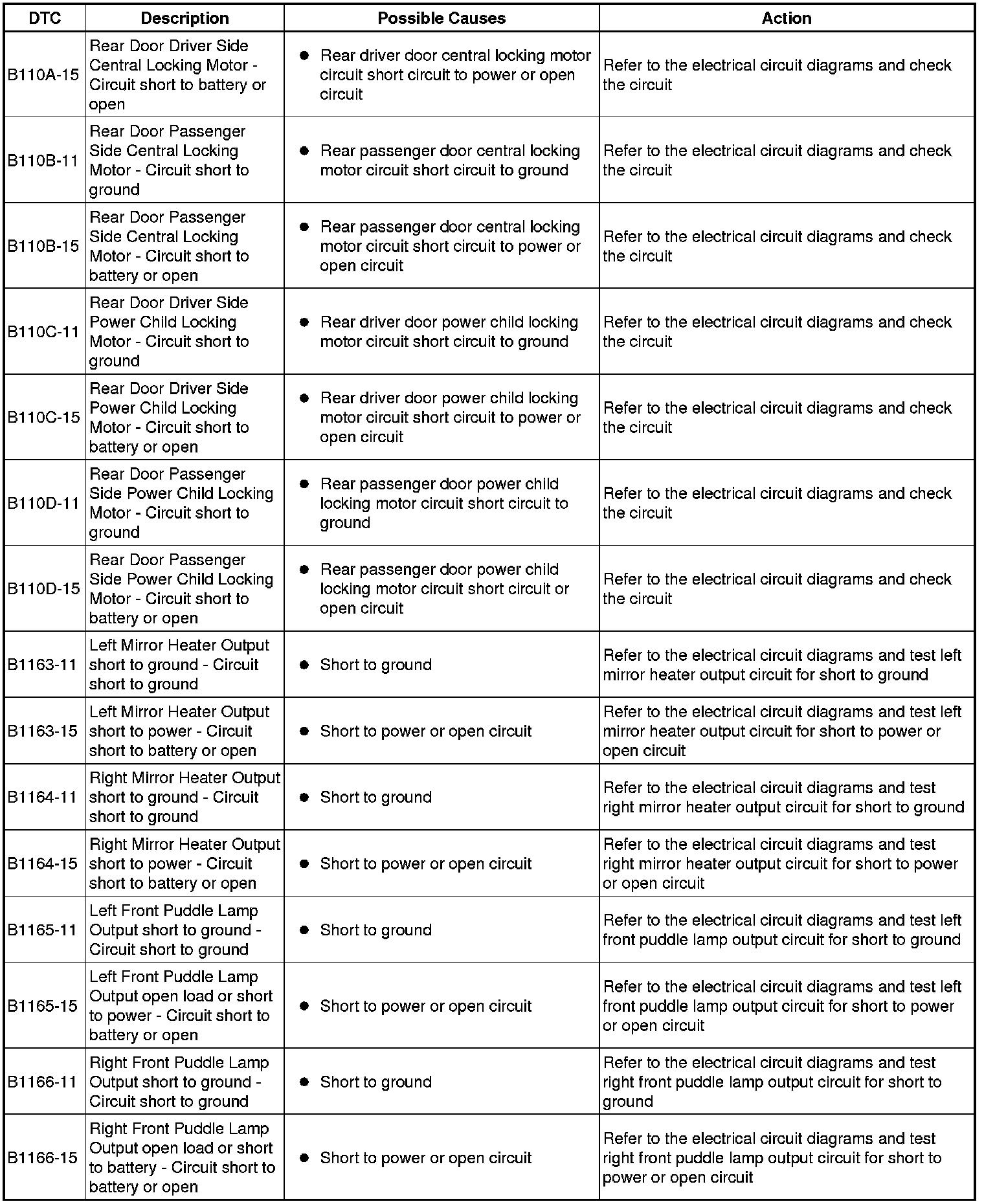 The table below lists all Diagnostic Trouble Codes (DTCs) that could be logged in the Driver/Passenger Door Modules, for additional Diagnosis and Testing information refer to the relevant Diagnosis and Testing Section.