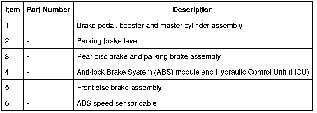 Hydraulic brake actuation consists of the brake pedal, master cylinder, HCU, and the connecting hydraulic pipes and hoses.