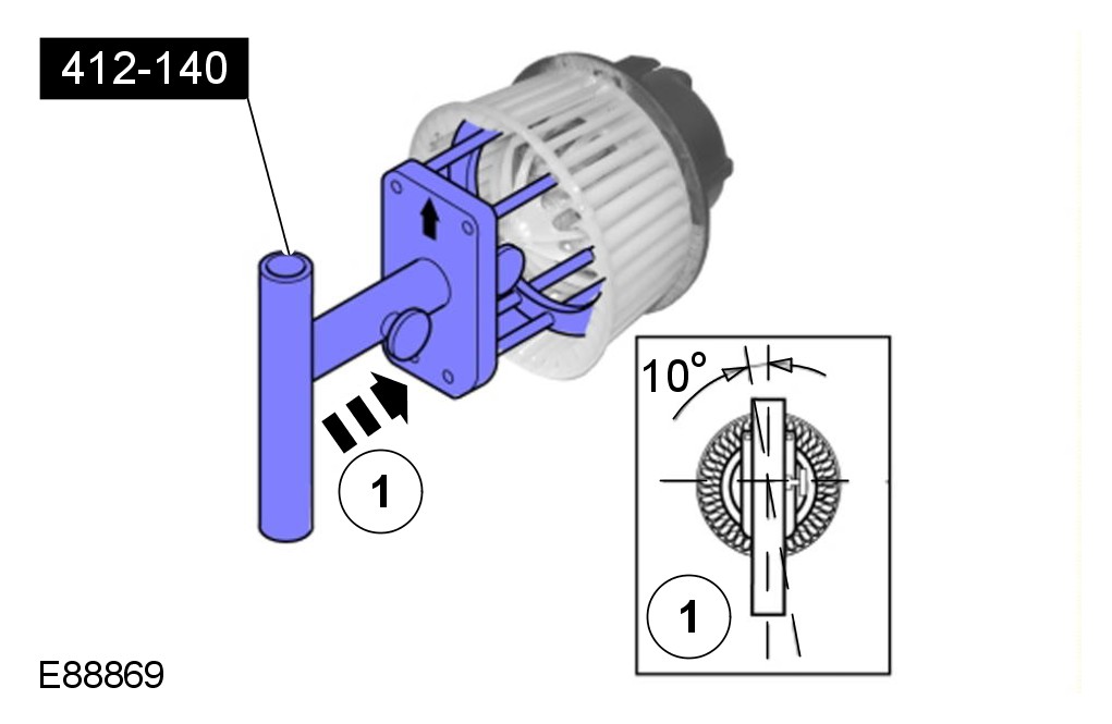 1 Using the special tool, install the blower motor assembly approximately 10 degrees counter-clockwise from the vertical position.