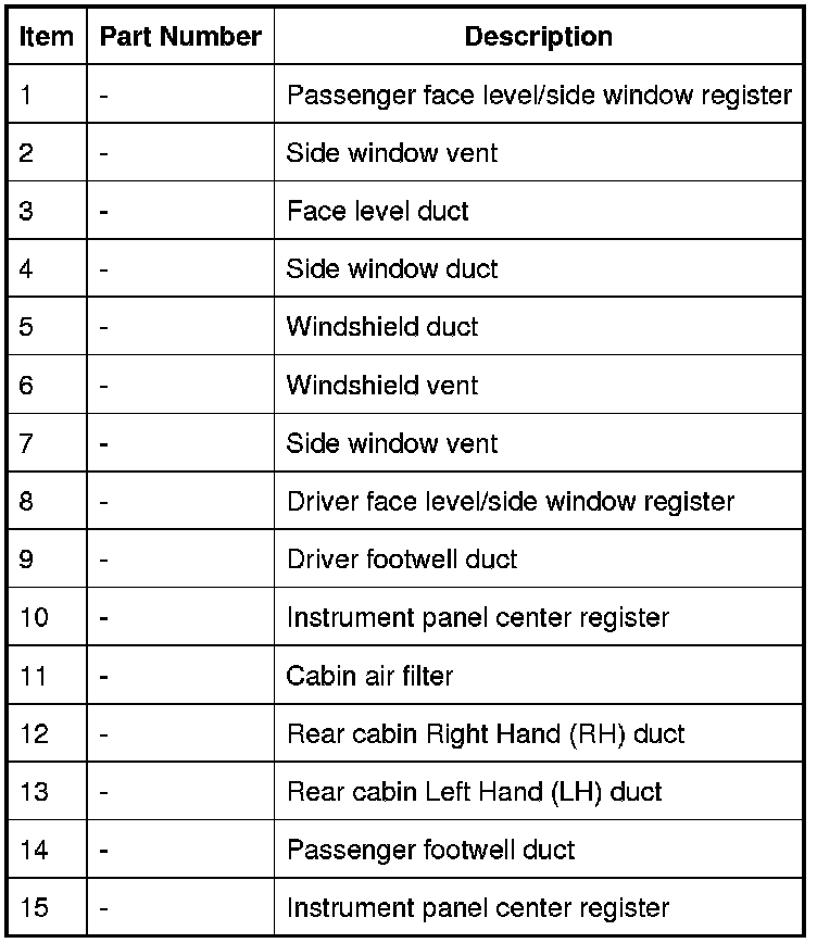 The air ducts distribute air from the heater assembly to the various registers and vents in the instrument panel and to the rear of the vehicle.