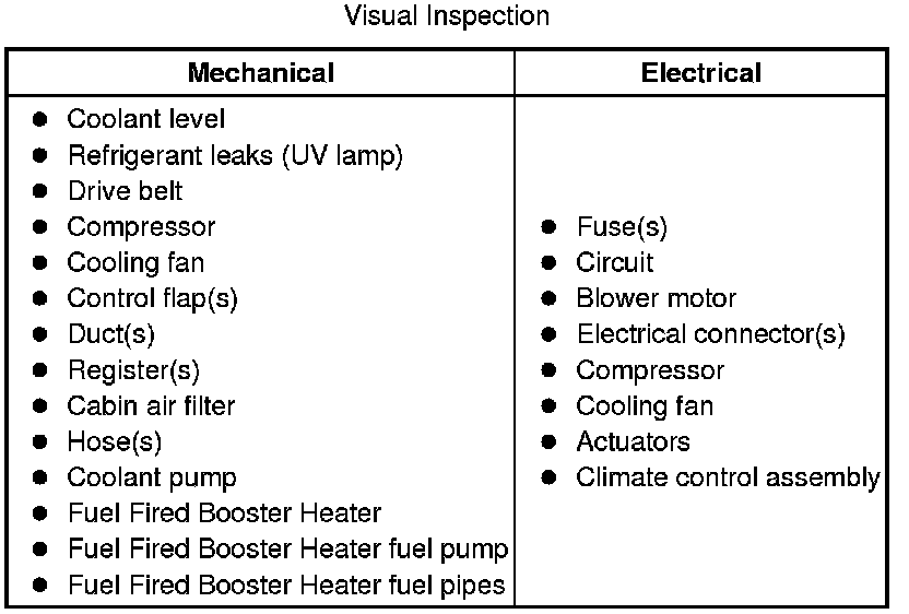 6 If the cause is not visually evident, check Climate Control Module, Engine Control Module (ECM), Fuel Fired Booster Heater and Central Junction Box (CJB) for Diagnostic Trouble Codes (DTCs) and refer to the DTC Index.
