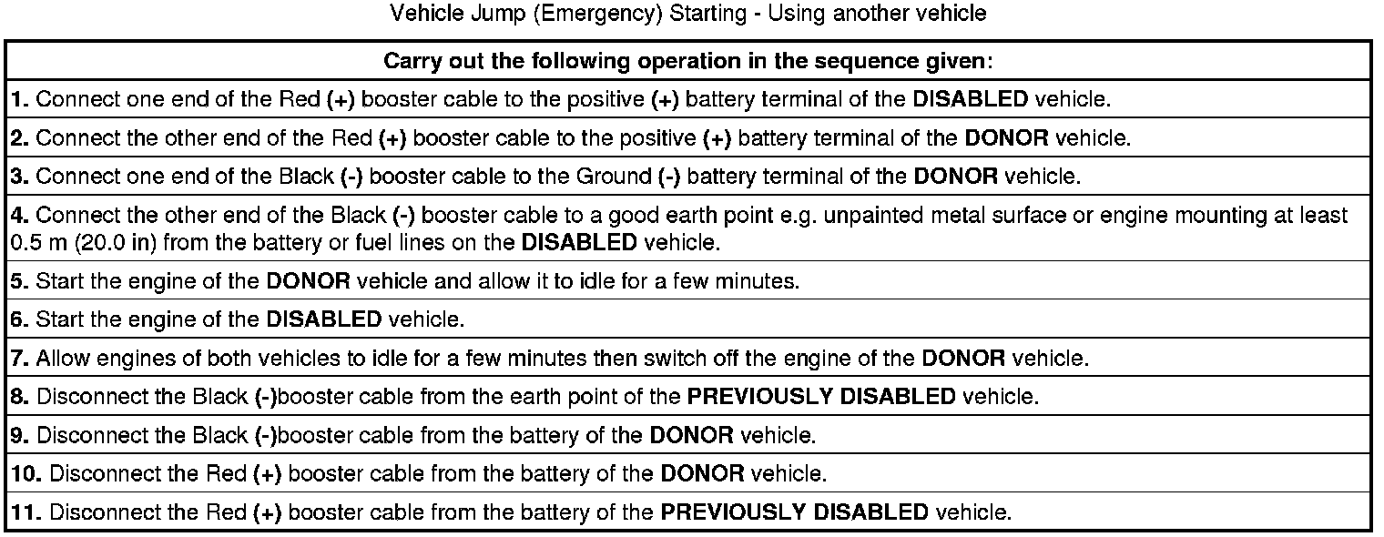 CAUTION: Ensure that the battery of the DONOR vehicle is of 12 volt capacity and that all electrical loads on the disabled vehicle are switched OFF prior to connecting booster cables.