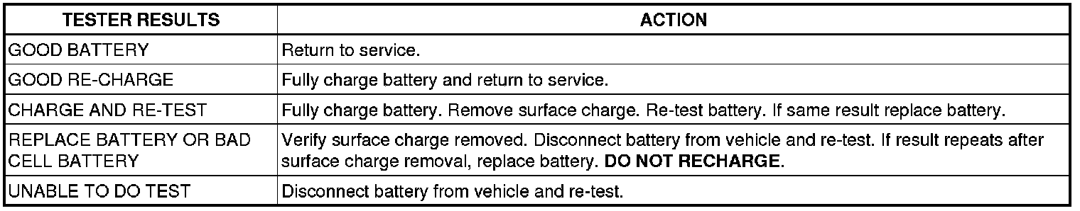 3. Perform the action based on the tester results (see the tester results chart in the Vehicles in Service sub -section of Determining Battery Condition Section).