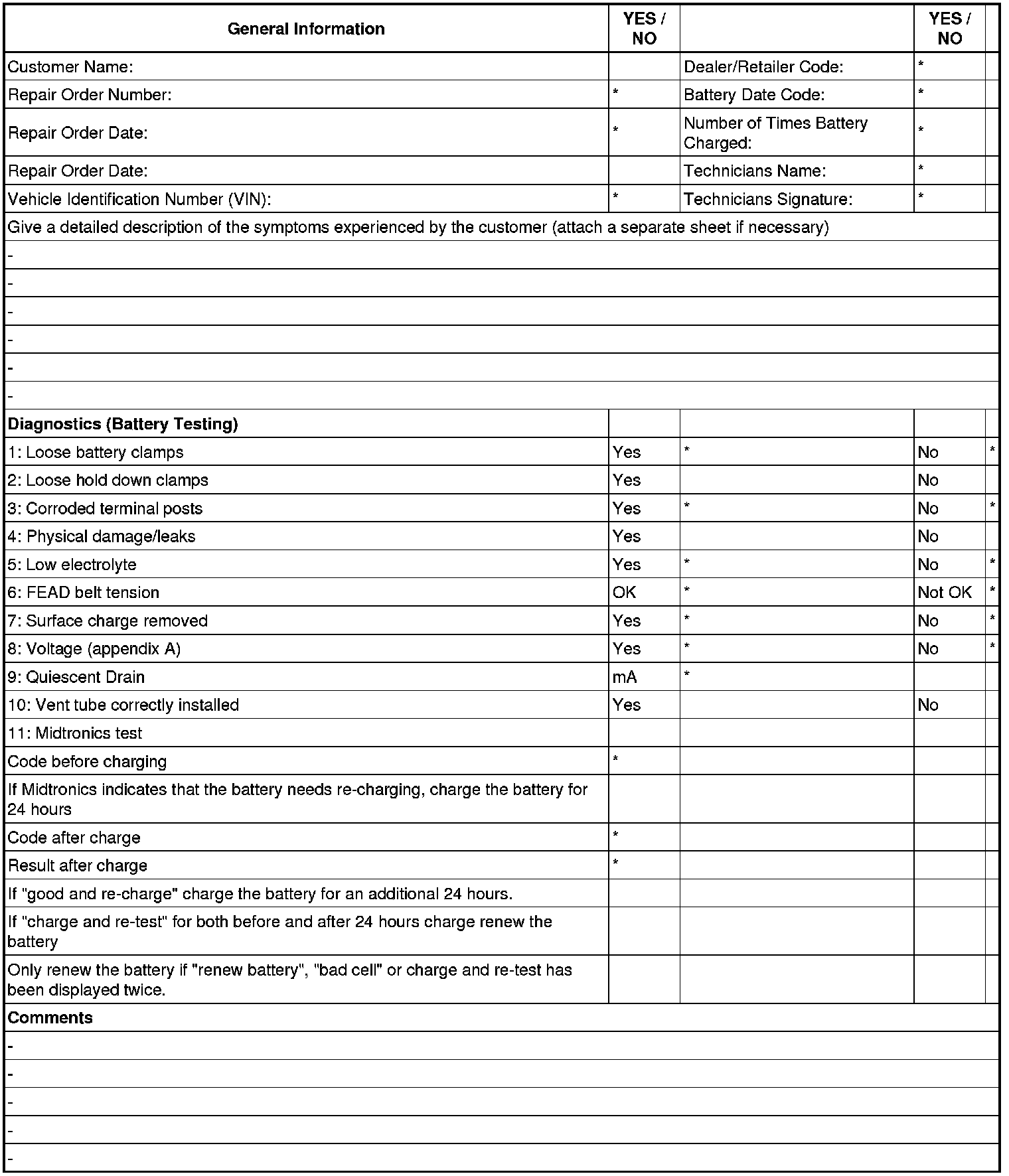 4. Enter the readings and test code obtained on the Battery Report Form (Appendix B) or equivalent which records as a minimum the technician's name, Vehicle Identification Number (VIN), Date of check, Midtronics code and Battery Voltage from the Midtronics tester.