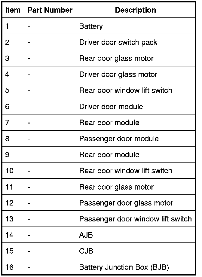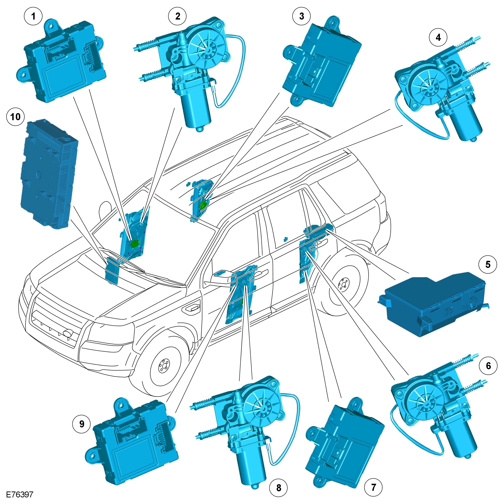 If a front door module develops a fault, a Diagnostic Trouble Code (DTC) is stored in its memory. The DTC can be read using the Land Rover approved diagnostic system. If either of the rear door modules develop a fault, the DTC is stored in the respective front door module. For additional information, refer to Glass, Frames and Mechanisms Testing and Inspection