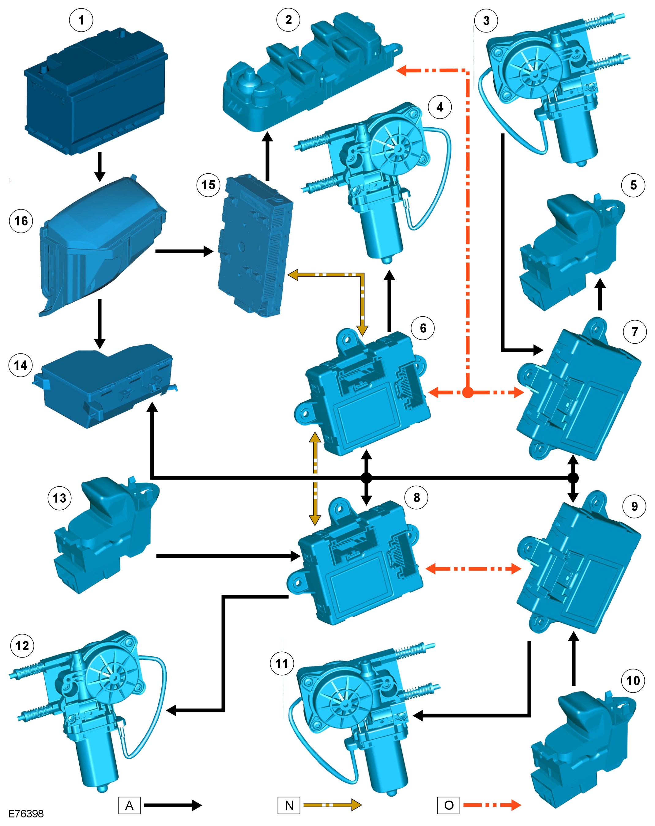 Operation of the window lift system is controlled by the CJB in conjunction with the driver door module and the front passenger door module. The door modules are mounted on the regulators of their respective front windows. Door modules are also mounted on both rear window regulators, and communicate with the front door modules over the Local Interconnect Network (LIN) bus.