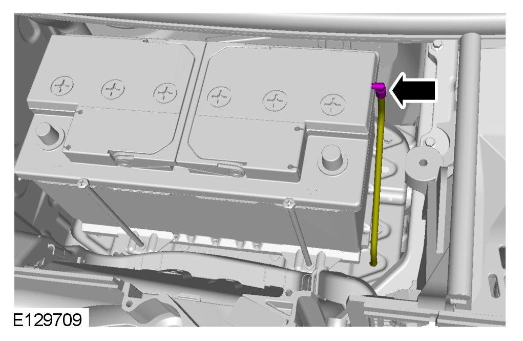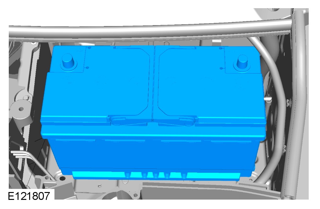 CAUTION: Make sure that the battery is positioned fully outboard on the battery tray and that no harnesses or hoses are trapped before securing the battery with the bolts.