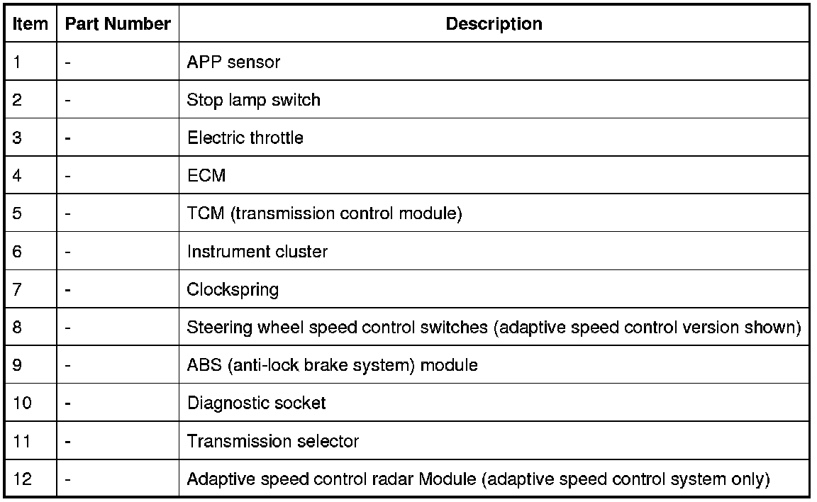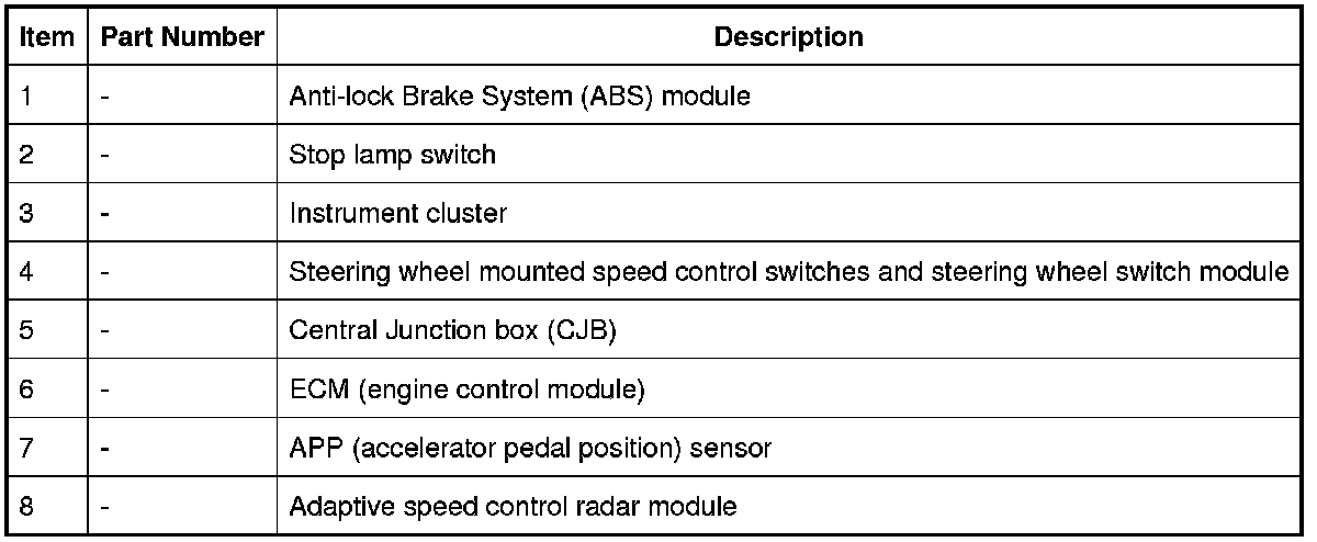The standard speed control system also uses inputs from the Stop lamp switch, the APP (accelerator pedal position) sensor, the ECM (engine control module) and the ABS (anti-lock brake system) module.