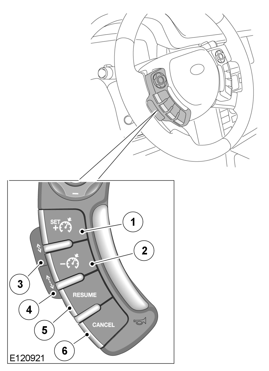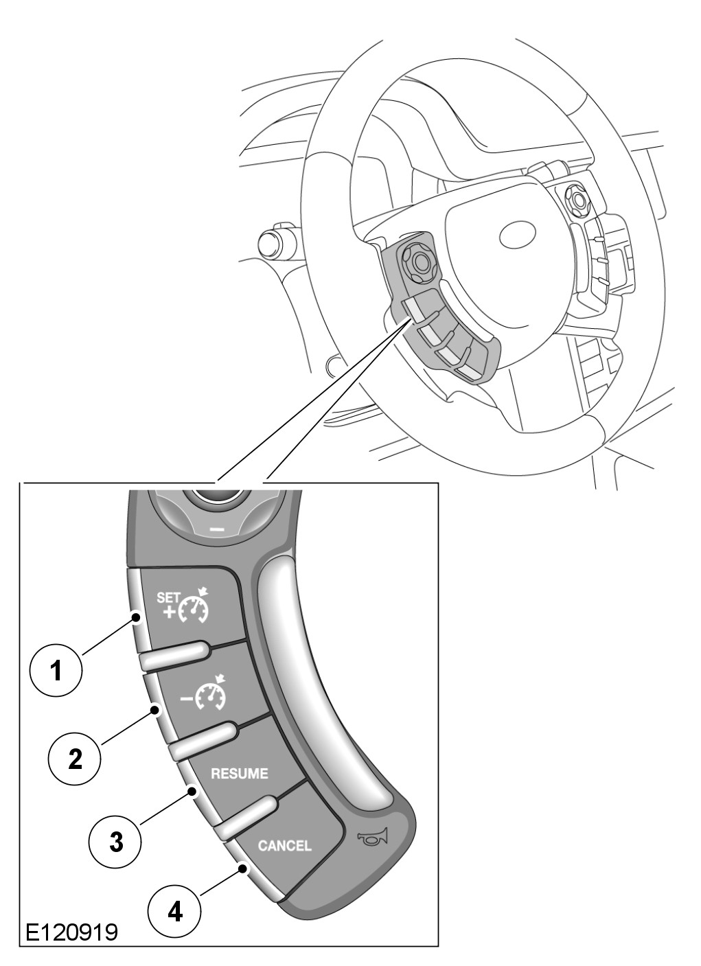 - Press and hold the set speed accelerate + switch which will cause the vehicle to accelerate. When the switch is released the attained speed will be set as the cruise speed.