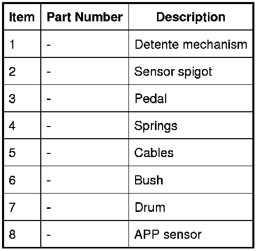 The APP (accelerator pedal position) sensor has a spigot which protrudes into the housing of the accelerator pedal and provides the pivot point for the pedal mechanism. The spigot has a slot which allows for a pin, which is attached to the sensor potentiometers, to rotate through approximately 90 degrees , which relates to pedal movement. The pedal is connected via a link to a drum, which engages with the sensor pin, changing the linear movement of the pedal into rotary movement of the drum. The drum has two steel cables attached to it. The cables are secured to two tension springs which are secured in the opposite end of the housing. The springs provide 'feel' on the pedal movement and require an effort from the driver similar to that of a cable controlled throttle. A detente mechanism is located at the forward end of the housing and is operated by a ball located on the drum. At near maximum throttle pedal movement, the ball contacts the detente