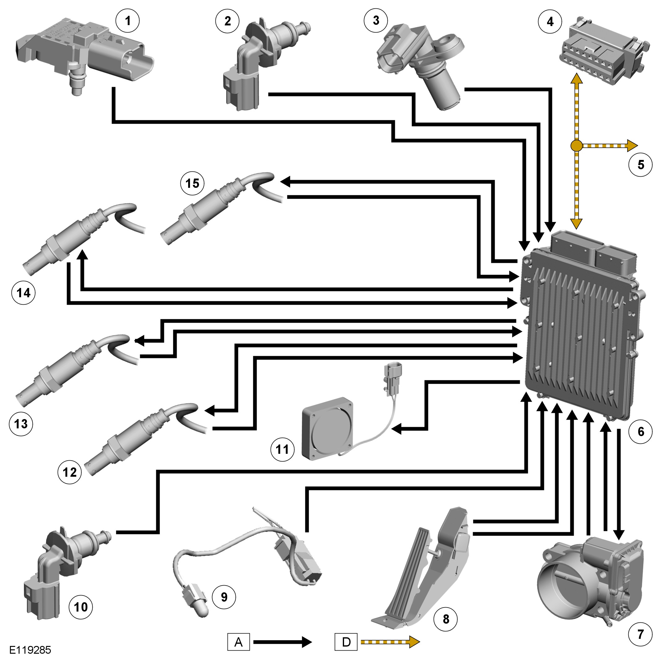 The ECM (engine control module) monitors the outputs from each of the potentiometer tracks and can determine the position, rate of change and direction of movement of the throttle pedal. The closed throttle position signal is used by the ECM (engine control module) to initiate idle speed control and overrun fuel cut-off.