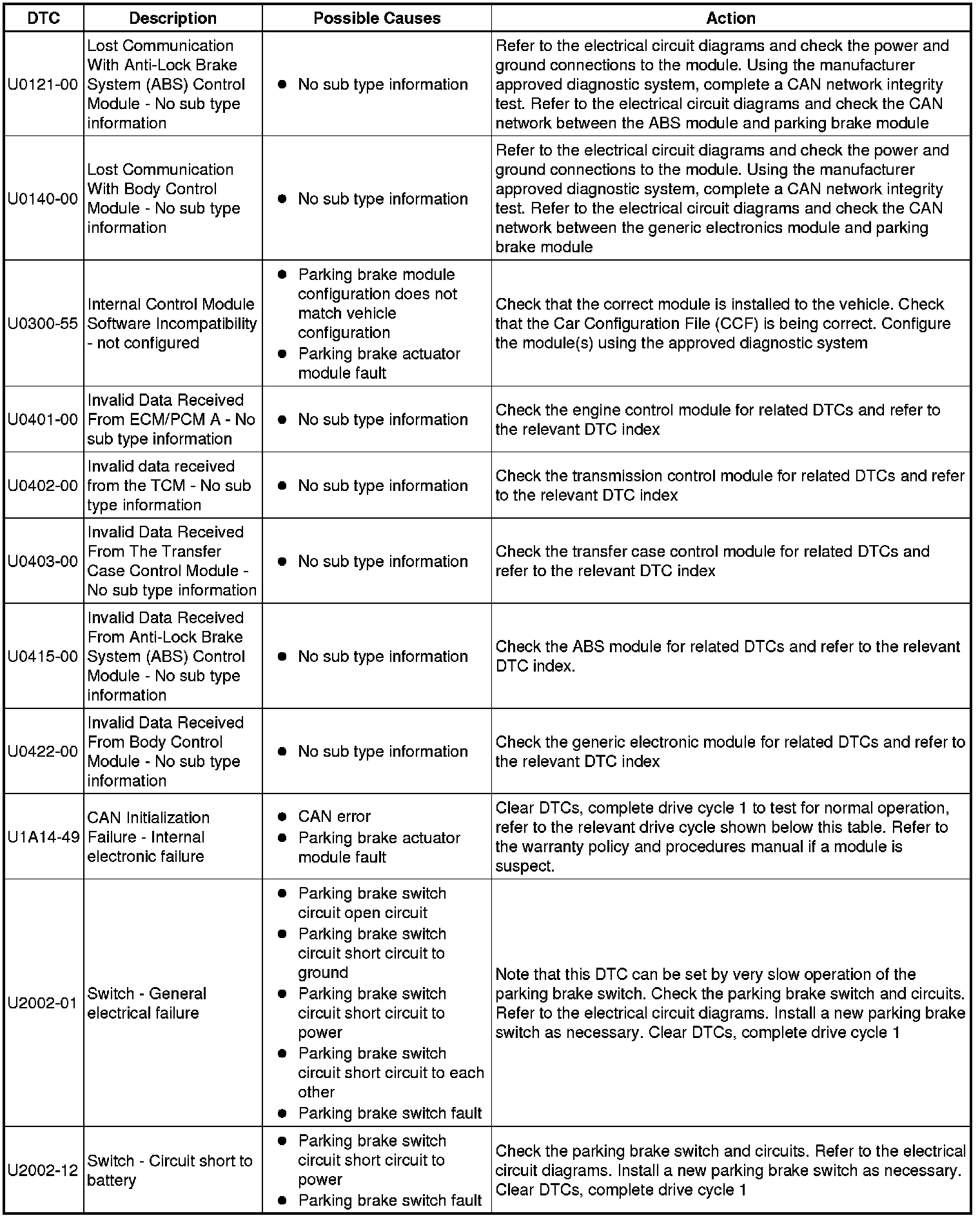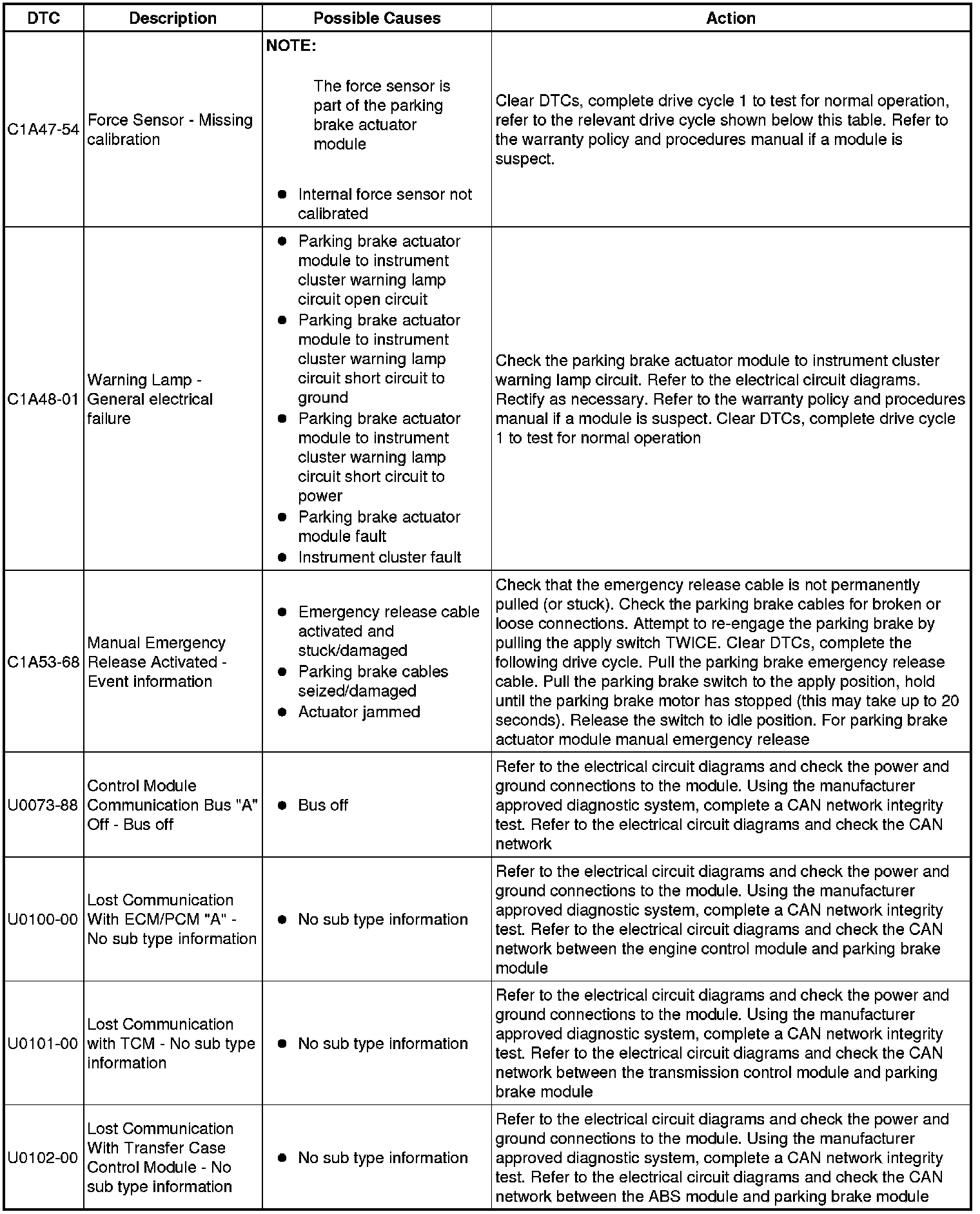 The table below lists all Diagnostic Trouble Codes (DTCs) that could be logged in the Parking Brake Module, for additional Diagnosis and Testing information refer to the relevant Diagnosis and Testing Section. For additional information, refer to Parking Brake Testing and Inspection