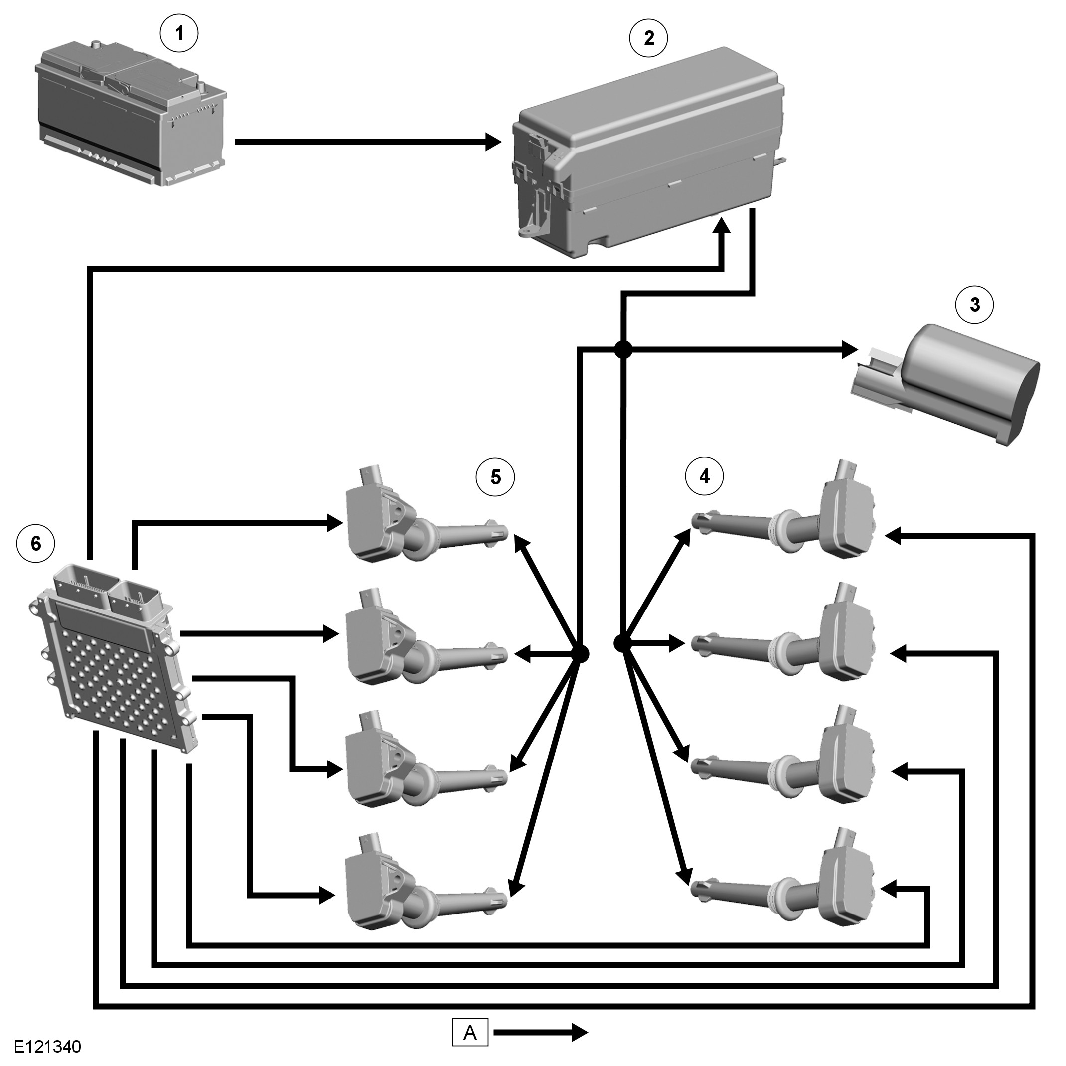 The engine ignition system is a coil-on-plug, single spark system controlled by the ECM (engine control module). An iridium tipped spark plug is installed in each combustion chamber, between the inlet and exhaust valves, and an ignition coil is installed on each spark plug. A RFI (radio frequency interference) suppressor is connected to the power feed to the ignition coils.
