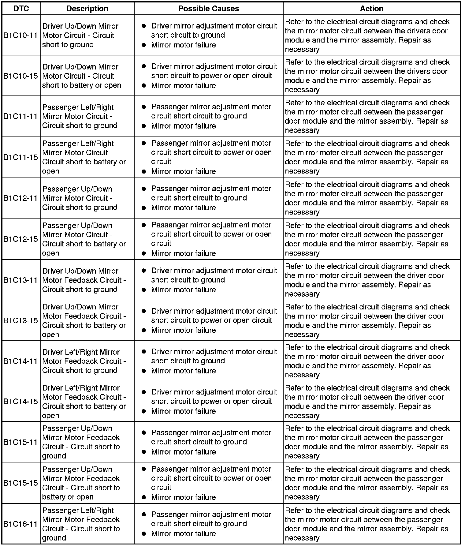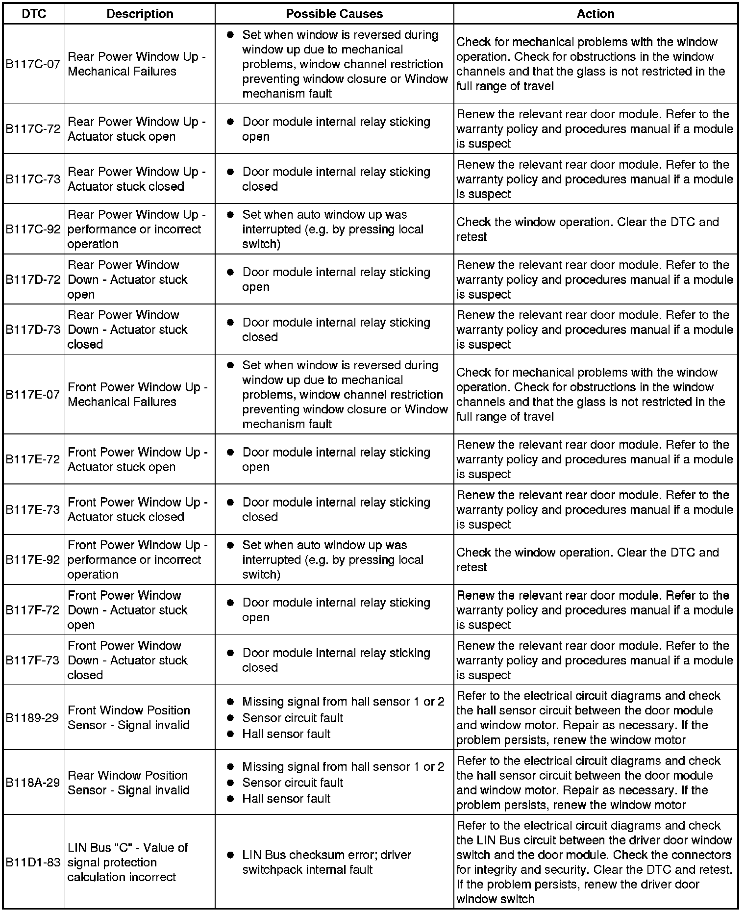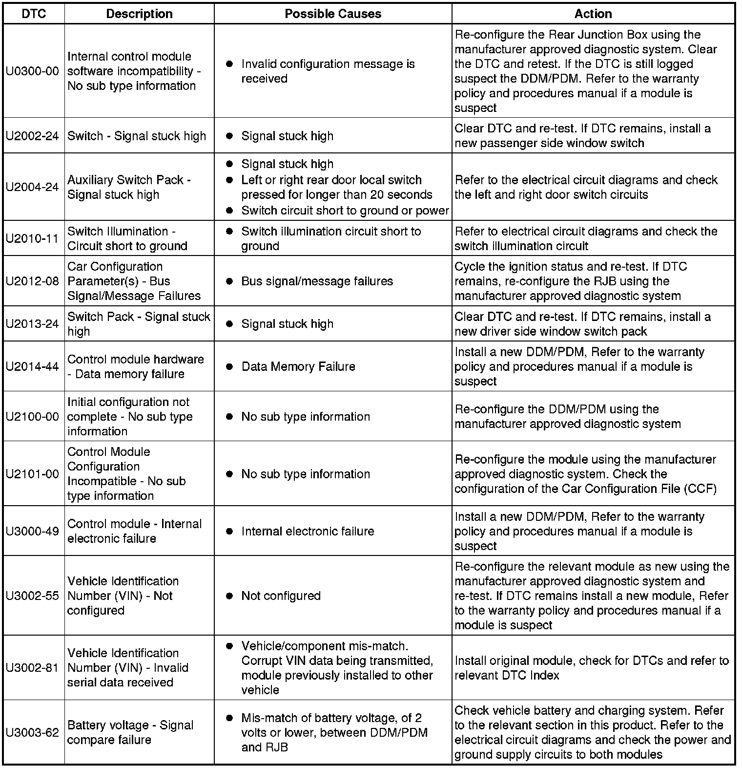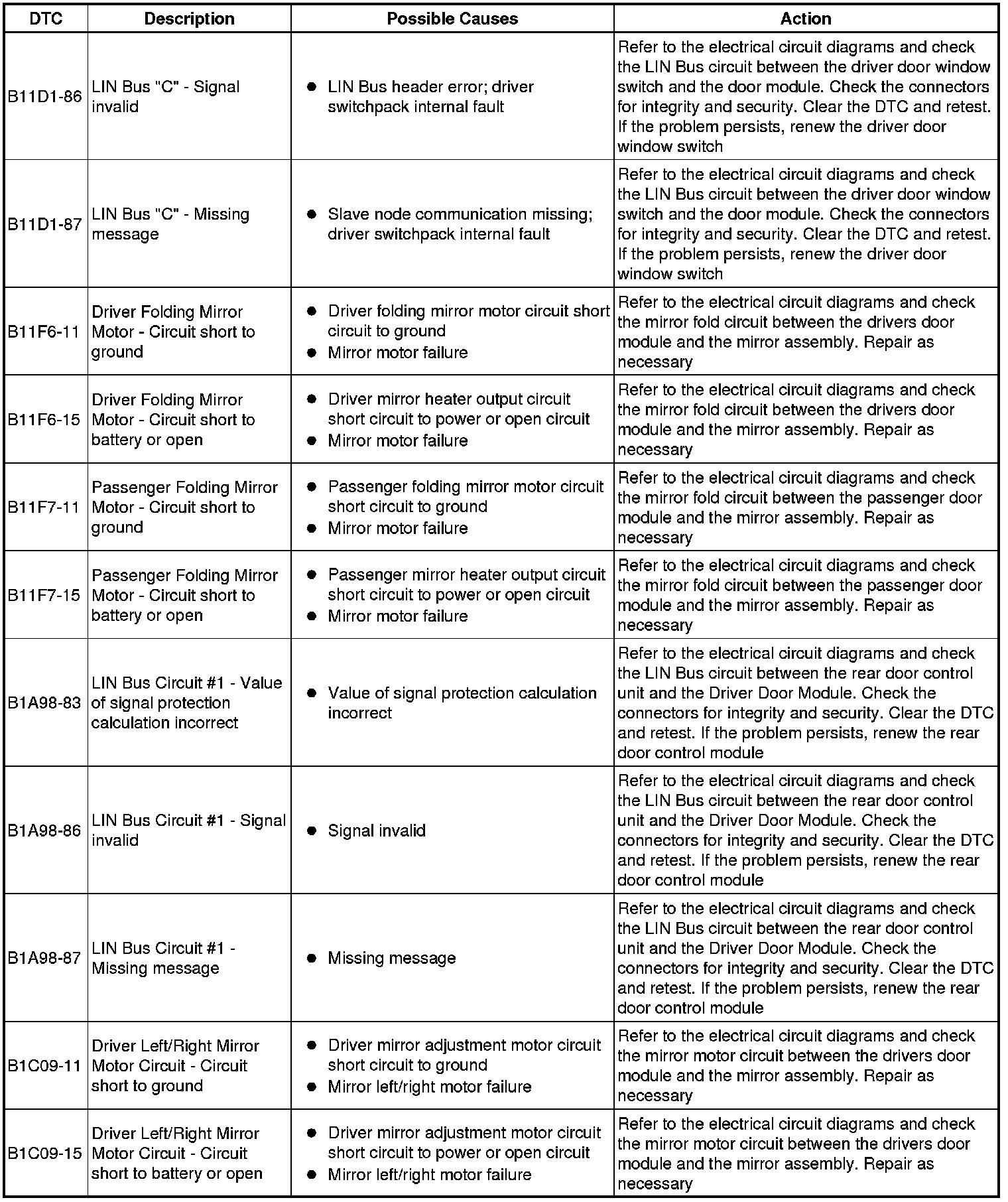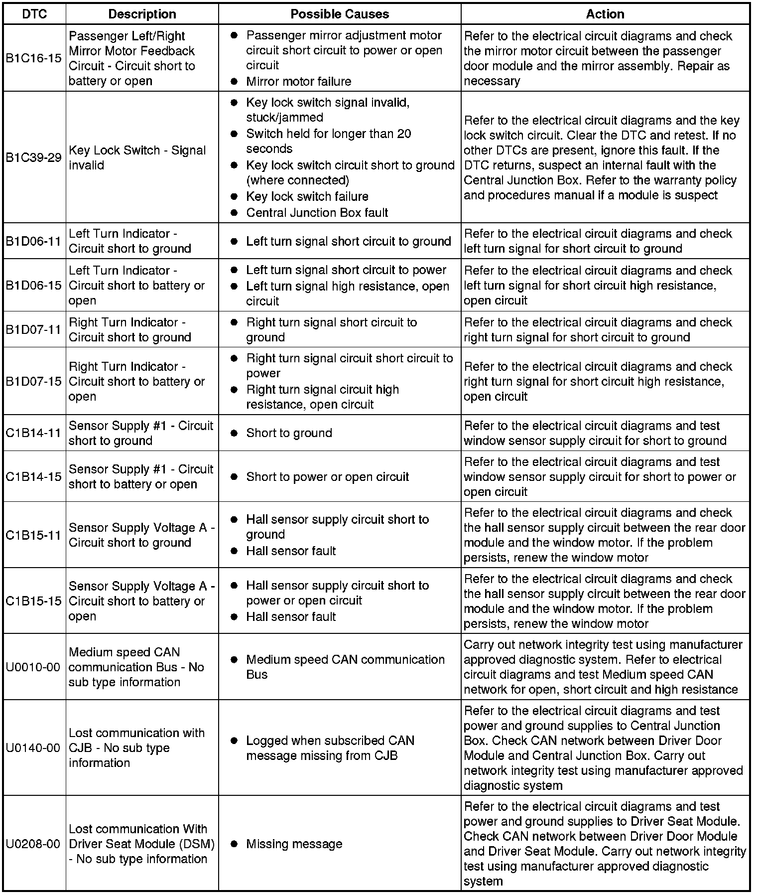 The table below lists all Diagnostic Trouble Codes (DTCs) that could be logged in the Driver/Passenger Door Modules, for additional Diagnosis and Testing information refer to the relevant Diagnosis and Testing Section.