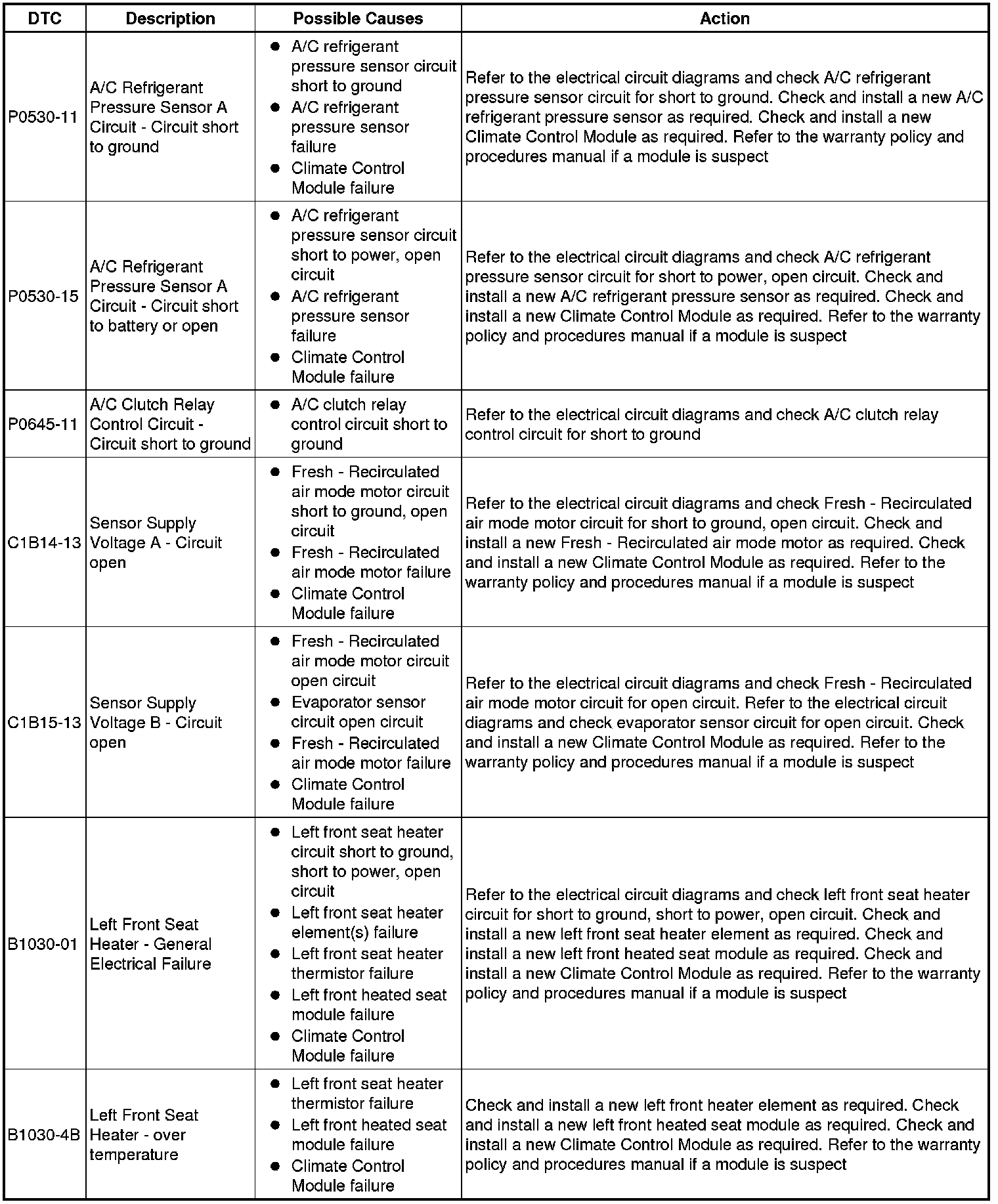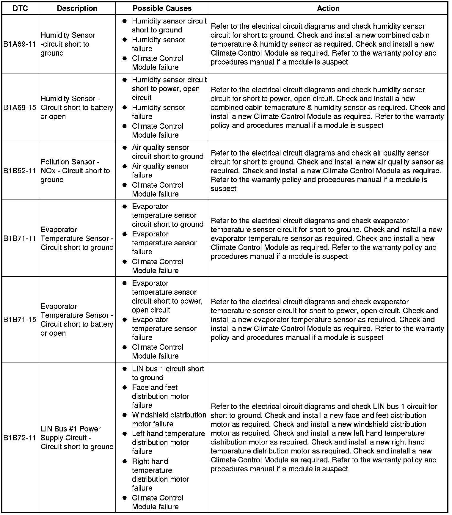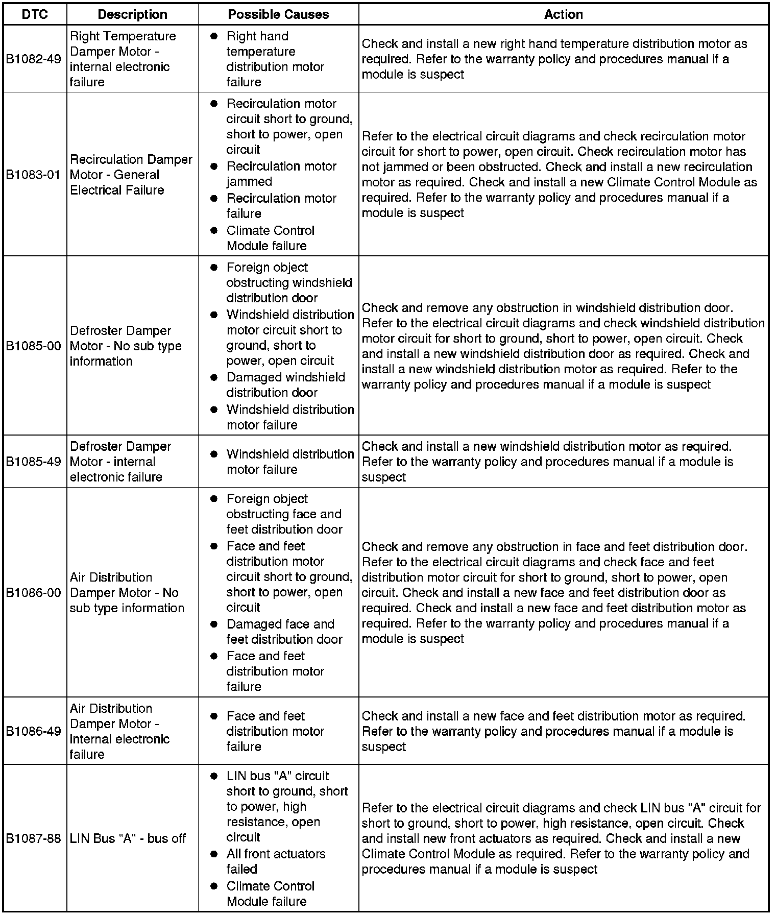 The table below lists all Diagnostic Trouble Codes (DTCs) that could be logged in the Climate Control Module, for additional Diagnosis and Testing information refer to the relevant Diagnosis and Testing Section. For additional information, refer to Climate Control System Climate Control System