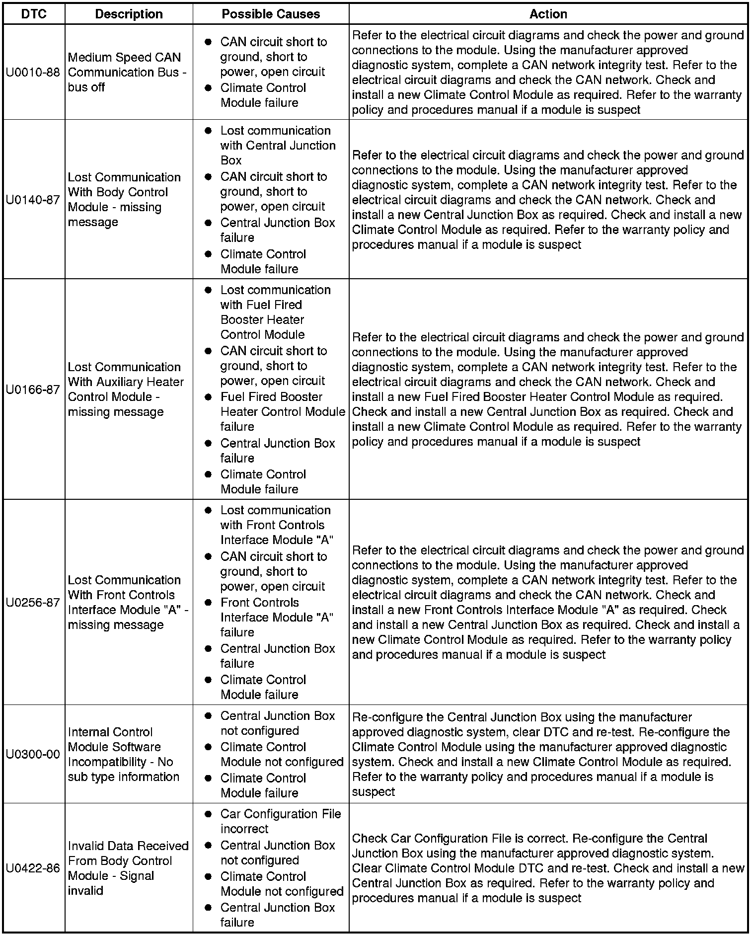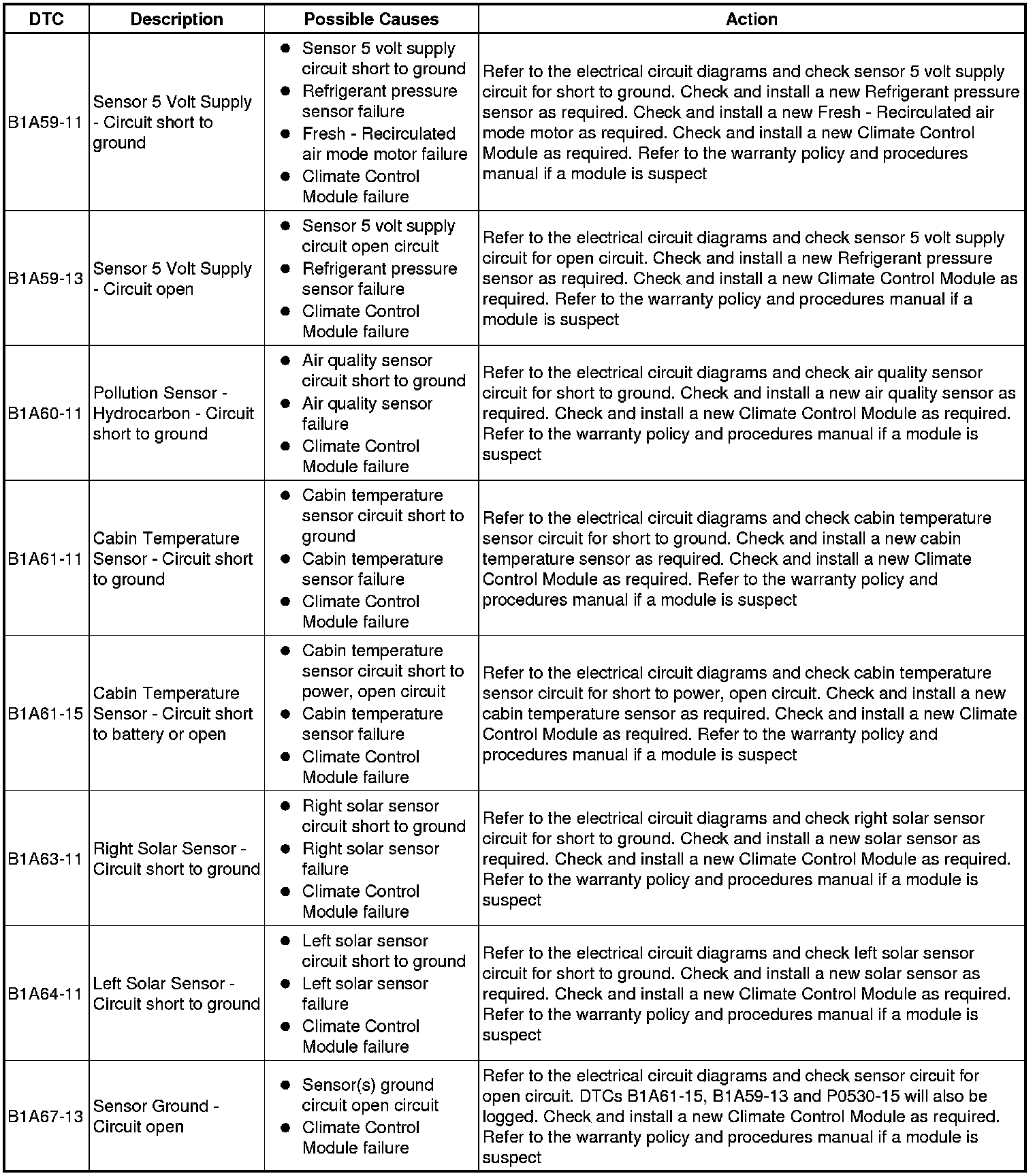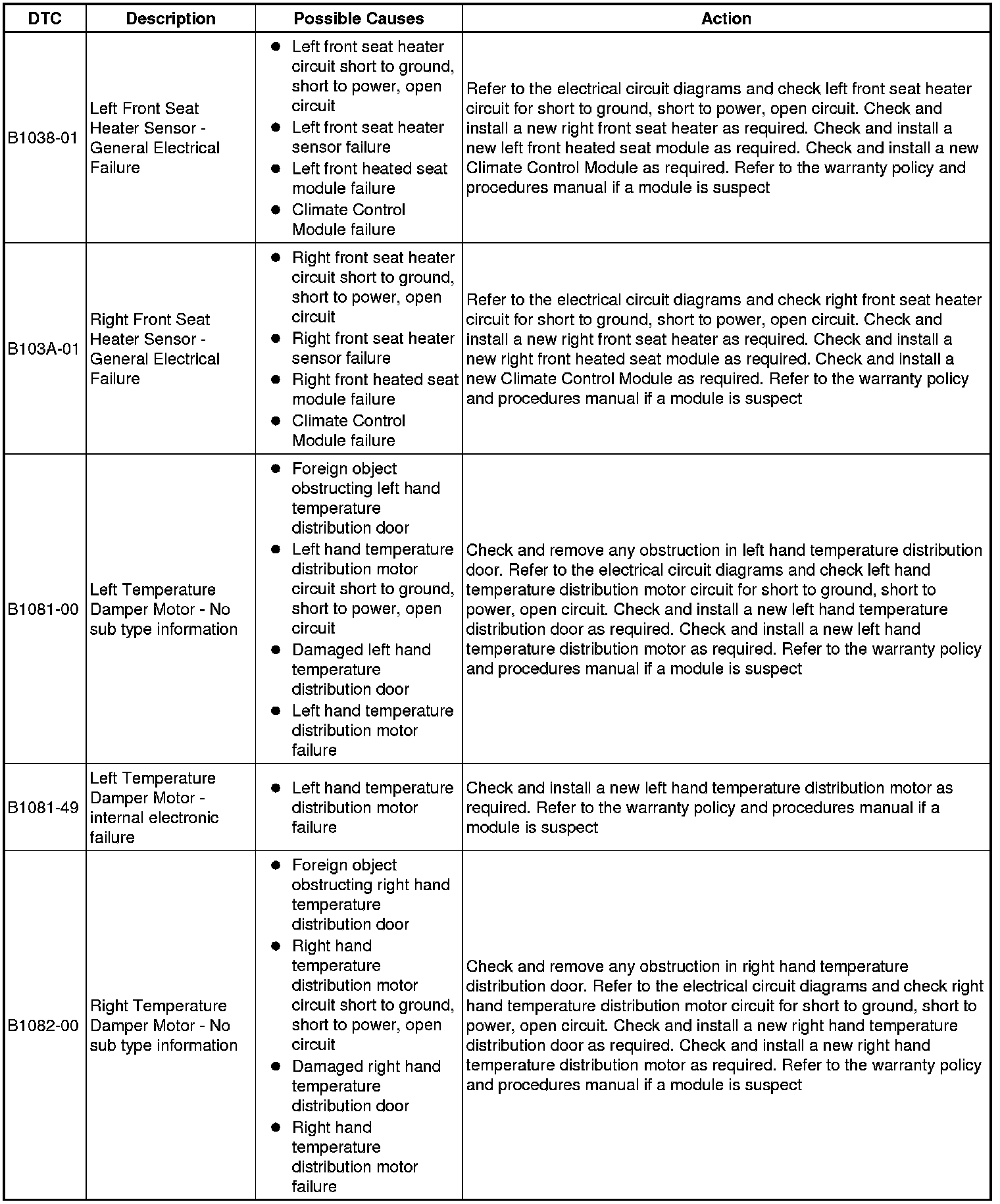 The table below lists all Diagnostic Trouble Codes (DTCs) that could be logged in the Climate Control Module, for additional Diagnosis and Testing information refer to the relevant Diagnosis and Testing Section. For additional information, refer to Climate Control System Climate Control System