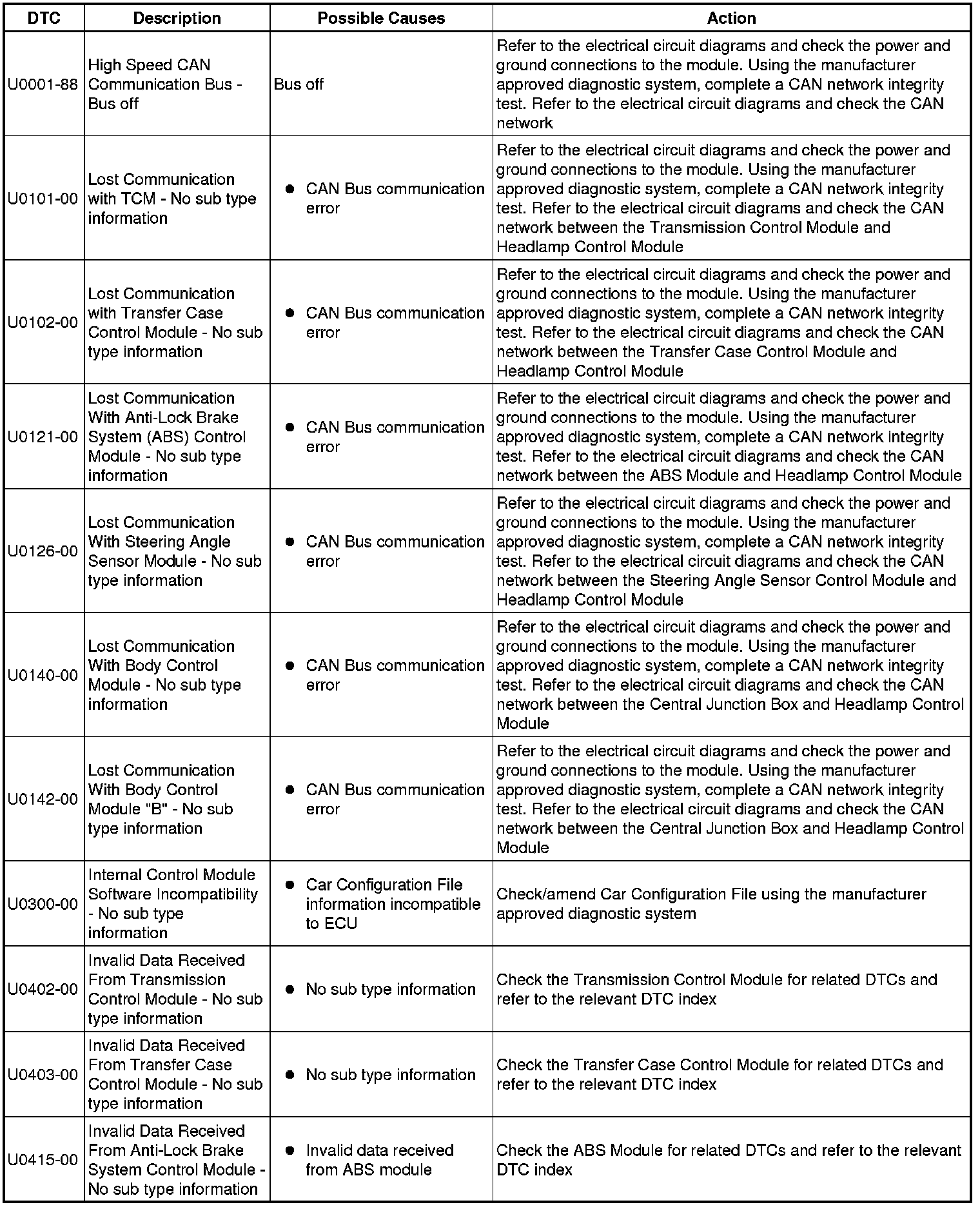 The table below lists all Diagnostic Trouble Codes (DTCs) that could be logged in the Headlamp Control Module, for additional Diagnosis and Testing information refer to the relevant Diagnosis and Testing Section. For additional information, refer to Headlamps Headlamps