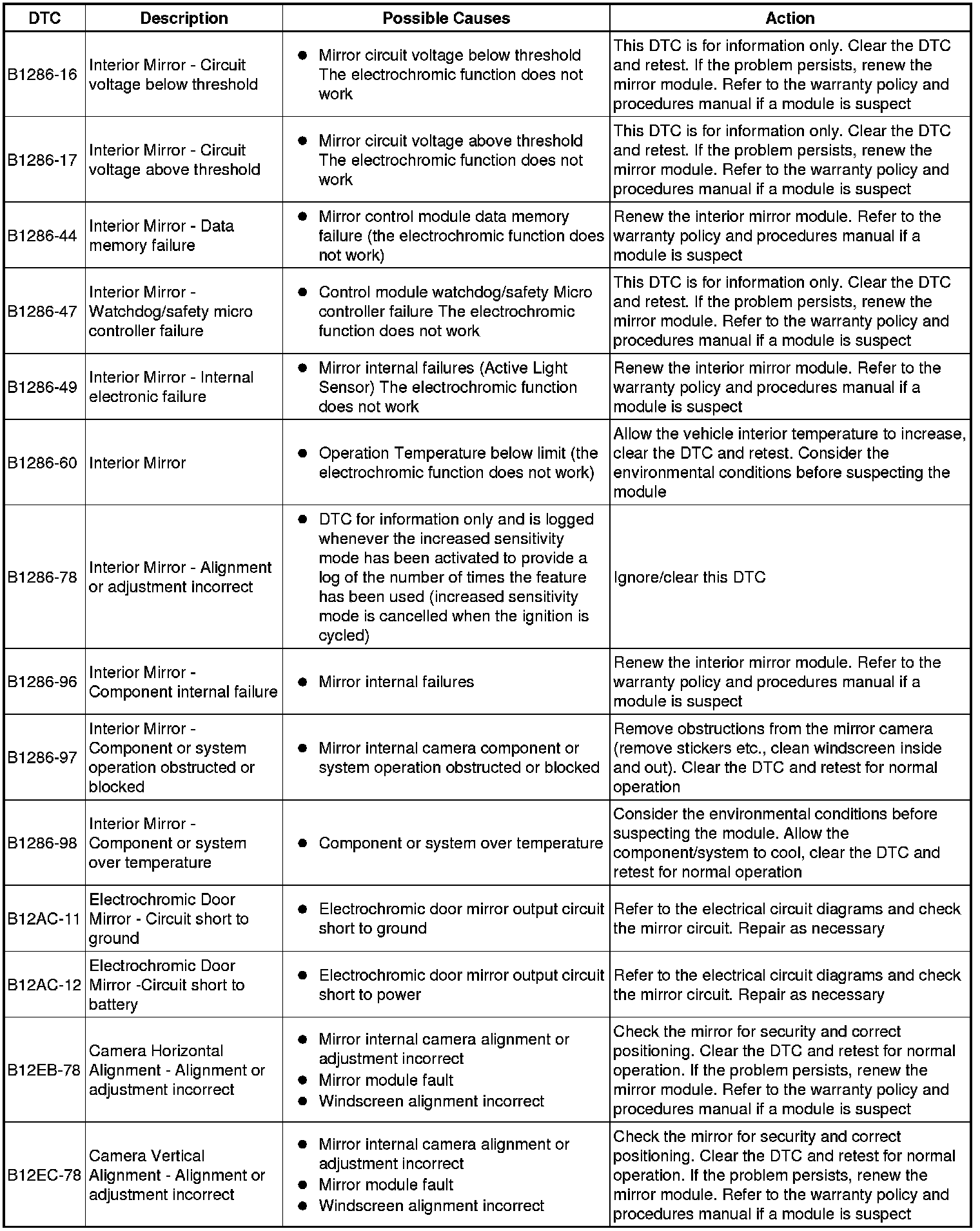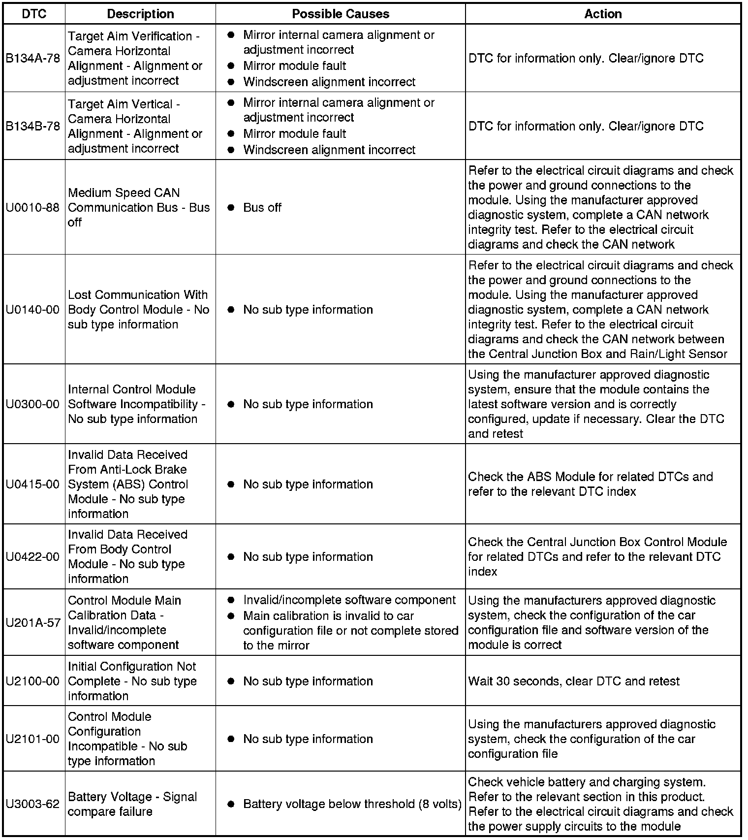The table below lists all Diagnostic Trouble Codes (DTCs) that could be logged in the Headlamp Control Module B, for additional Diagnosis and Testing information refer to the relevant Diagnosis and Testing Section. For additional information, refer to Autolamps Autolamps