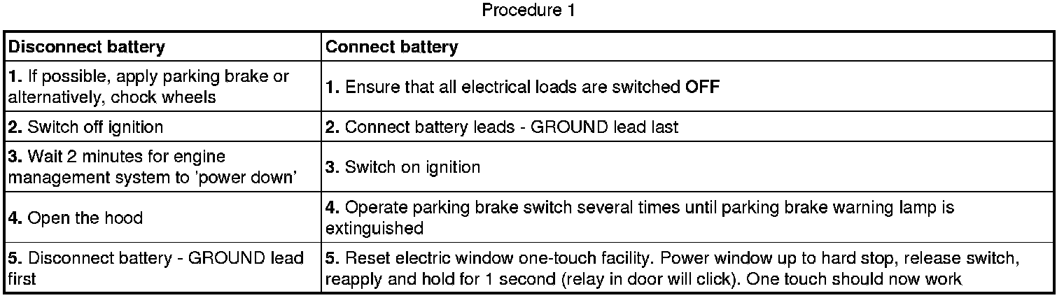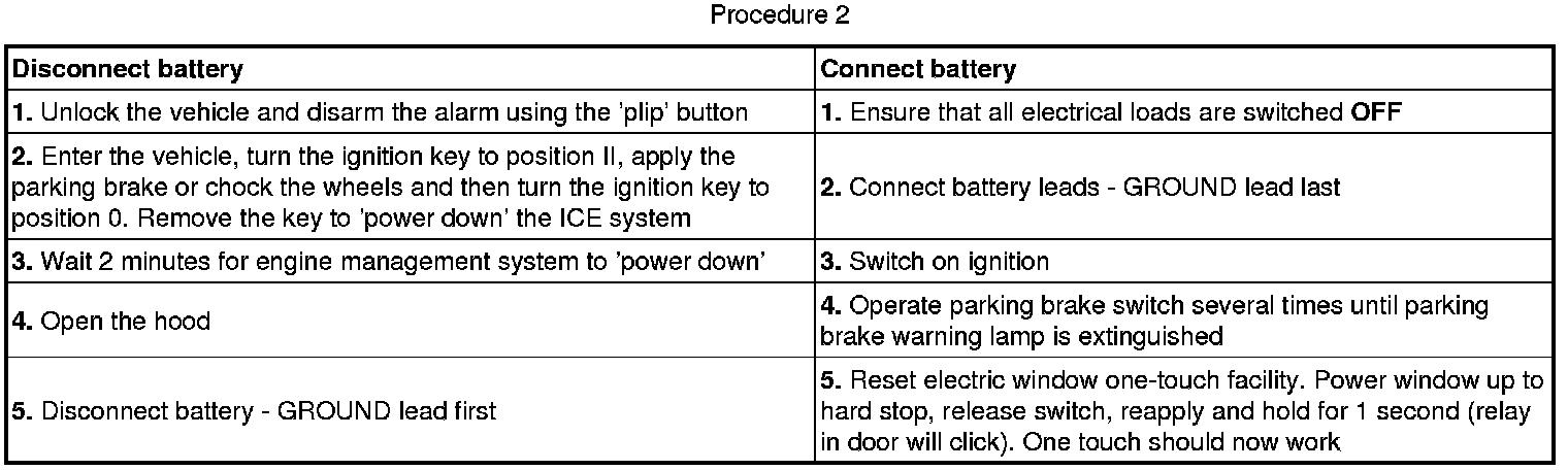 CAUTION: The vehicle status and battery condition must be established before attempting battery disconnect/connect. Reference must be then made to the following table to establish the relevant procedure to be followed.