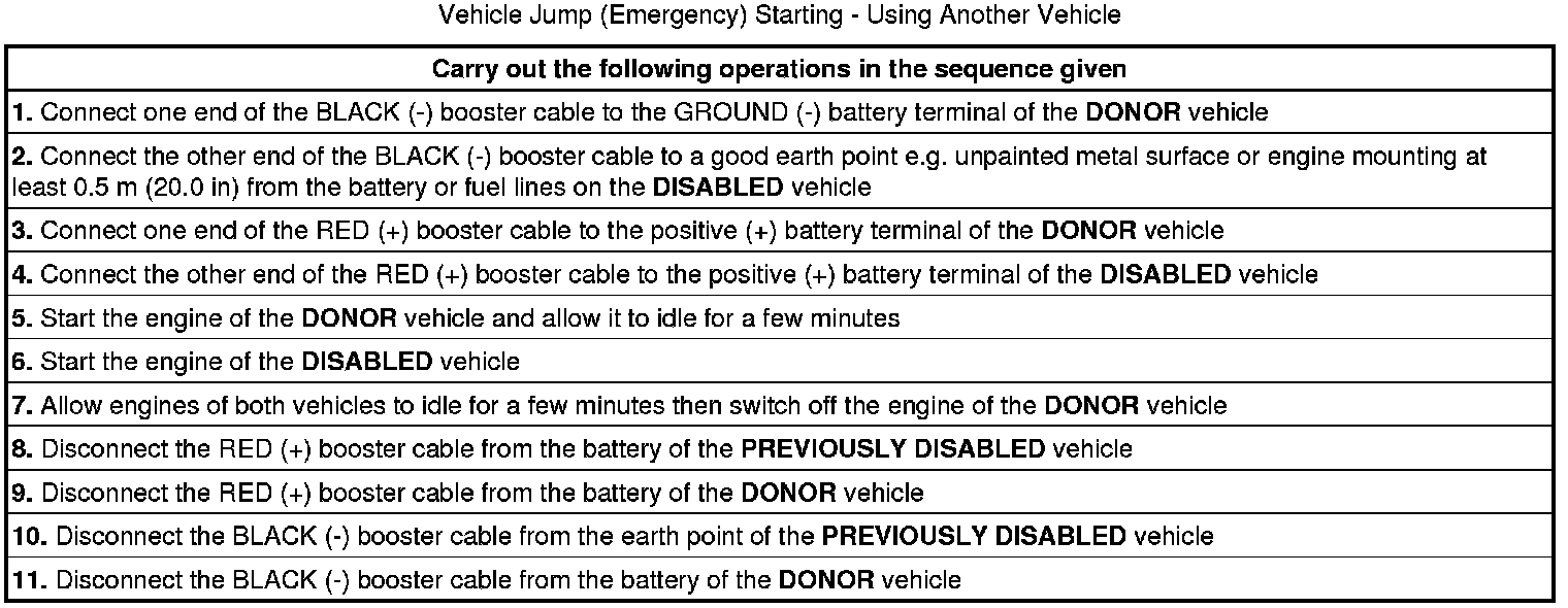 CAUTION: Ensure that the battery of the DONOR vehicle is of 12 volt capacity and that all electrical loads on the disabled vehicle are switched OFF prior to connecting booster cables.