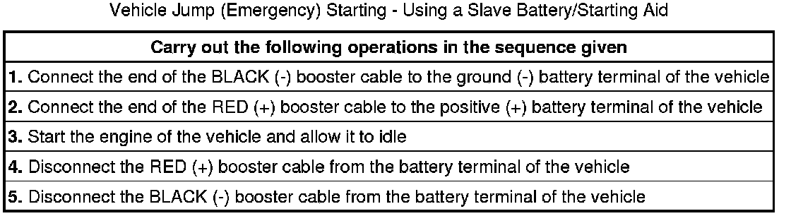 CAUTION: Ensure that the slave battery/starting aid are of 12 volt capacity and that all electrical loads on the disabled vehicle are switched OFF prior to connecting booster cables.