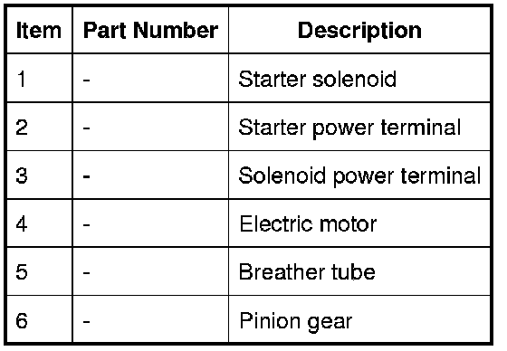 The starter motor is manufactured by Denso and is rated at 1.4 kW. The motor is geared directly to the pinion. The motor is a series wound motor with an overrunning clutch. The interior of the motor is ventilated through a breather tube attached to the rear of the engine.