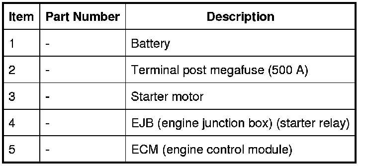 When the ECM (engine control module) receives a crank request, it energizes the starter relay in the EJB (engine junction box). The energized starter relay supplies 12 V power to energize the pull-in coil of the starter solenoid. Once activated, the pull-in coil engages the solenoid plunger, which engages the pinion gear with the ring gear. The plunger then closes the solenoid circuit, feeding power from the 500 A megafuse on the battery positive terminal to the starter motor.