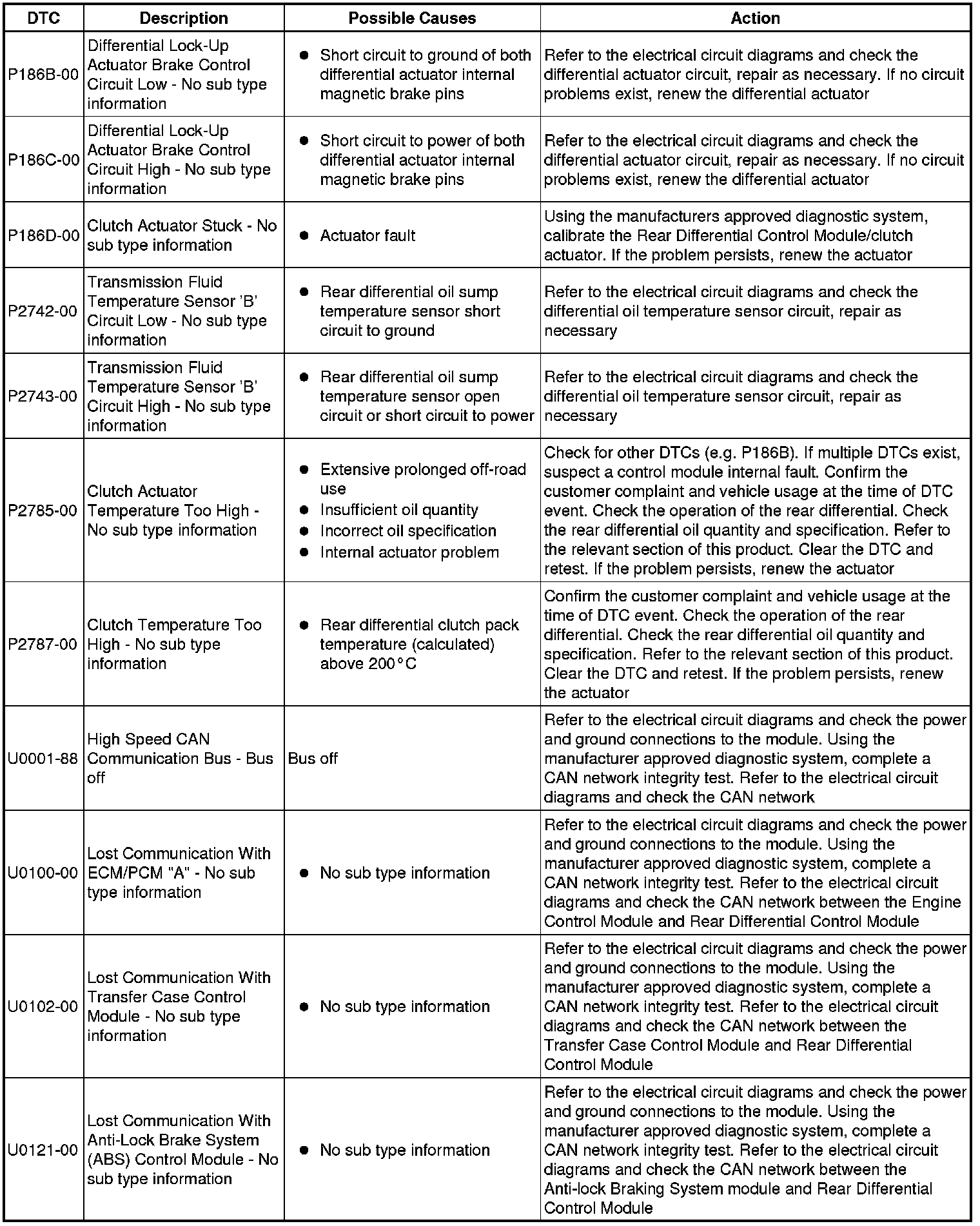 The table below lists all Diagnostic Trouble Codes (DTCs) that could be logged in the Rear Differential Control Module, for additional Diagnosis and Testing information refer to the relevant Diagnosis and Testing Section. For additional information, refer to Rear Drive Axle and Differential Initial Inspection and Diagnostic Overview