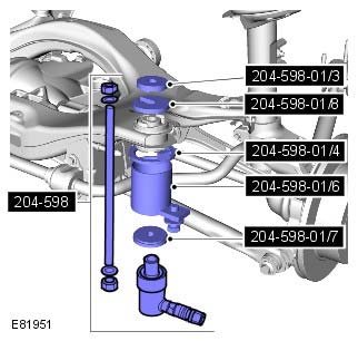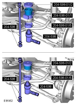 - Special tool 204-598-01/8 is used to start the bushing removal process, and must be removed after the bushing has released, as it will not pass through the subframe bushing aperture.