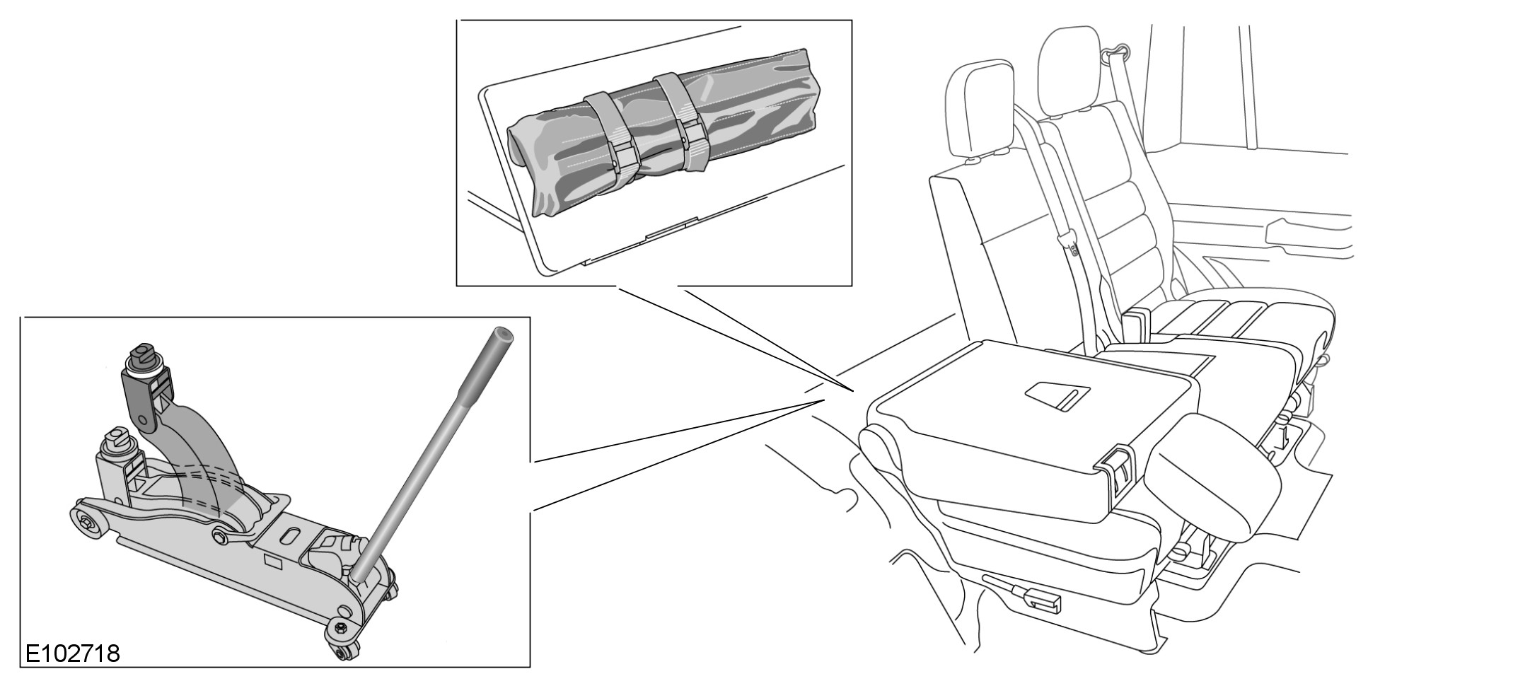 The trolley jack and lever are stowed behind the rear seats under the hinged forward section of floor. The wheel changing tool kit is in a small bag, stowed in the same area.