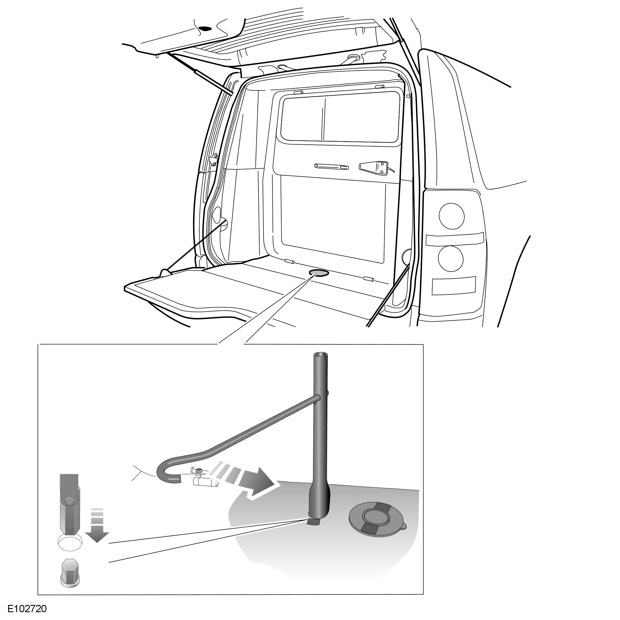 The spare wheel is stowed underneath the vehicle in the same position as on a standard vehicle. The winch used for lowering the spare wheel is accessed through the access port in the rear loadspace area.