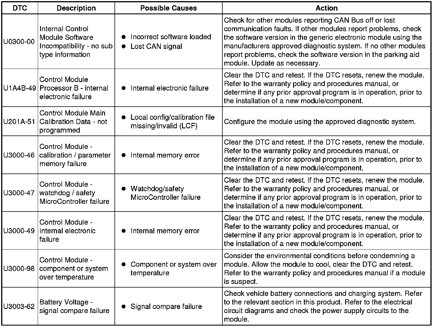 The table below lists all Diagnostic Trouble Codes (DTCs) that could be logged in the Image Processing Module B, for additional Diagnosis and Testing information refer to the relevant Diagnosis and Testing Section. For additional information, refer to Information and Entertainment System Information and Entertainment System Inspection and Verification