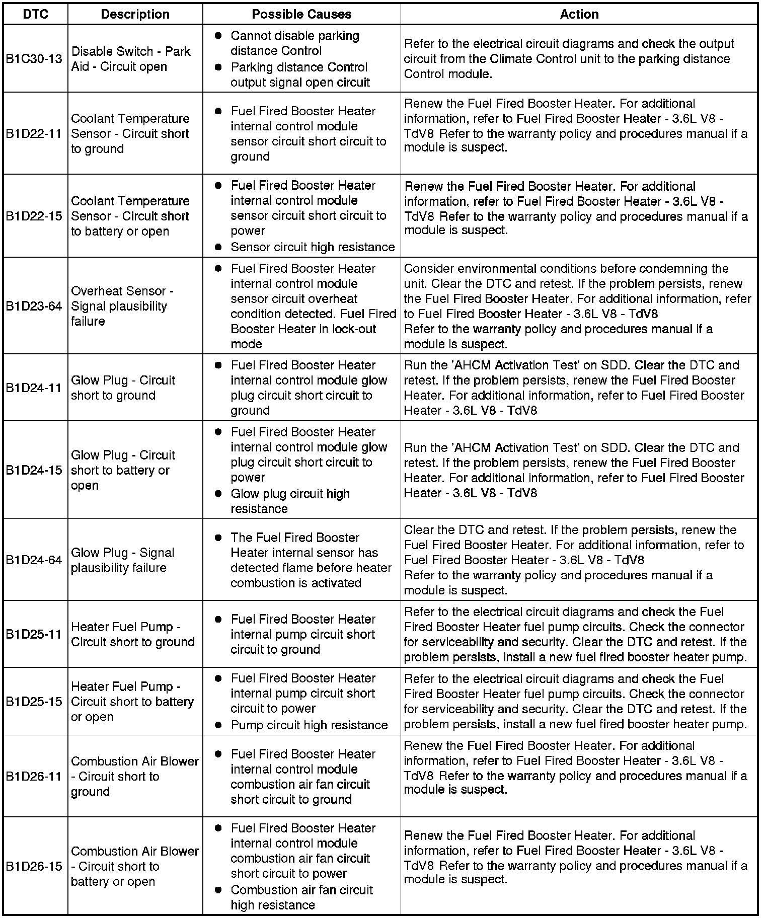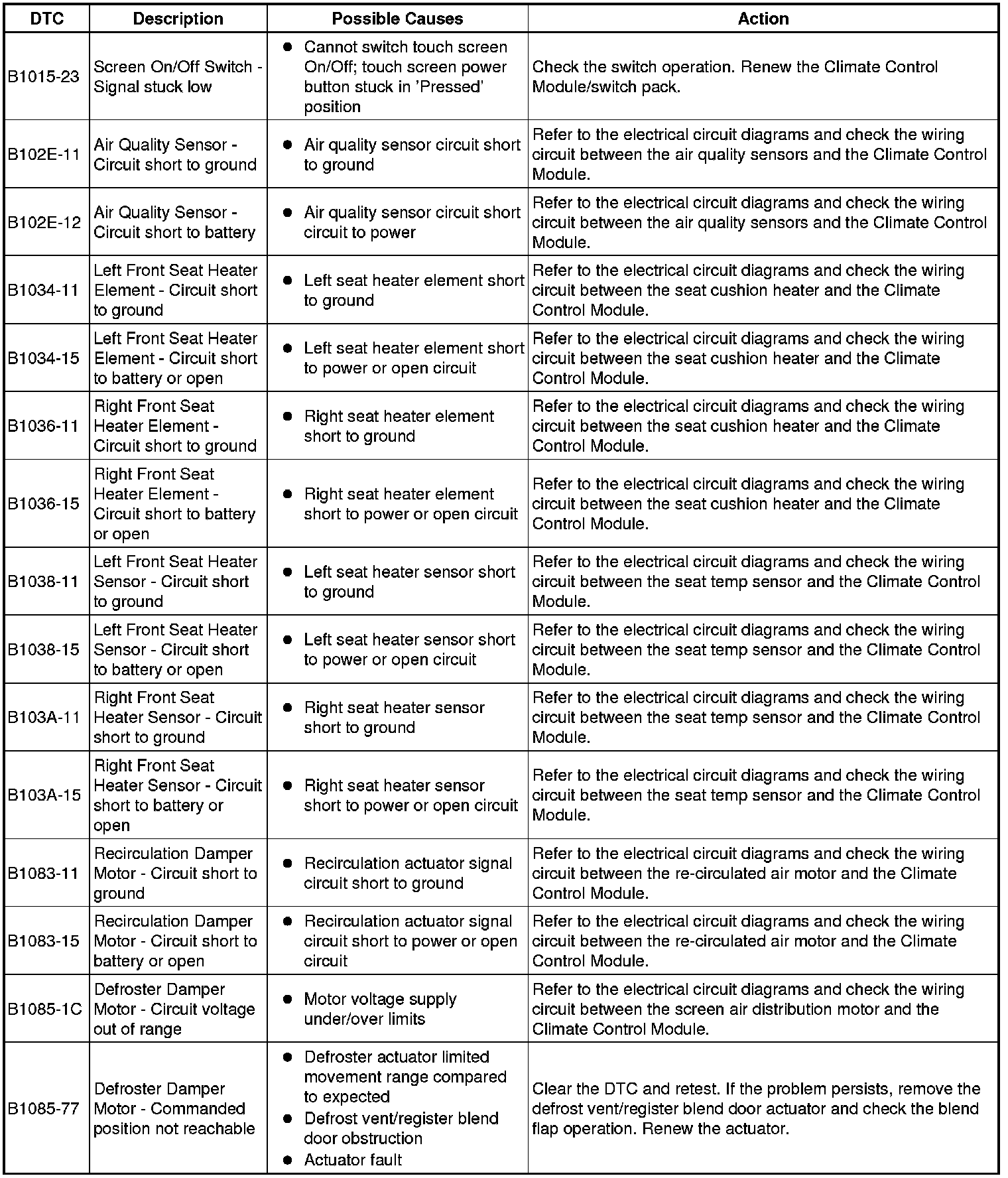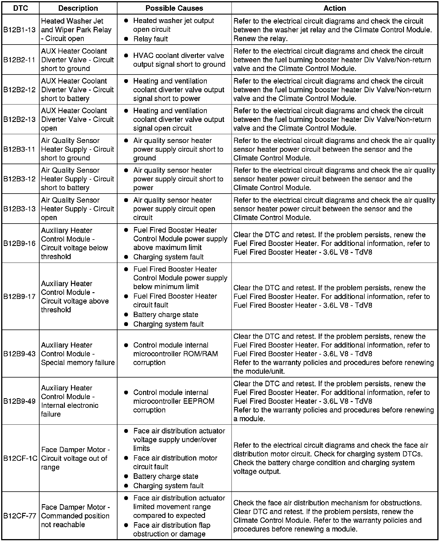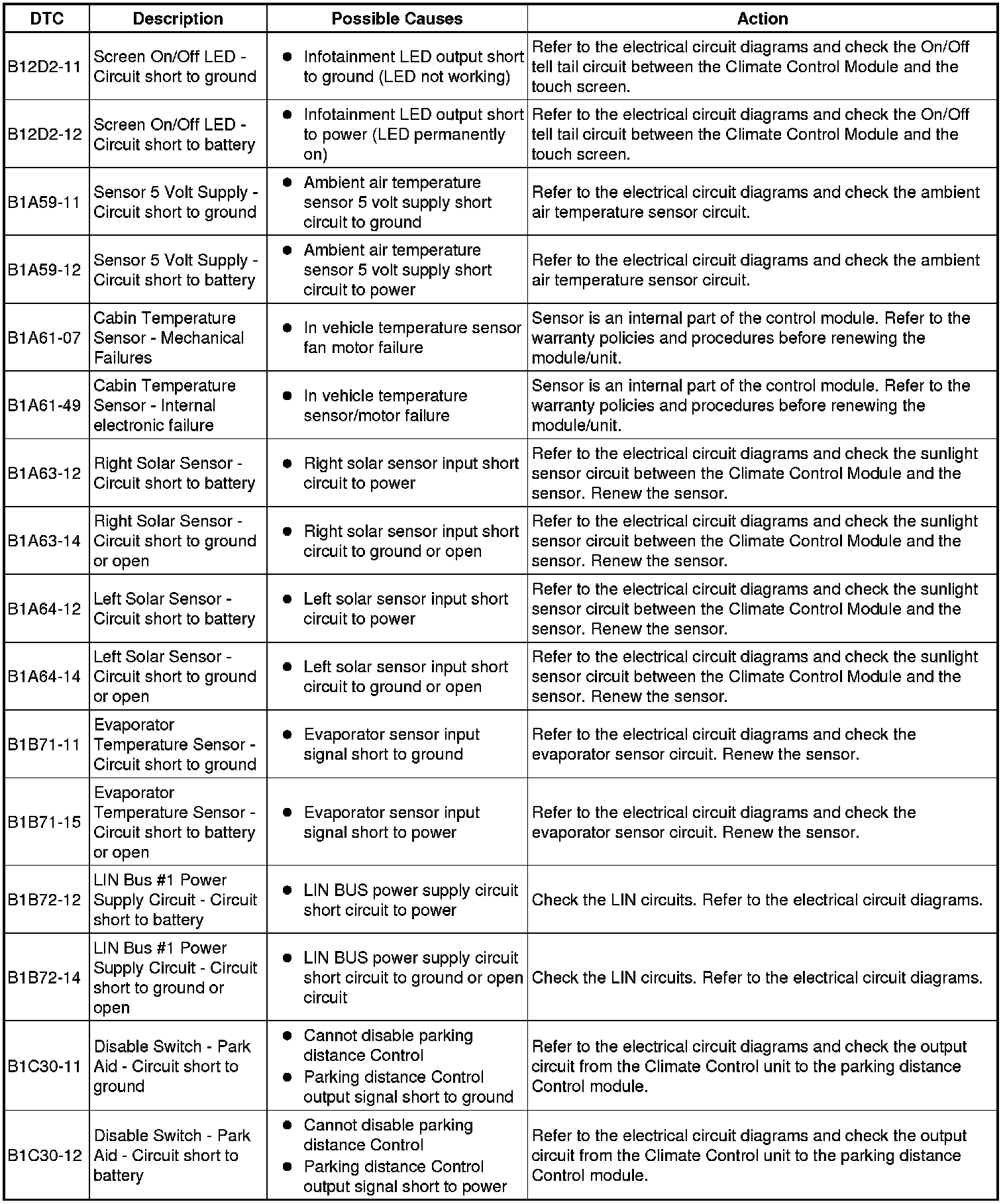 The table below lists all Diagnostic Trouble Codes (DTCs) that could be logged in the Climate Control Module, for additional Diagnosis and Testing information refer to the relevant Diagnosis and Testing Section. For additional information, refer to Climate Control System Testing and Inspection