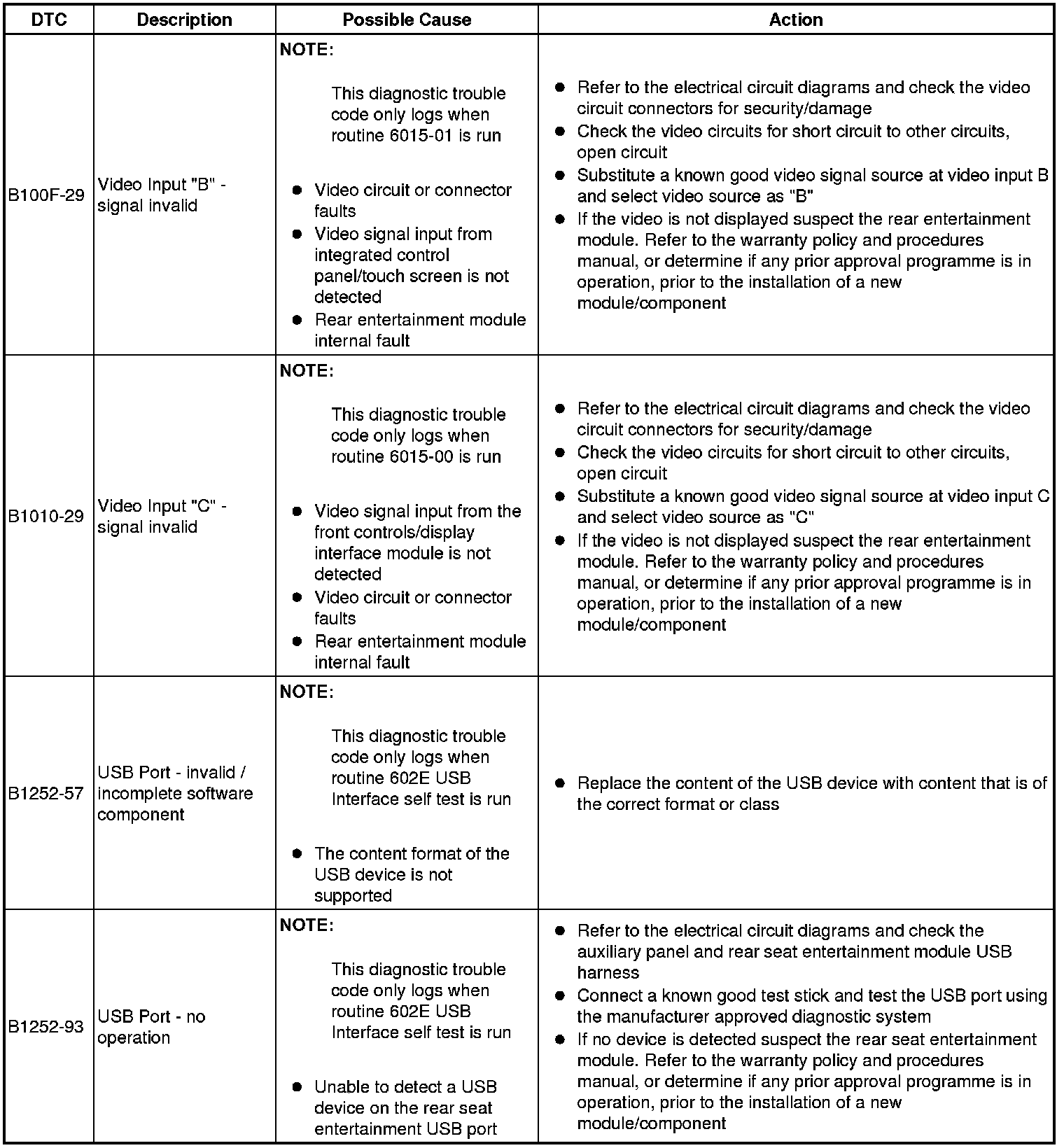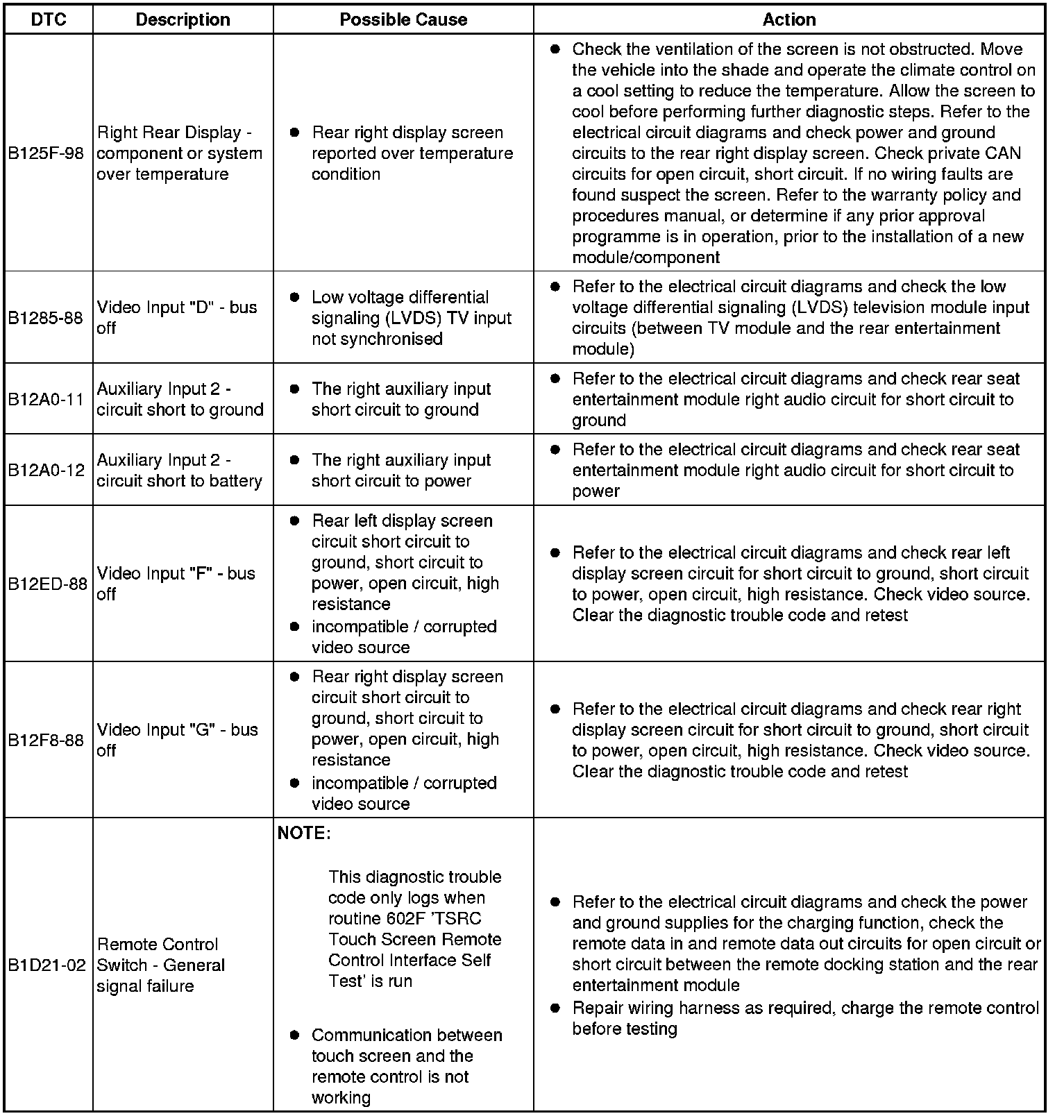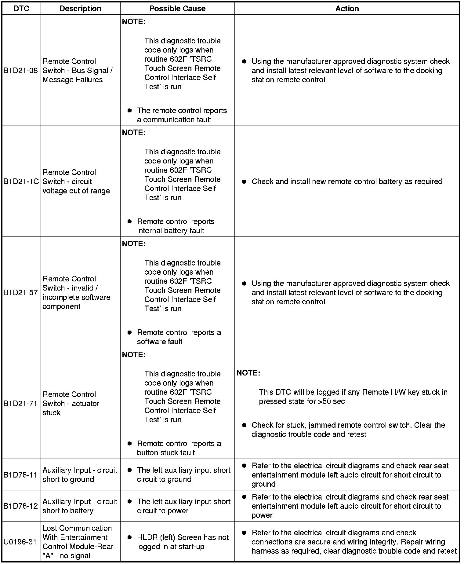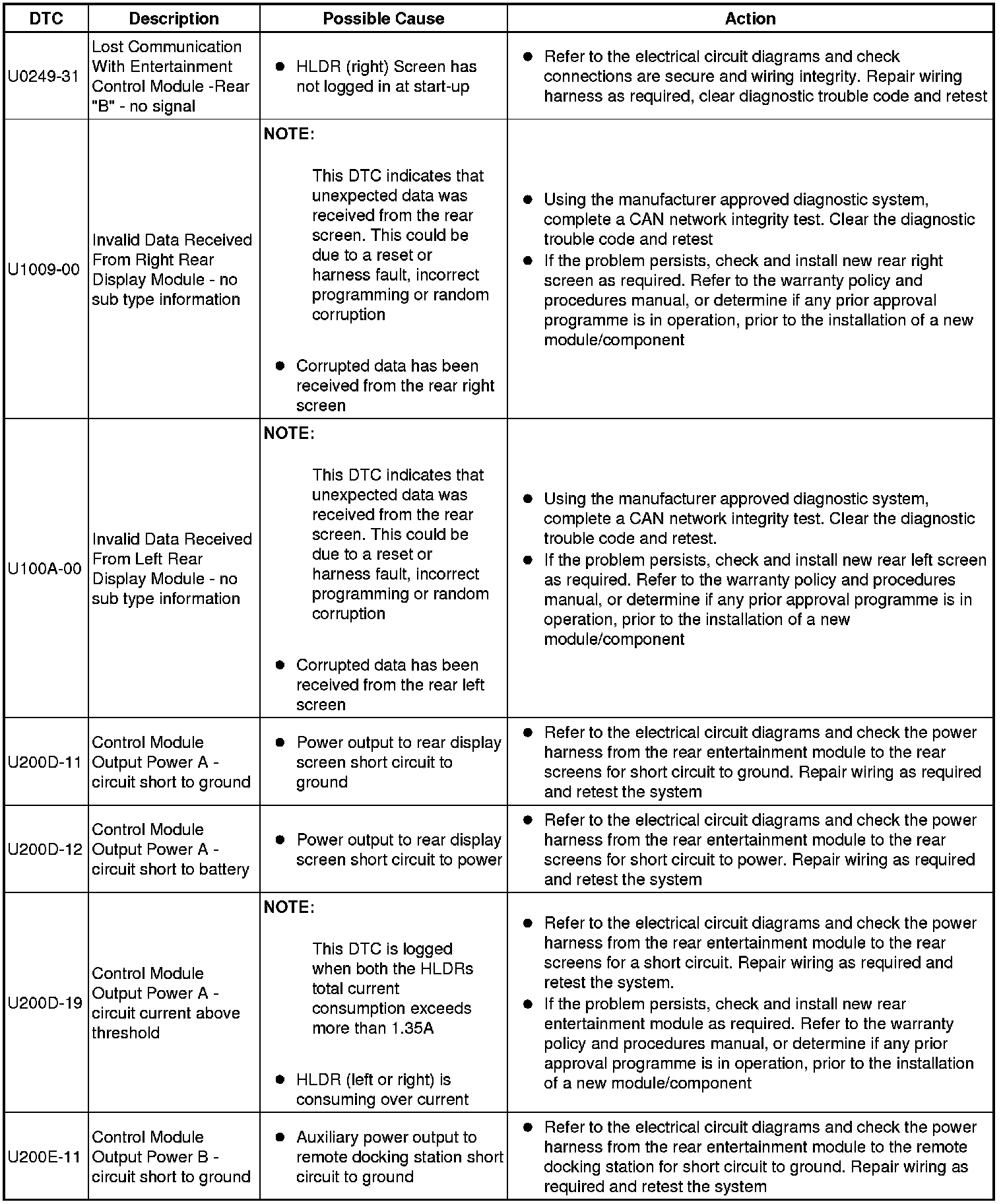The table below lists all Diagnostic Trouble Codes (DTCs) that could be logged in the Rear Entertainment Module, for additional Diagnosis and Testing information refer to the relevant Diagnosis and Testing Section. For additional information, refer to Information and Entertainment System Testing and Inspection