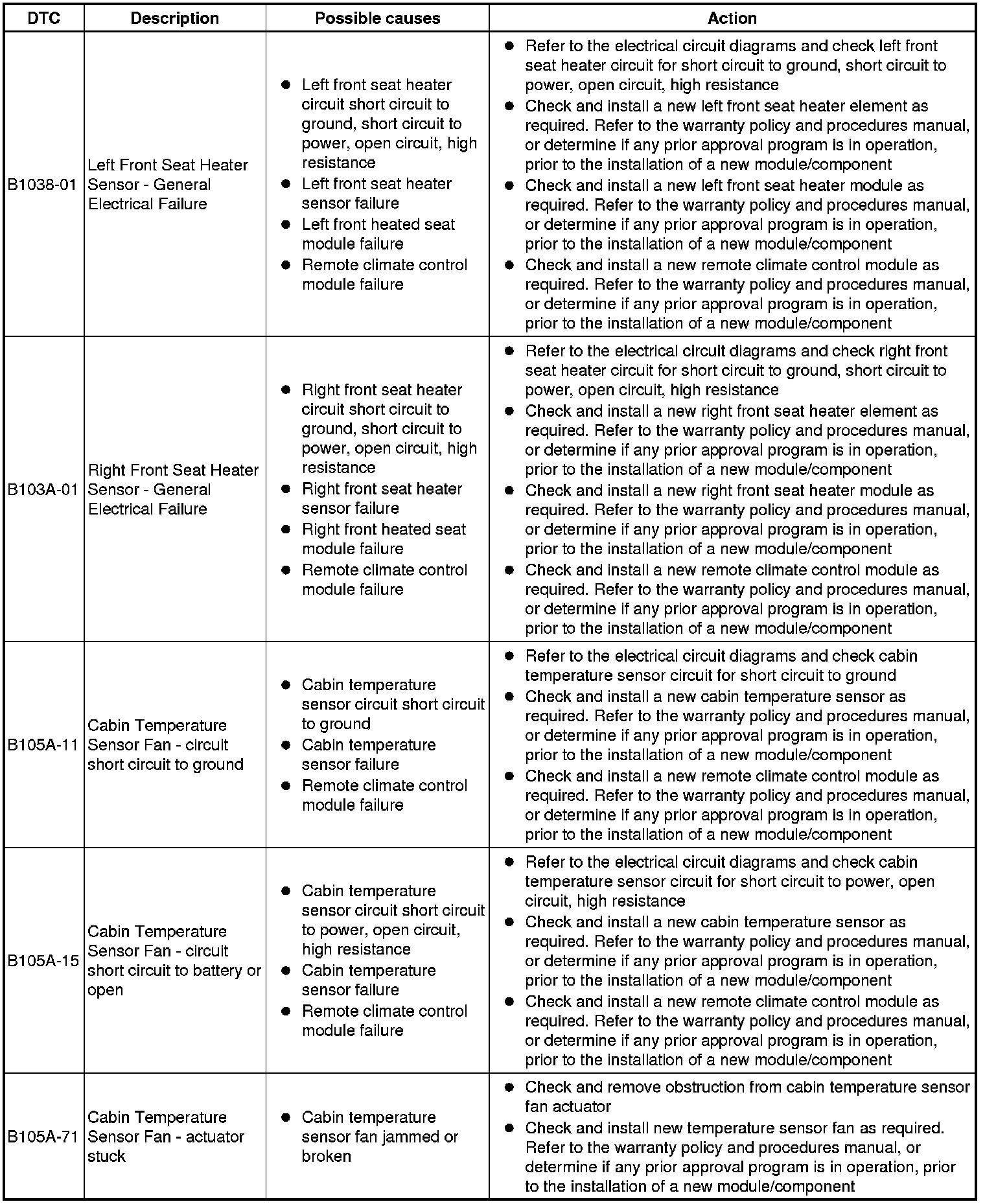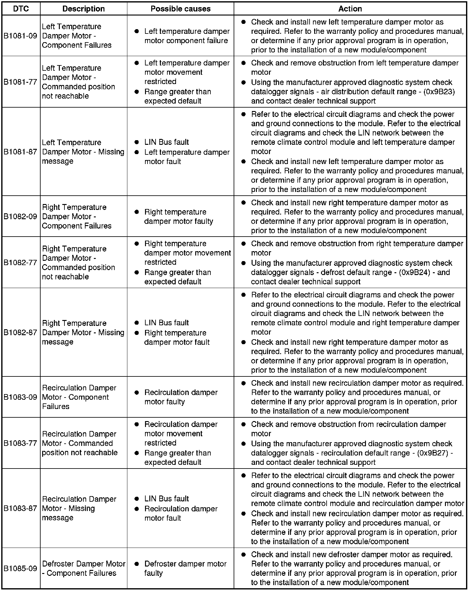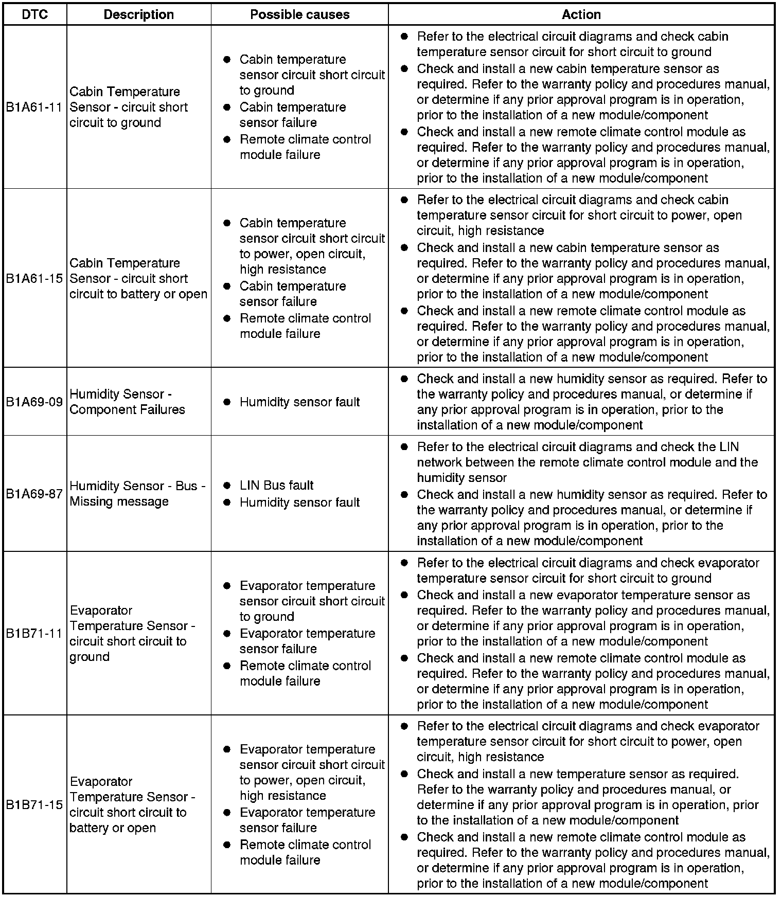 The table below lists all diagnostic trouble codes (DTCs) that could be logged in the heating ventilation air conditioning control module, for additional diagnosis and testing information refer to the relevant diagnosis and testing section. For additional information, refer to Climate Control System Climate Control System