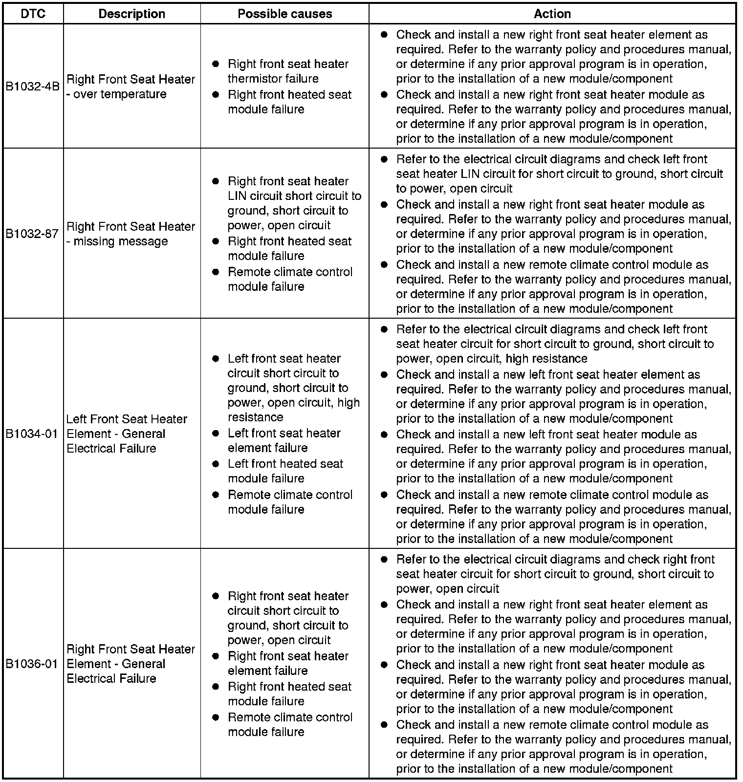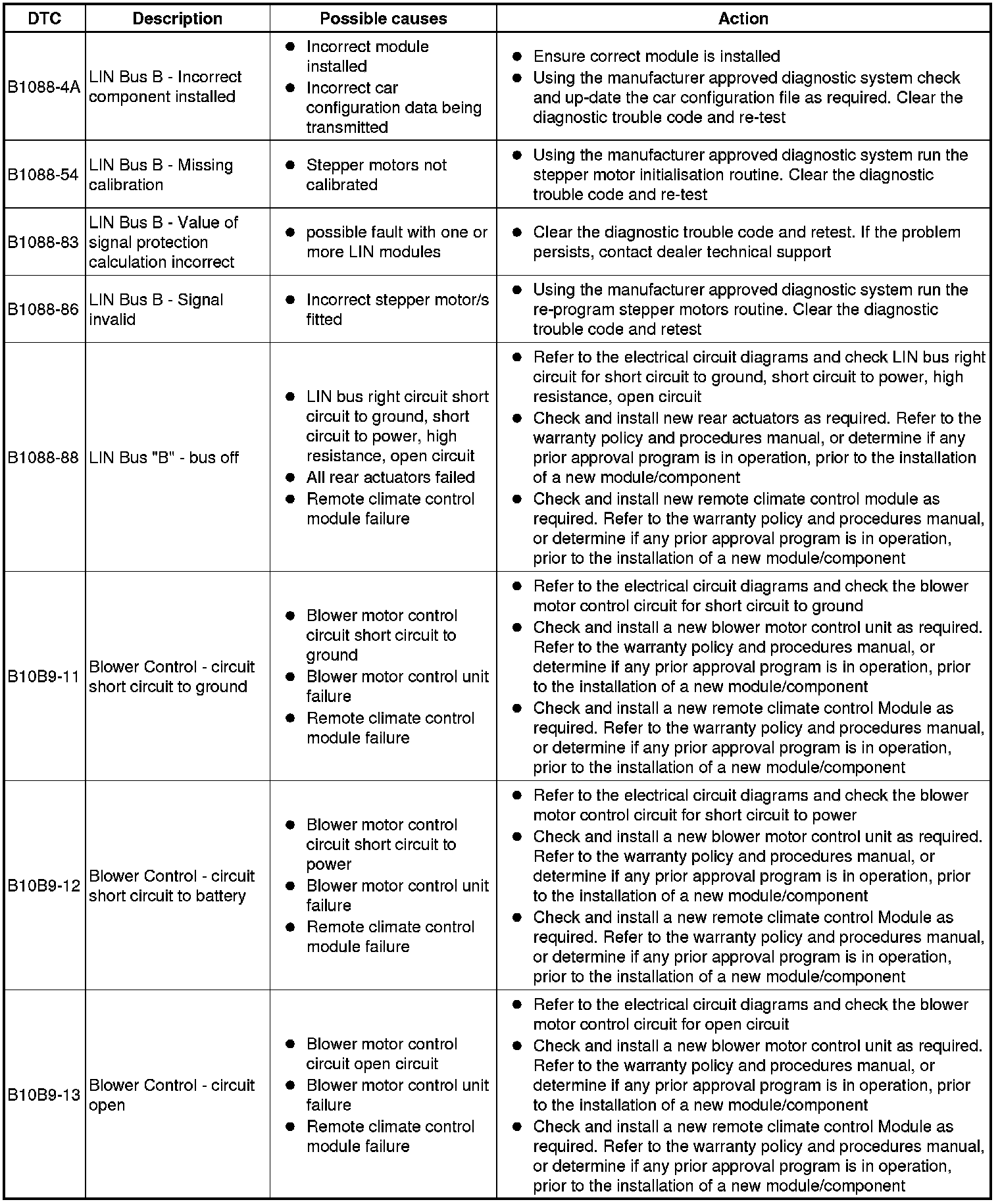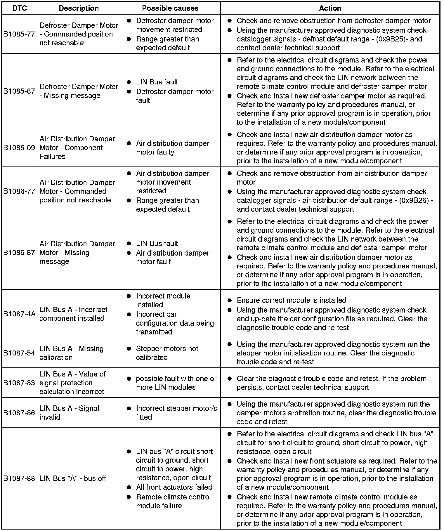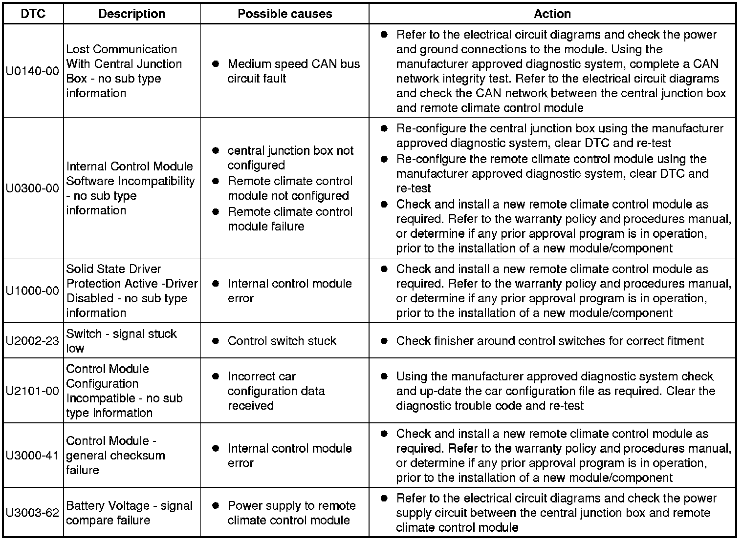 The table below lists all diagnostic trouble codes (DTCs) that could be logged in the heating ventilation air conditioning control module, for additional diagnosis and testing information refer to the relevant diagnosis and testing section. For additional information, refer to Climate Control System Climate Control System