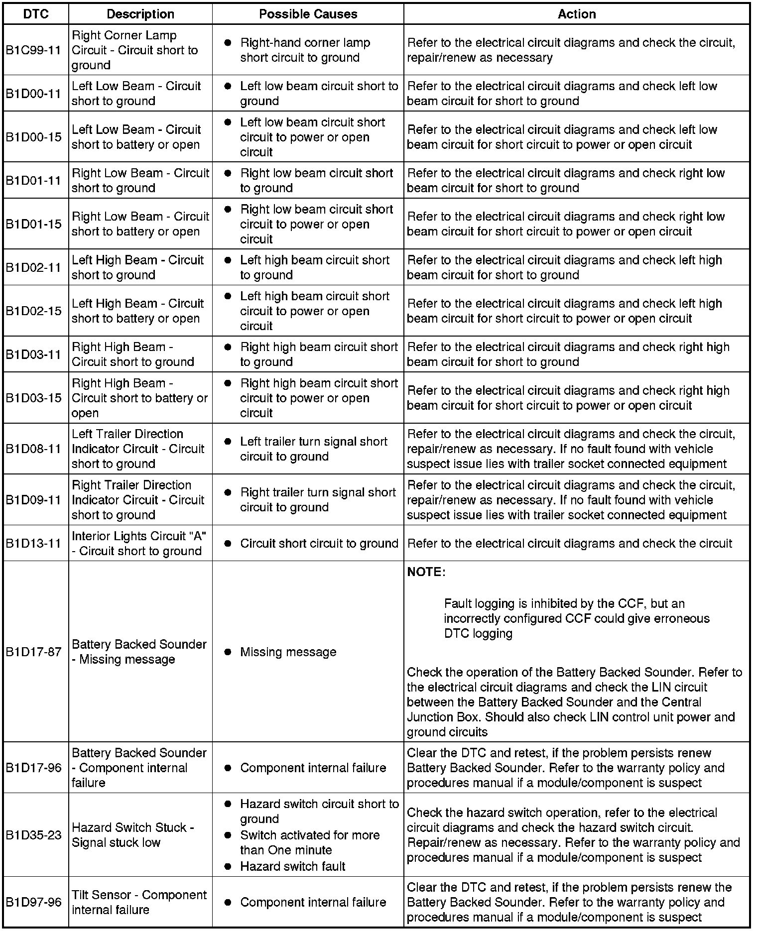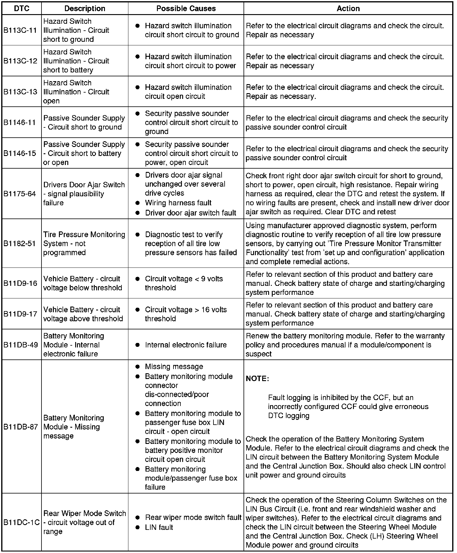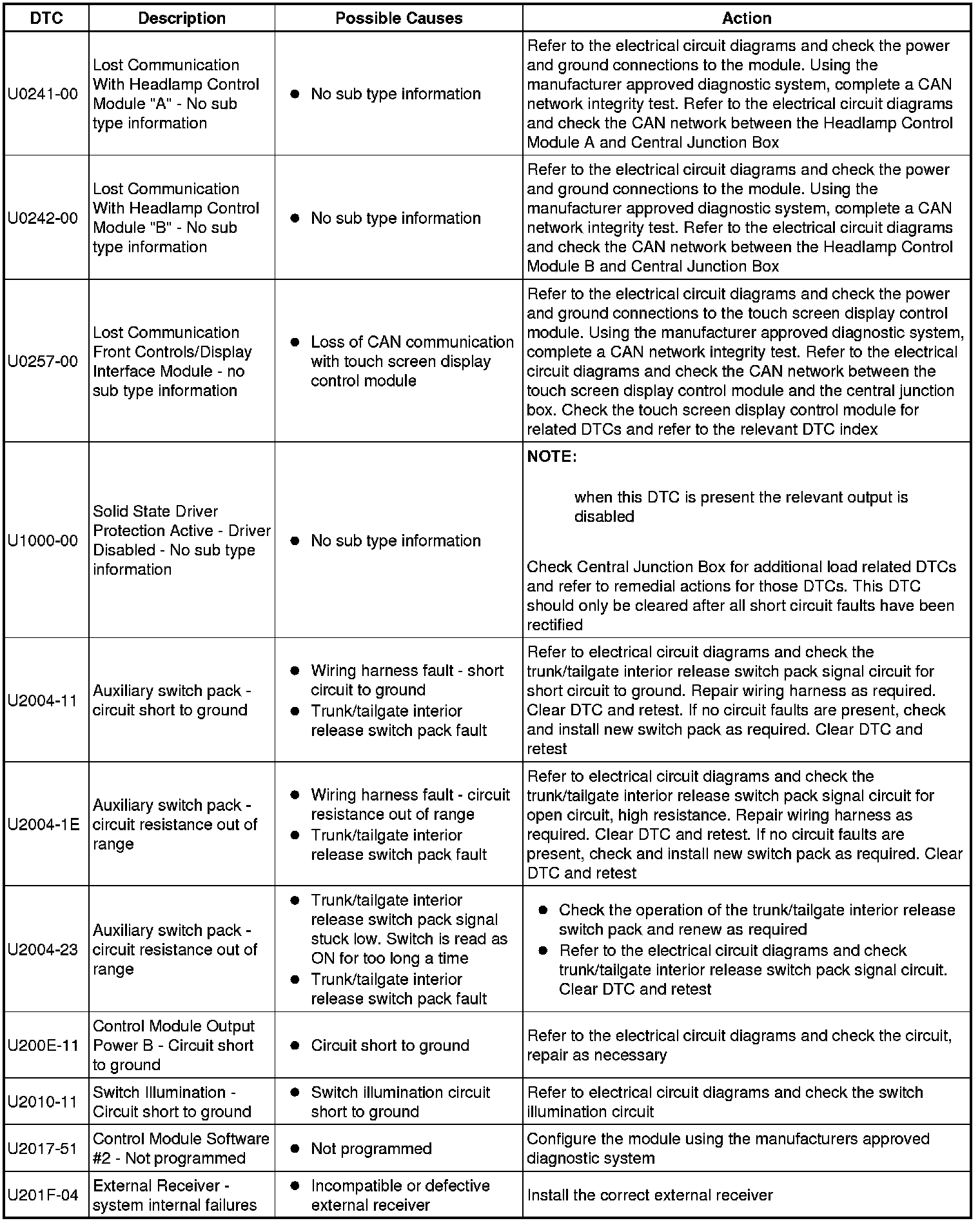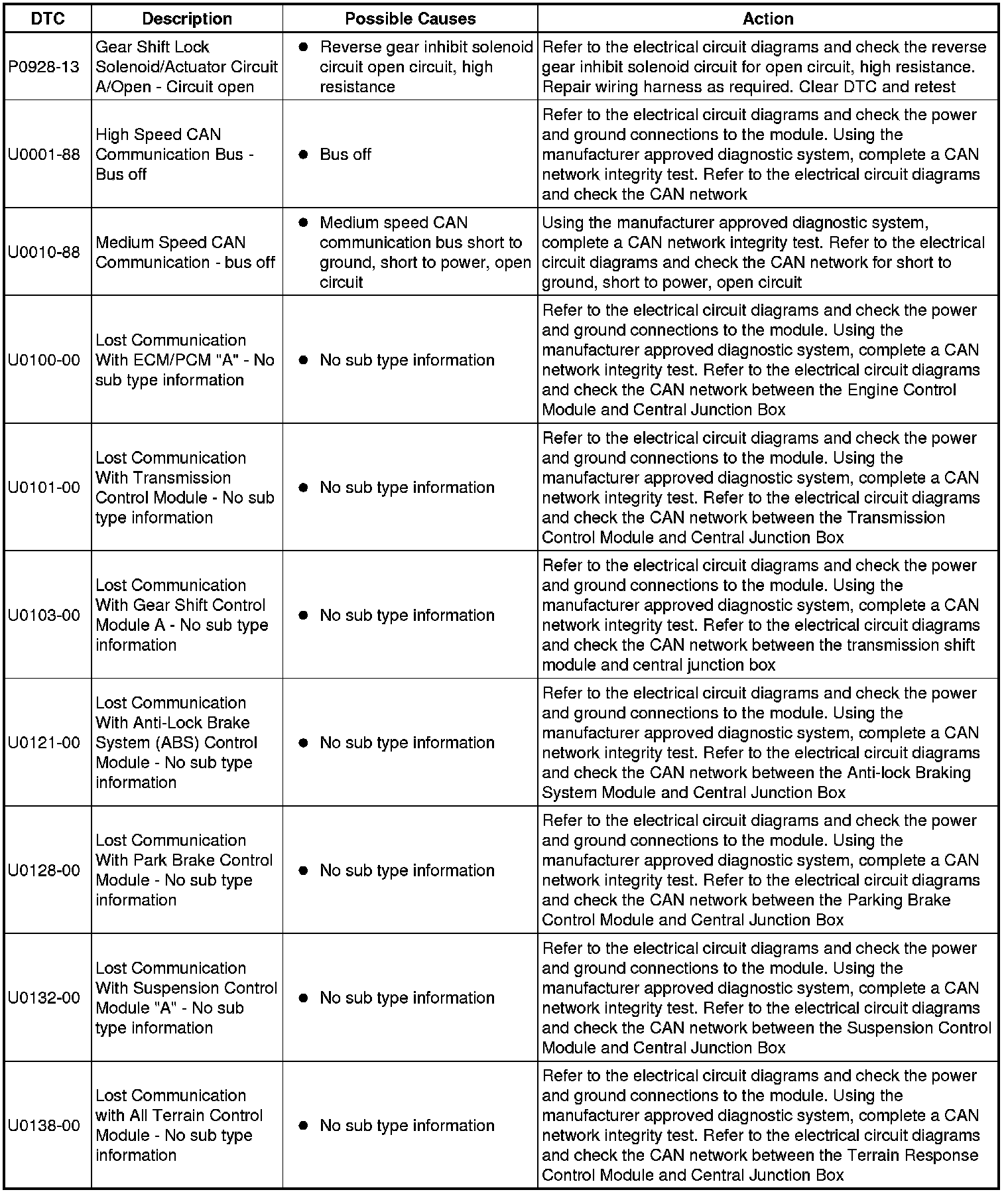 The table below lists all diagnostic trouble codes (DTCs) that could be logged in the central junction box, for additional information refer to the relevant Description and Operation section. For additional information, refer to Communications Network Overview