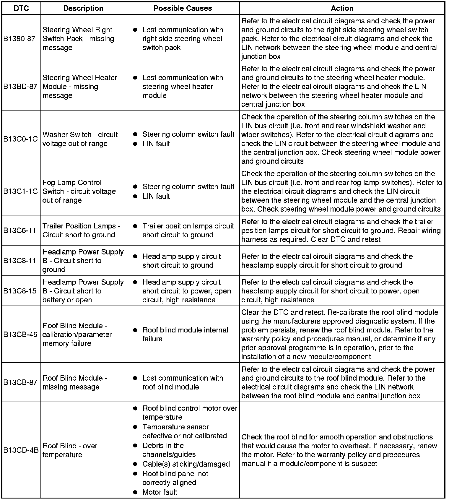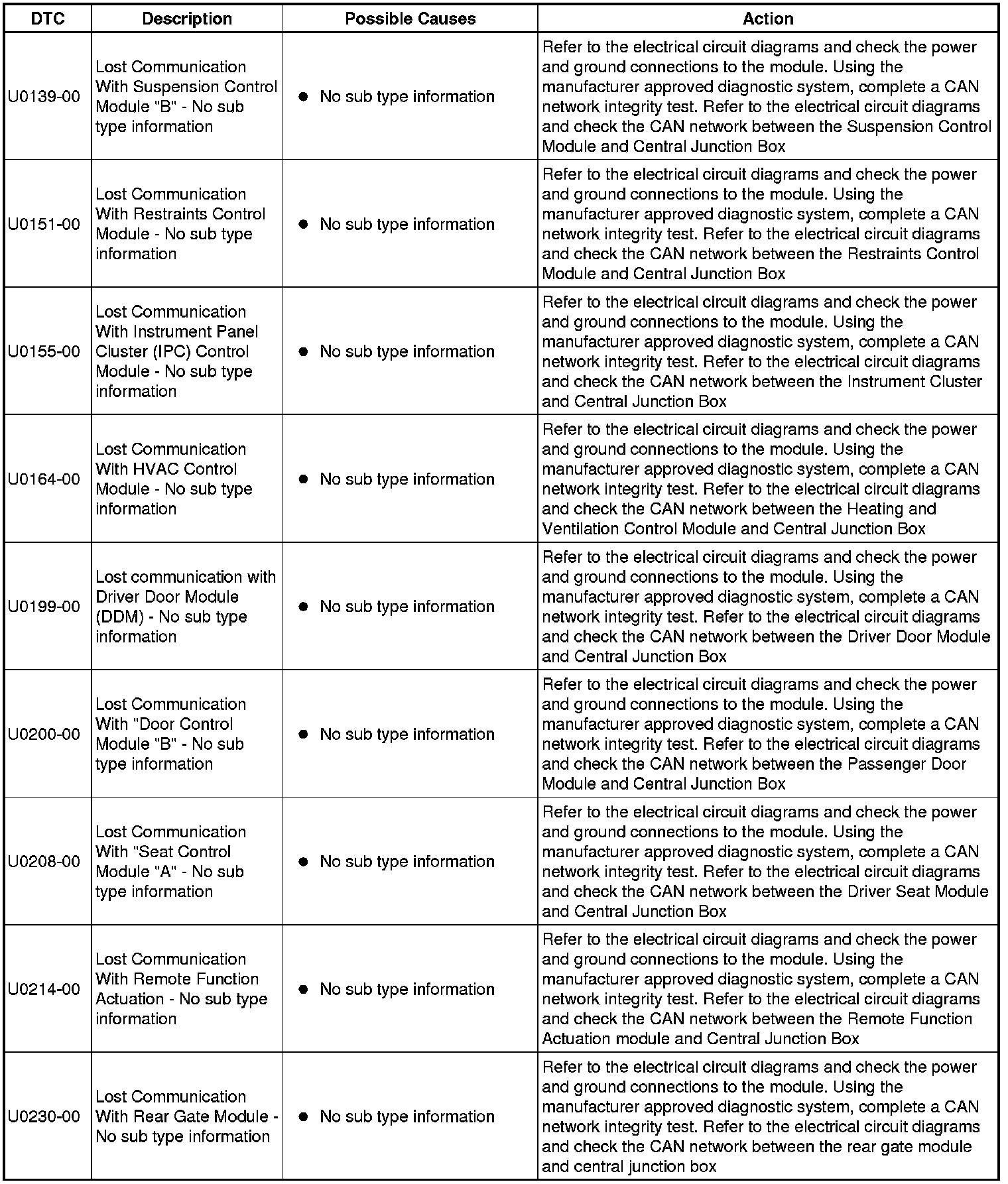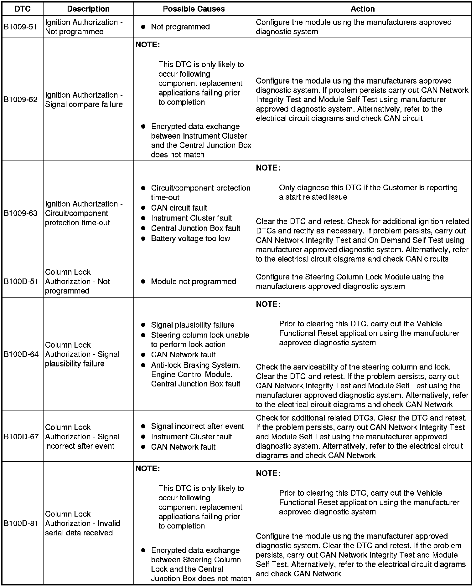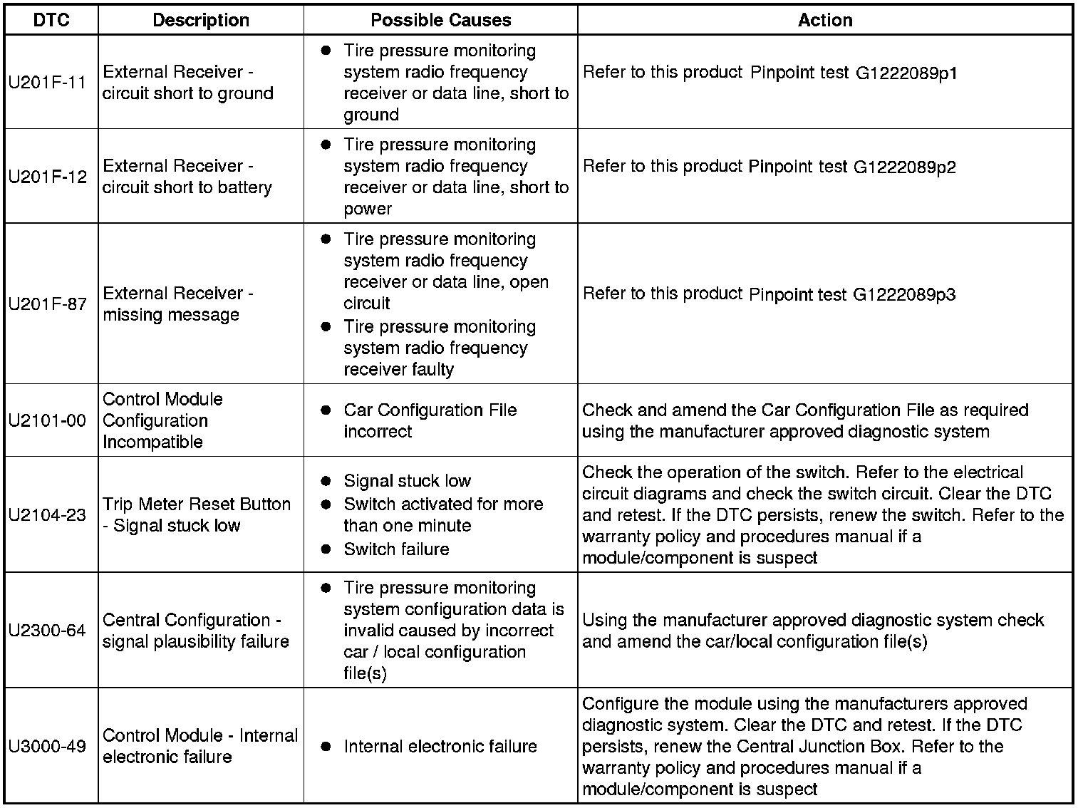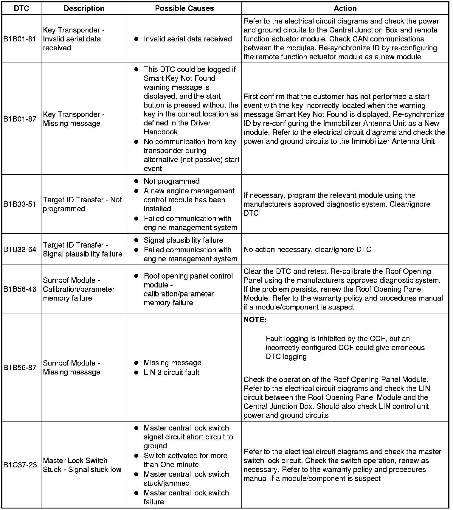 The table below lists all diagnostic trouble codes (DTCs) that could be logged in the central junction box, for additional information refer to the relevant Description and Operation section. For additional information, refer to Communications Network Overview