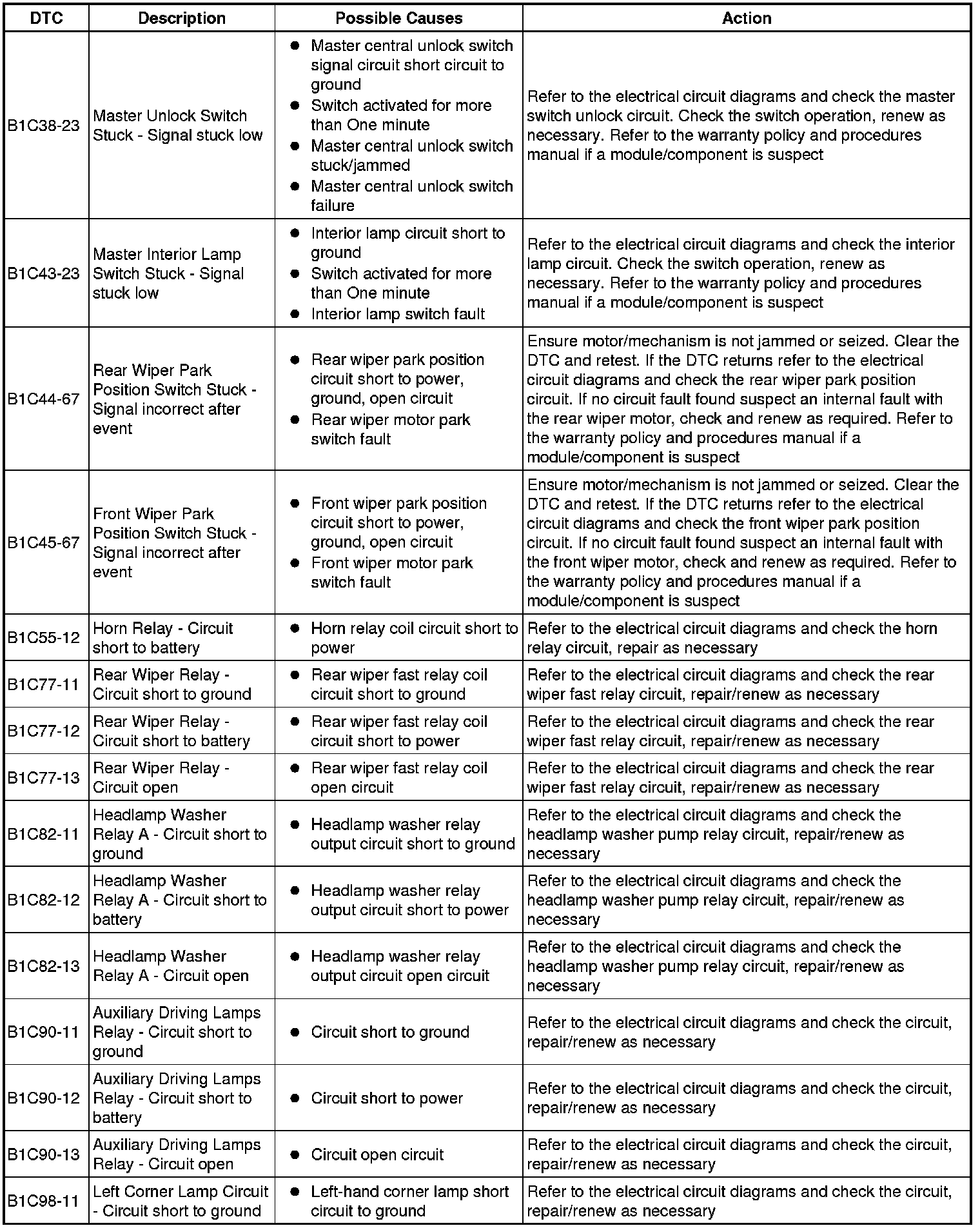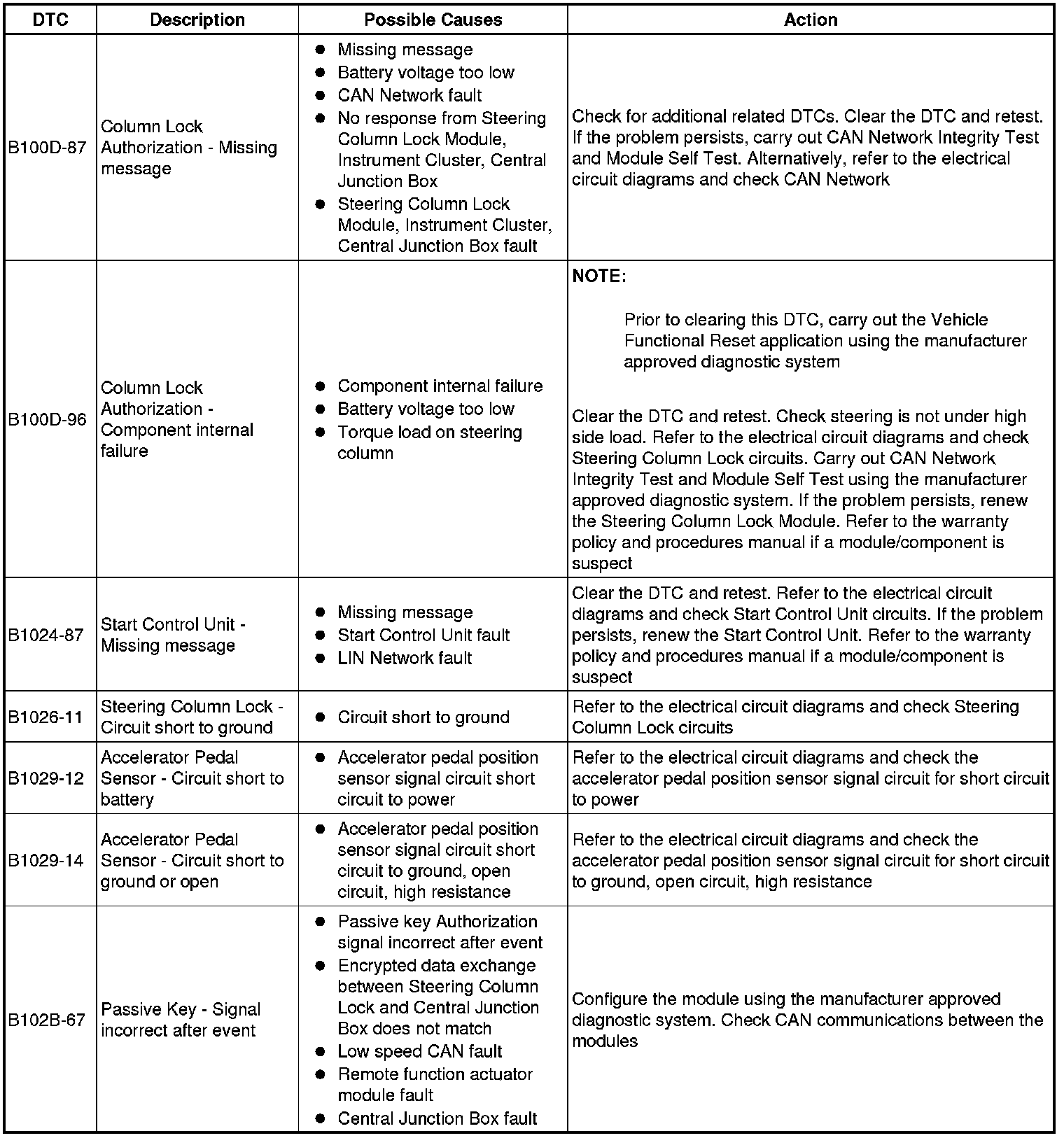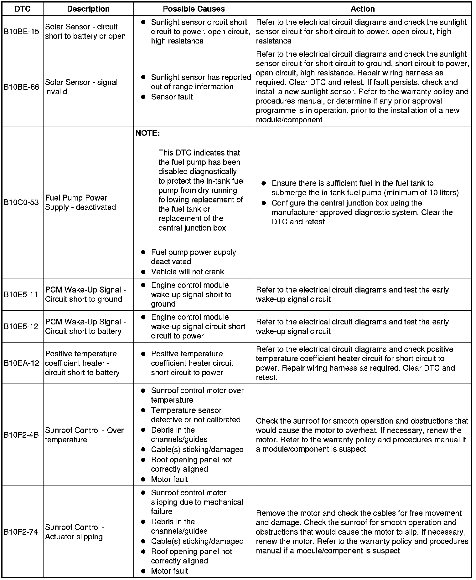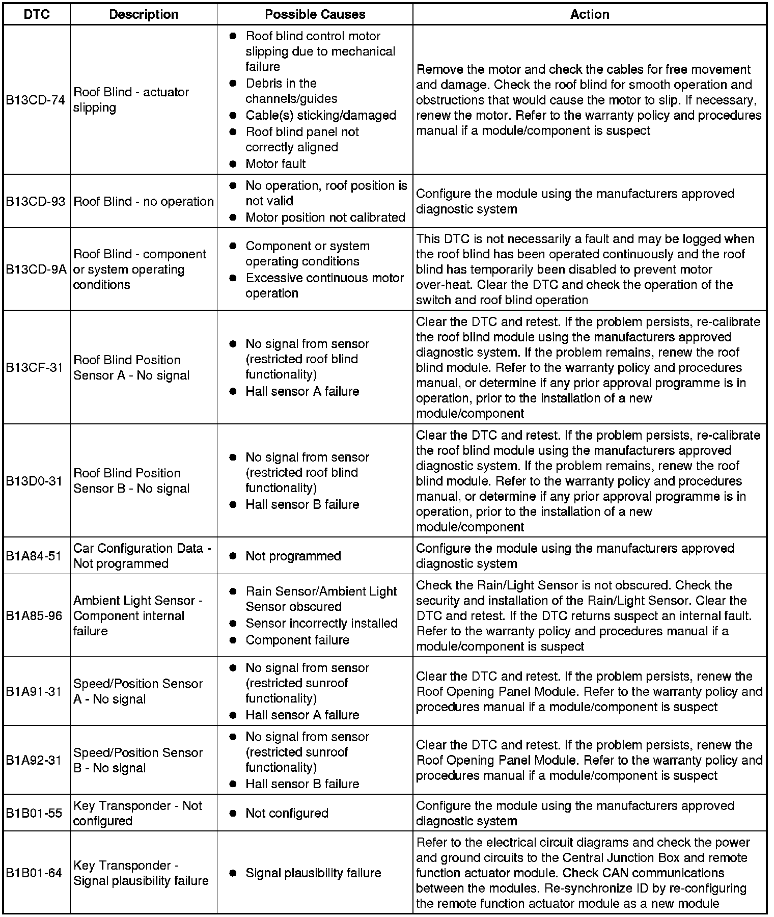 The table below lists all diagnostic trouble codes (DTCs) that could be logged in the central junction box, for additional information refer to the relevant Description and Operation section. For additional information, refer to Communications Network Overview