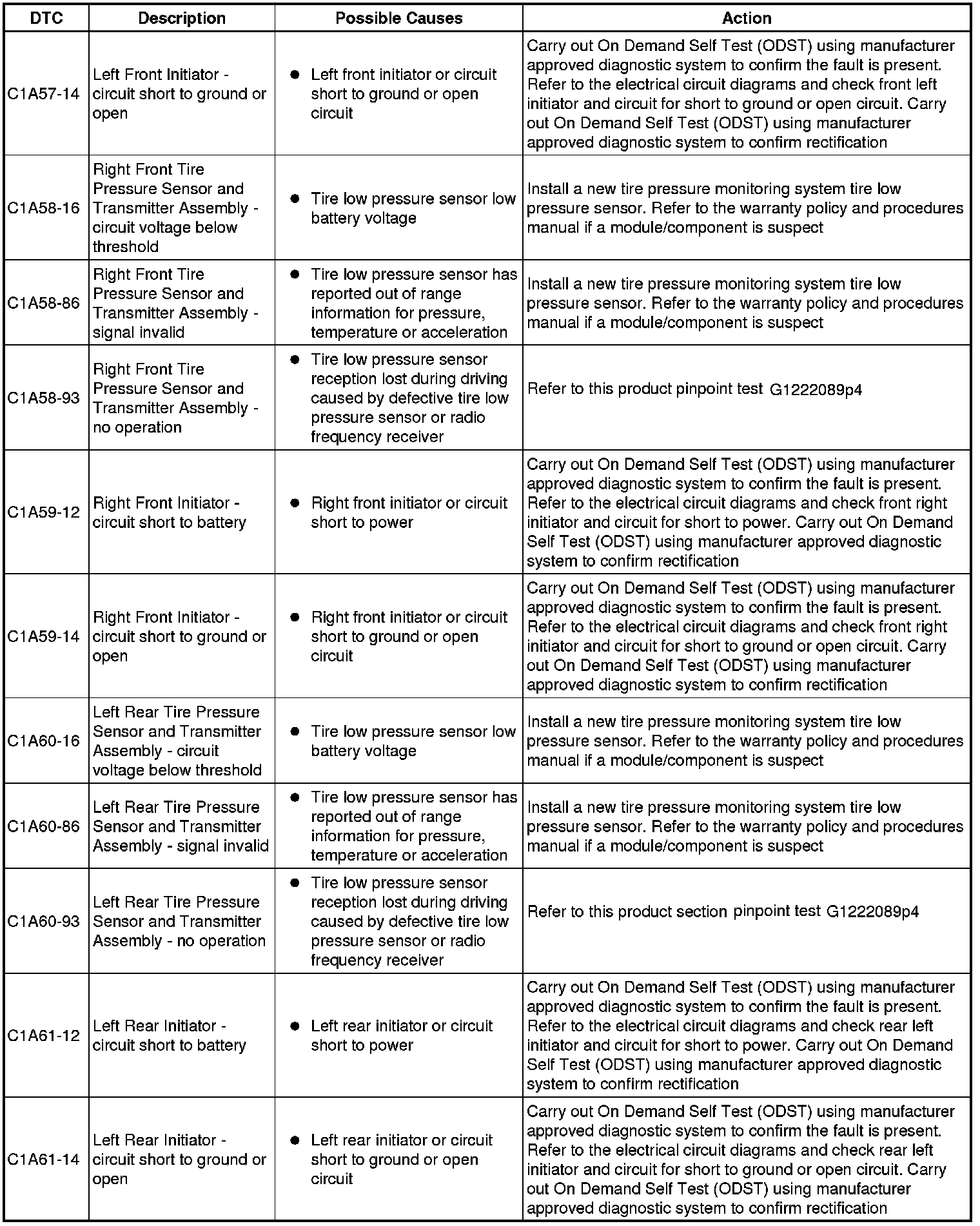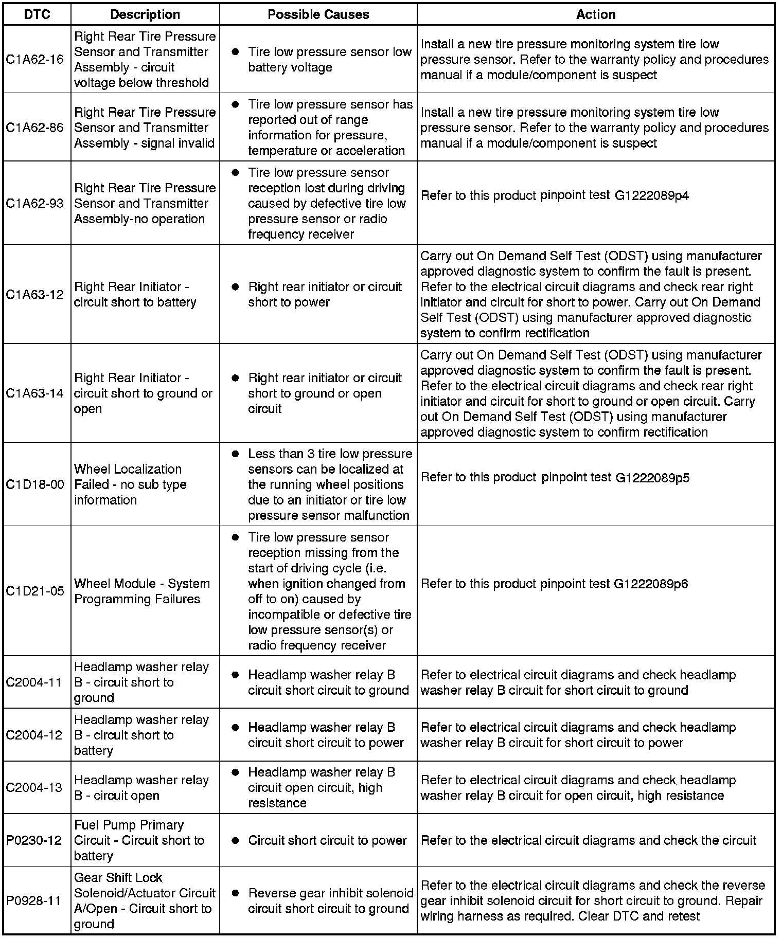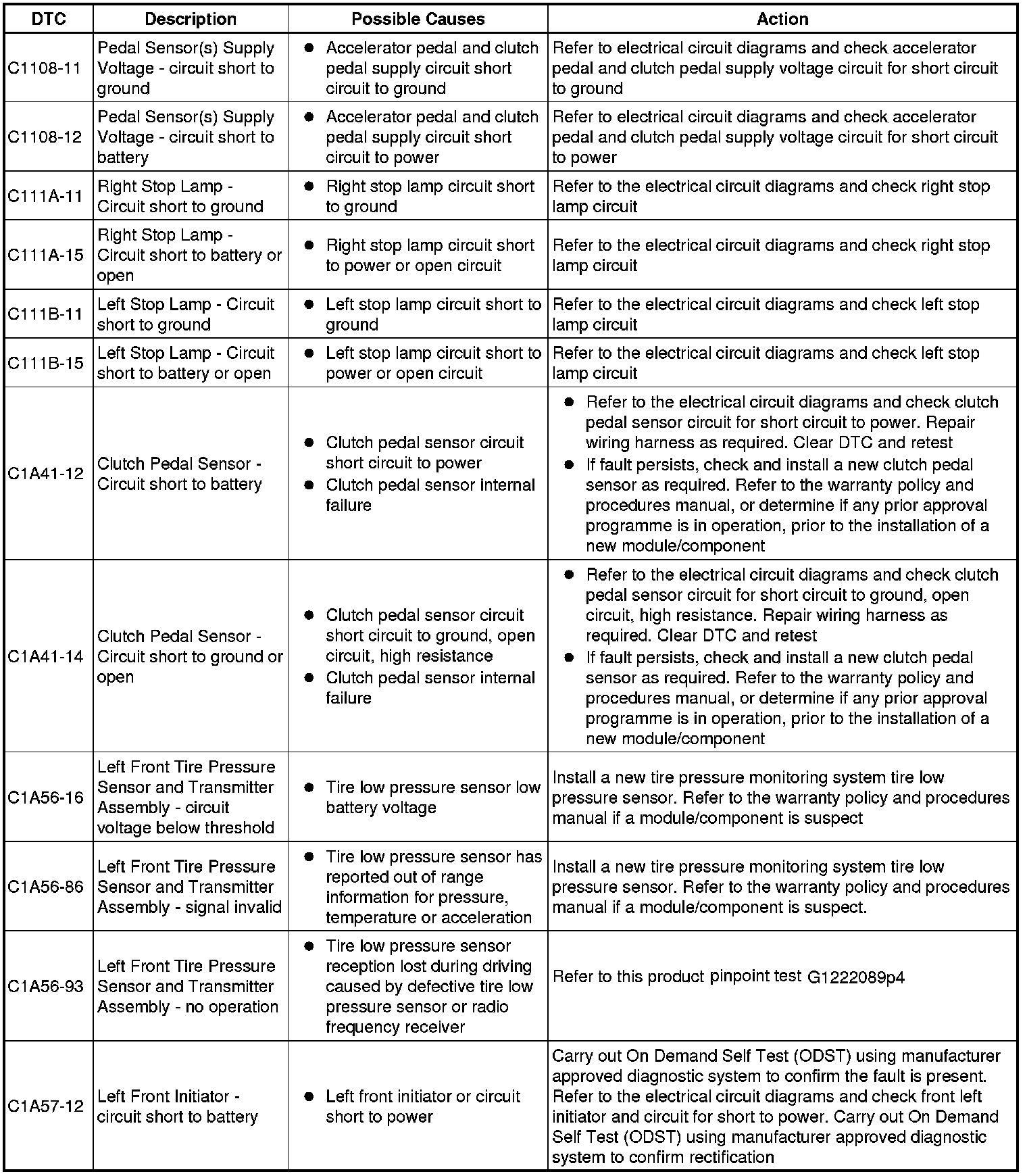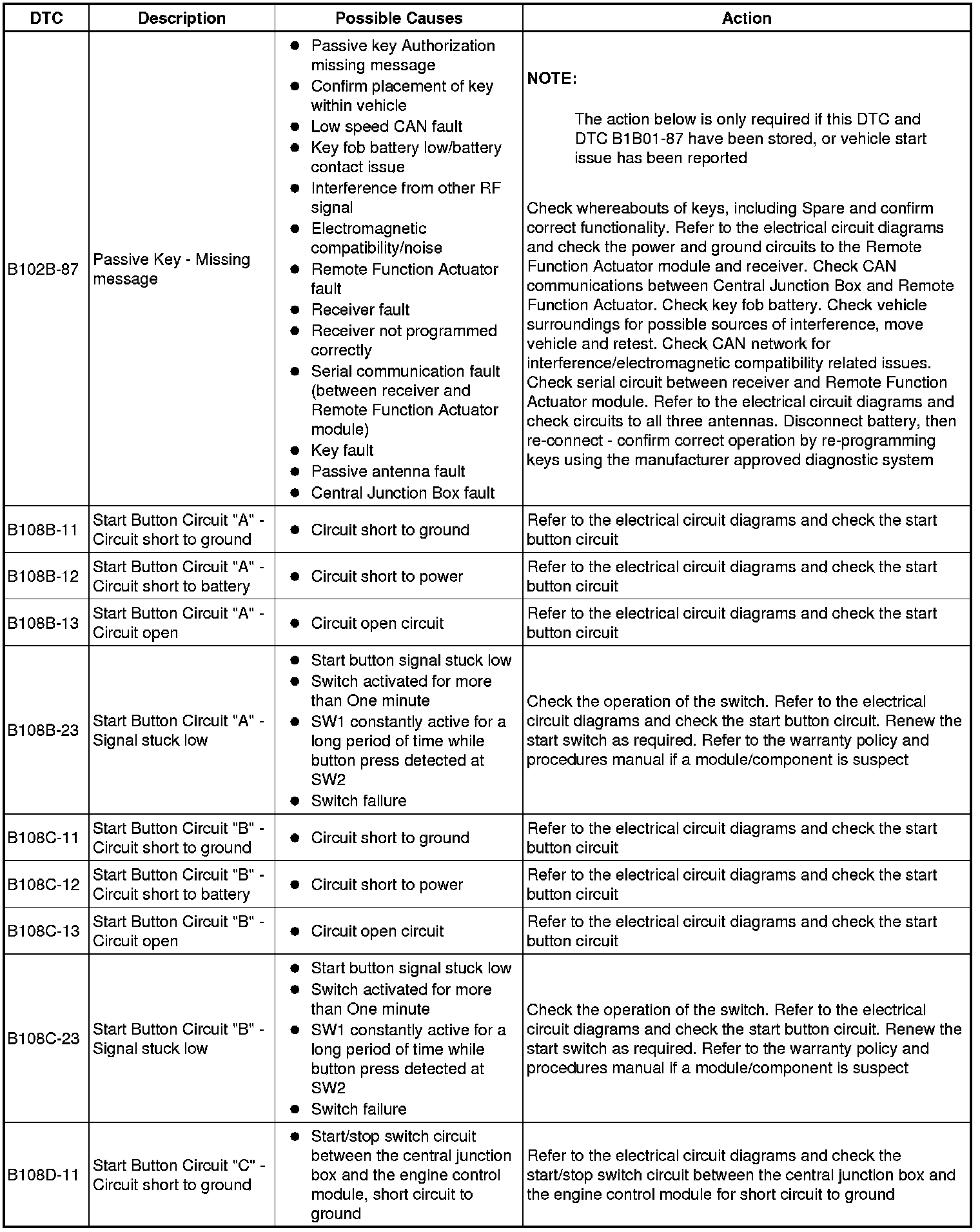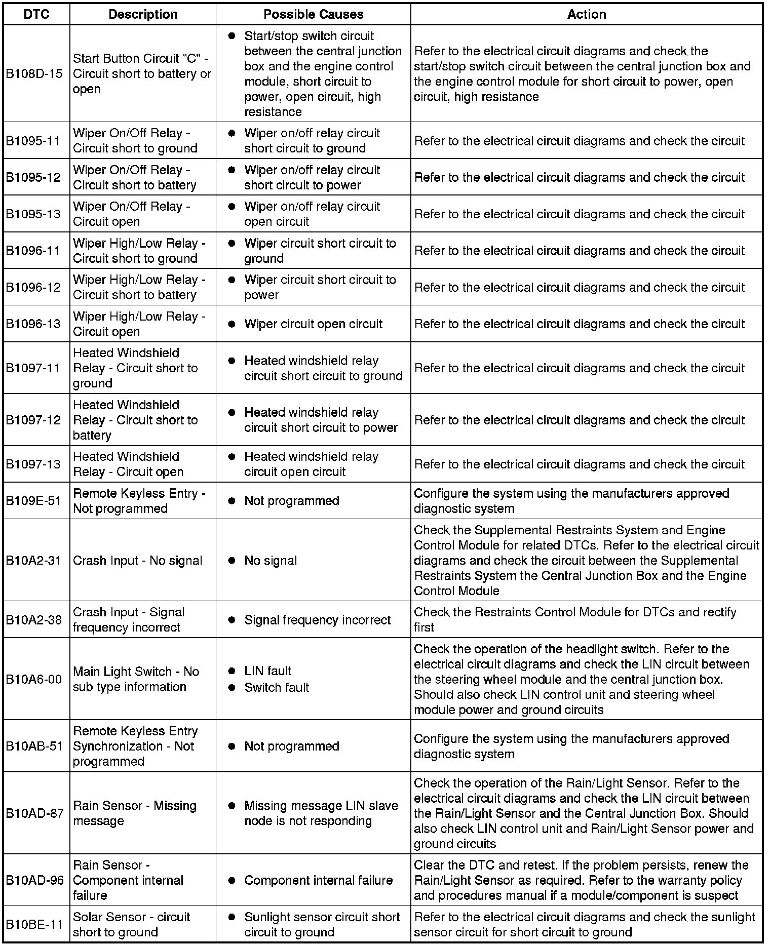 The table below lists all diagnostic trouble codes (DTCs) that could be logged in the central junction box, for additional information refer to the relevant Description and Operation section. For additional information, refer to Communications Network Overview