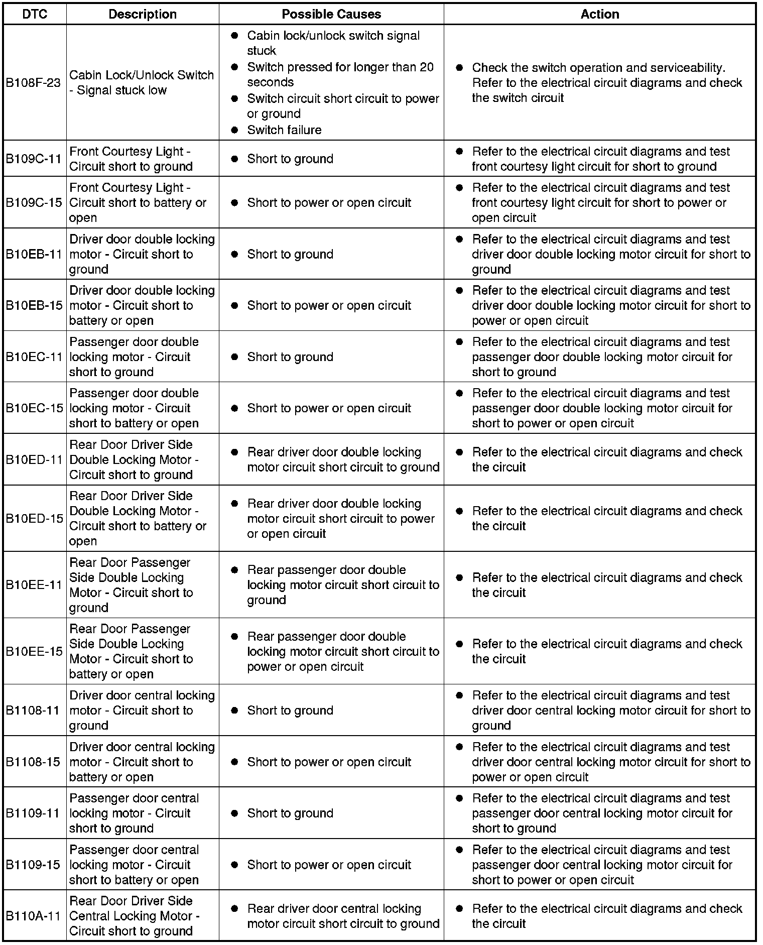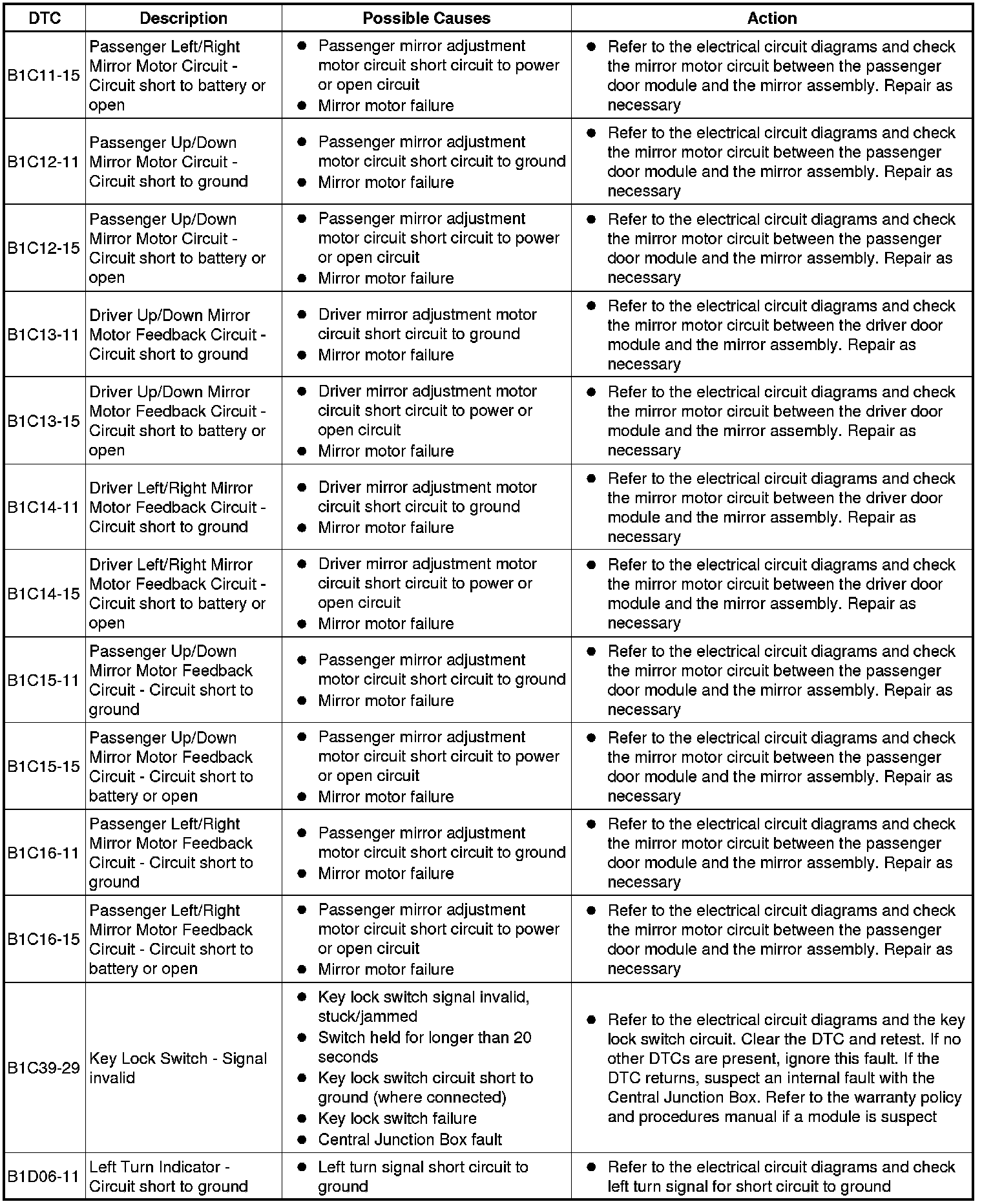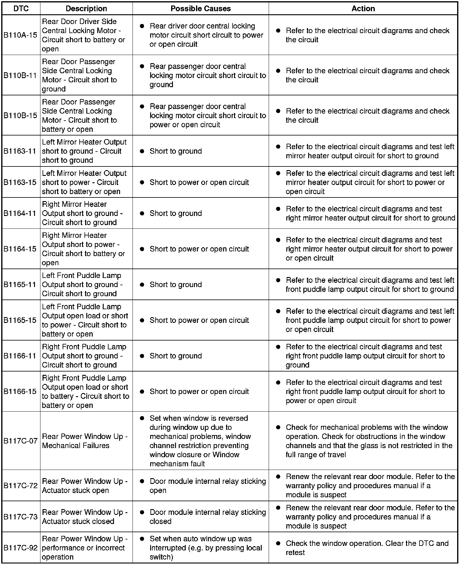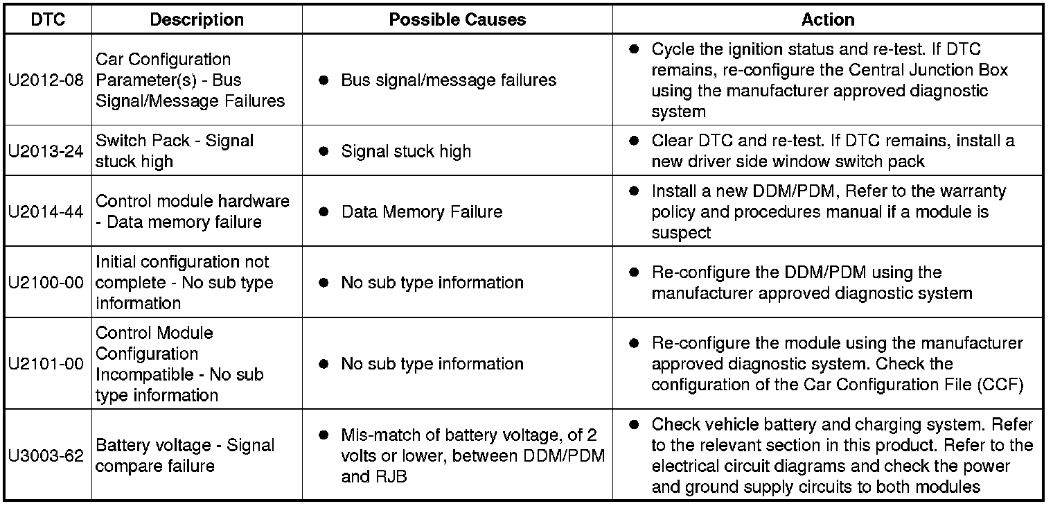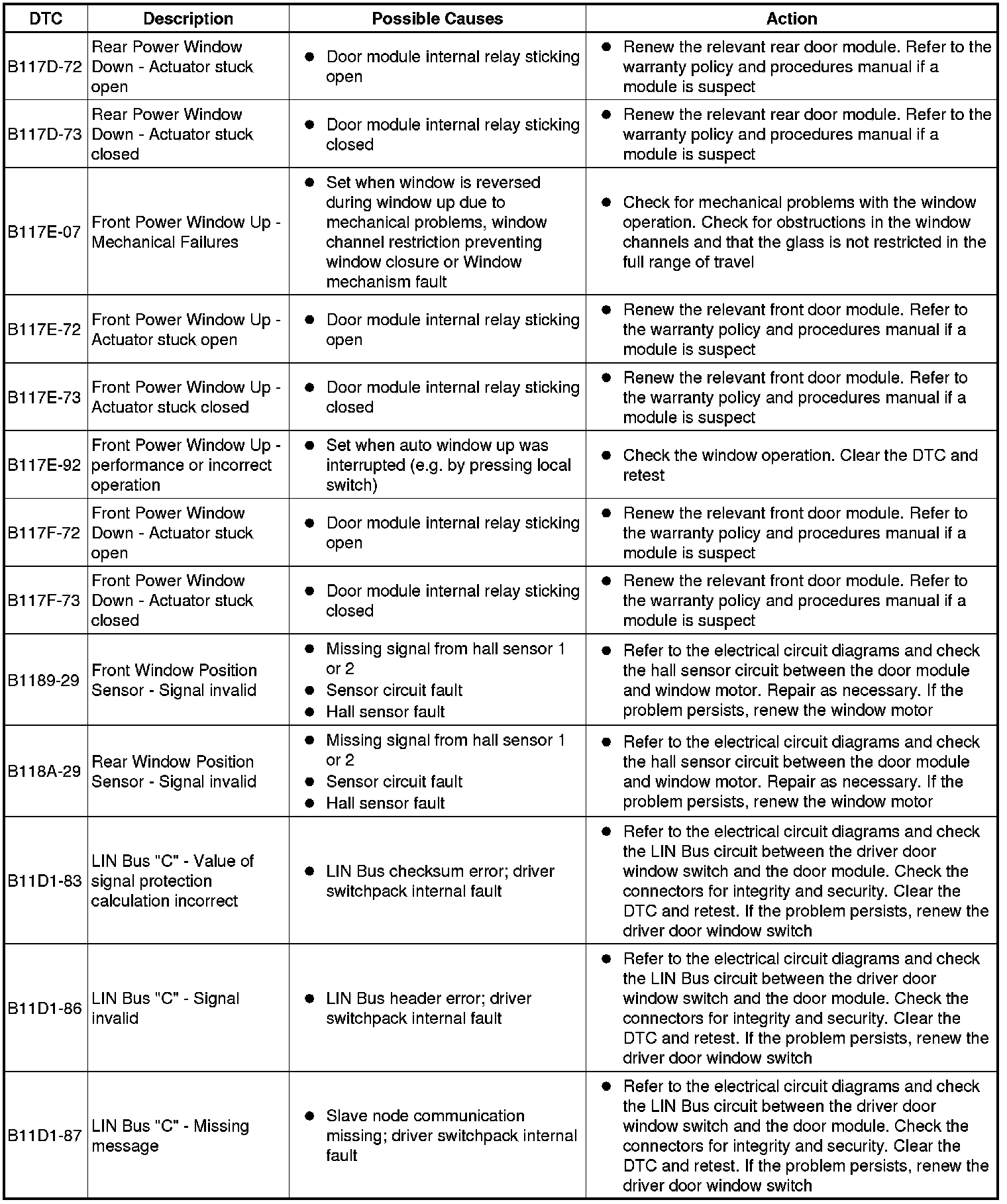 The table below lists all diagnostic trouble codes (DTCs) that could be logged in the driver/passenger door modules, for additional information refer to the relevant description and operation section. For additional information, refer to Module Controlled Functions