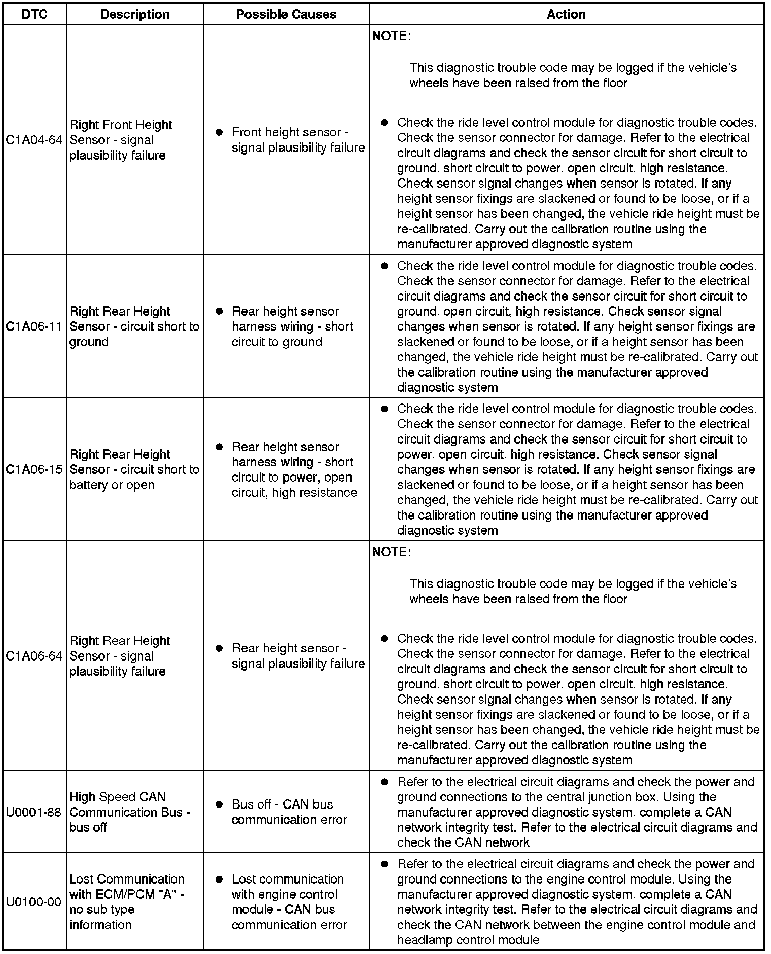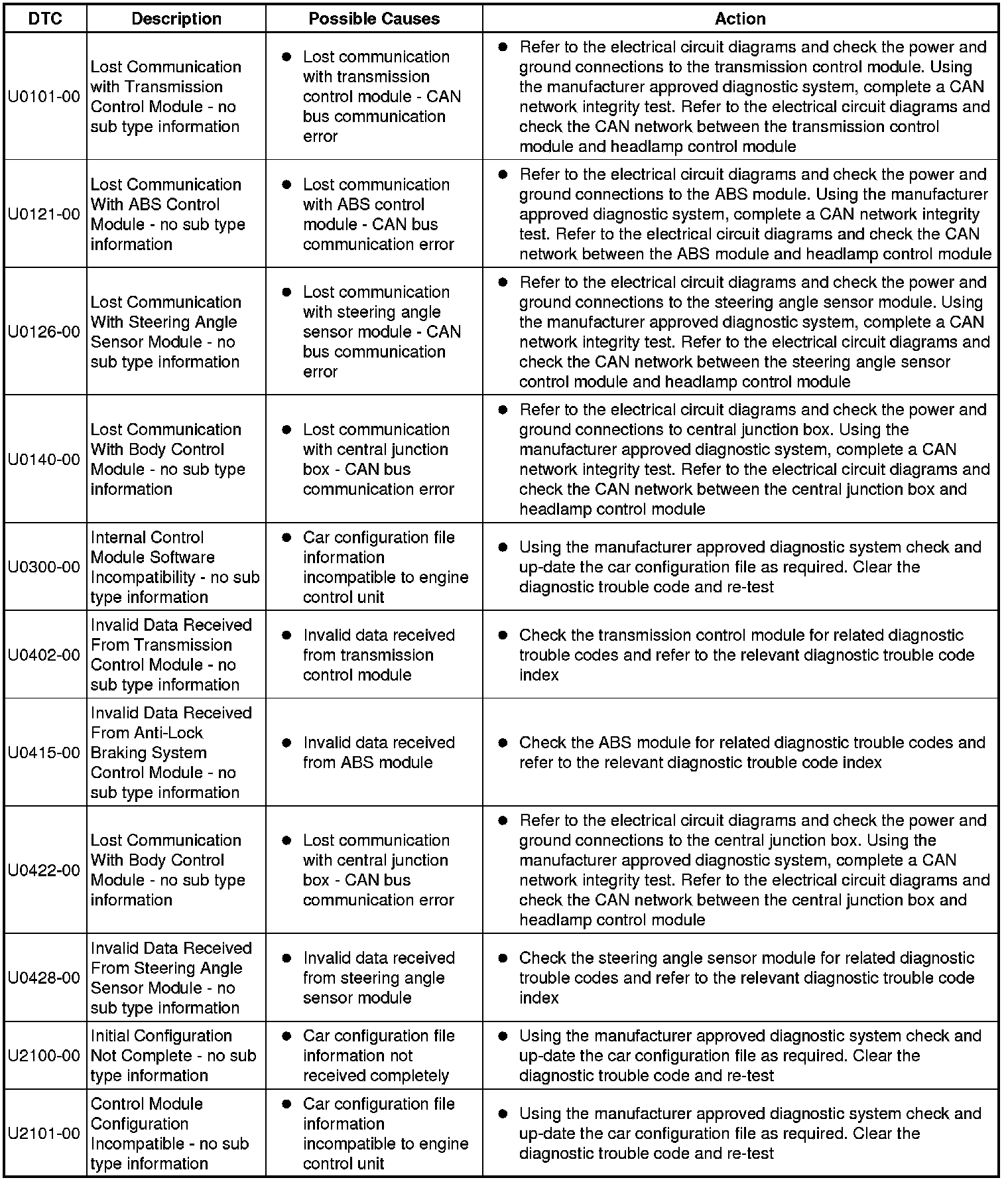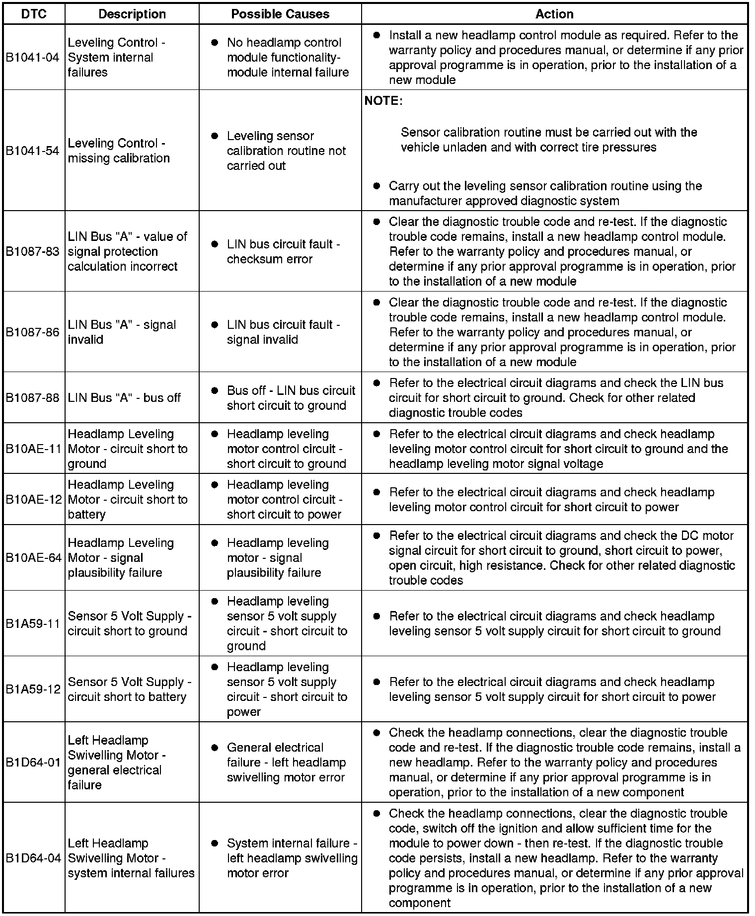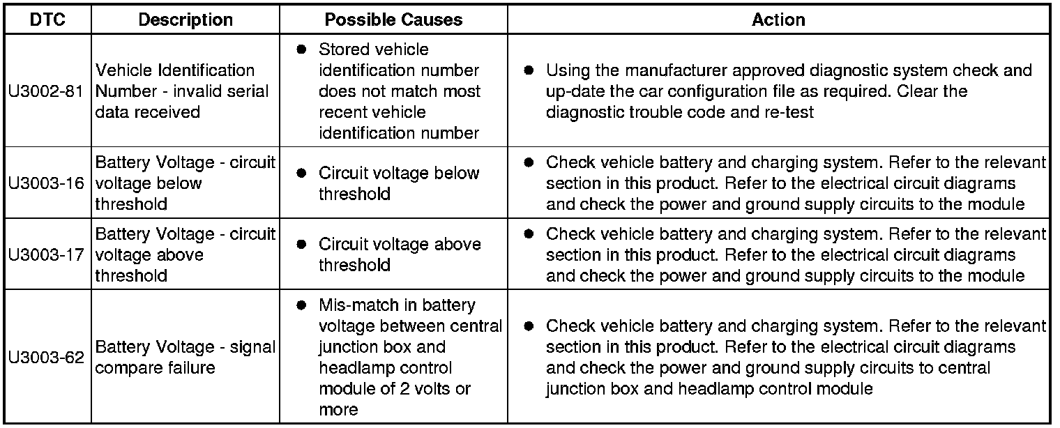 The table below lists all diagnostic trouble codes (DTCs) that could be logged in the headlamp control module, for additional diagnosis and testing information refer to the relevant diagnosis and testing section. For additional information, refer to Headlamps