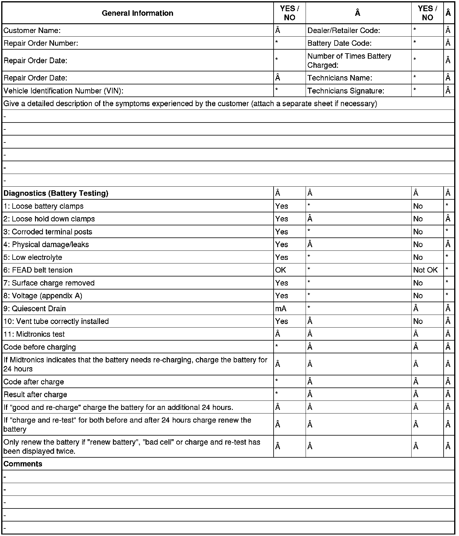 4. Enter the readings and test code obtained on the Battery Report Form (Appendix B) or equivalent which records as a minimum the technician's name, Vehicle Identification Number (VIN), Date of check, Midtronics code and Battery Voltage from the Midtronics tester.