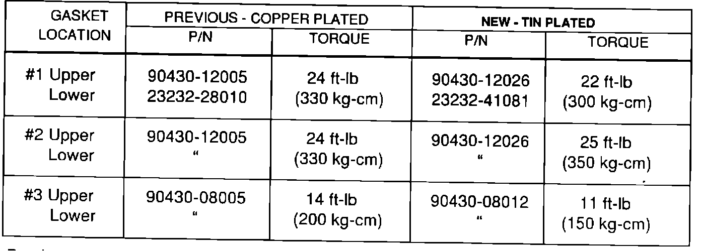 The following new gasket kits include tin-plated fuel line gaskets. The revised torque specifications must be used whenever the tin-plated fuel line gasket is used.