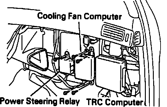 Fig. 38 Cooling Fan Computer, Power Steering Relay & TRC Computer Locations: