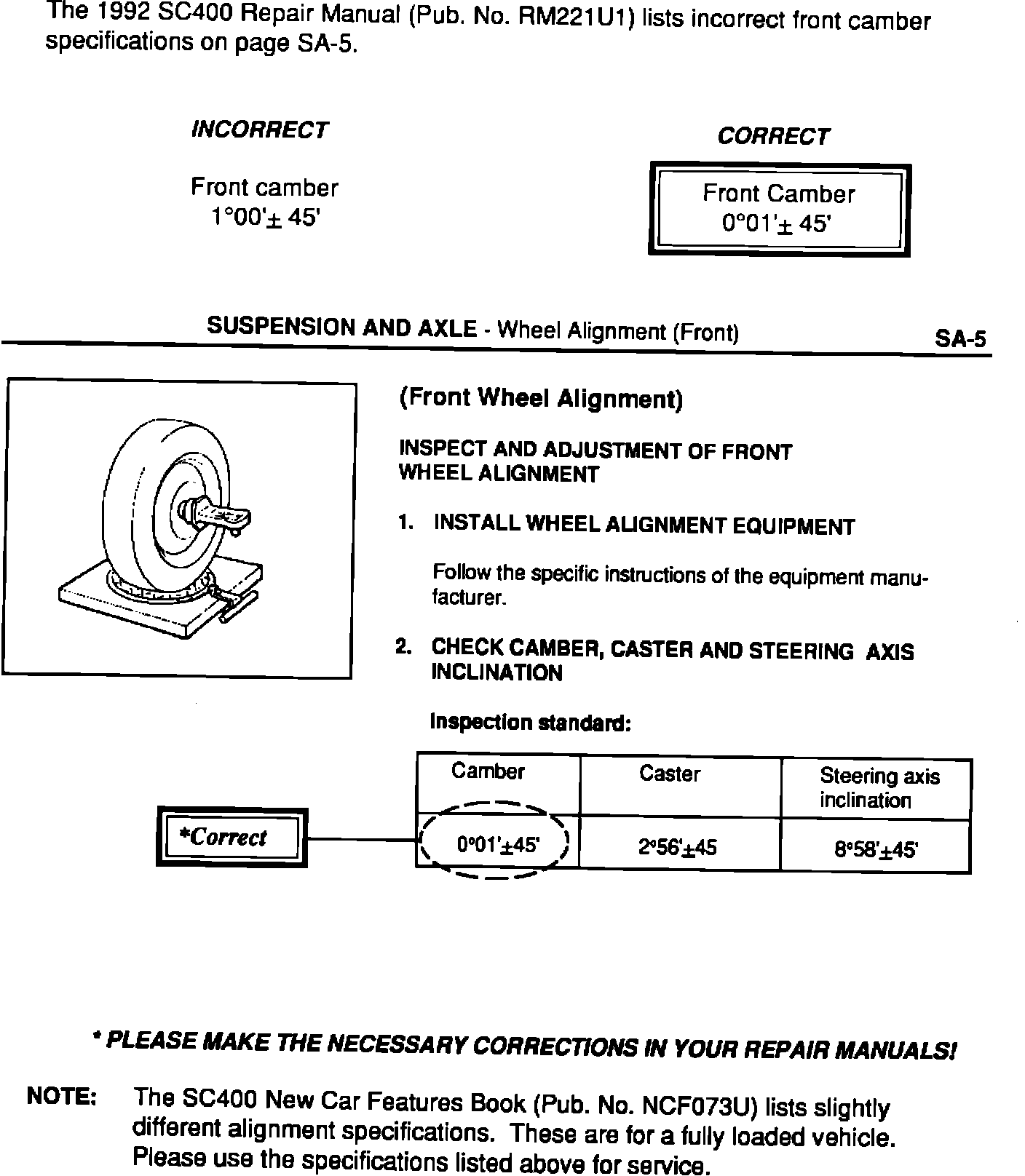 Title SC400 REPAIR MANUAL CORRECTION - ALIGNMENT SPECIFICATIONS